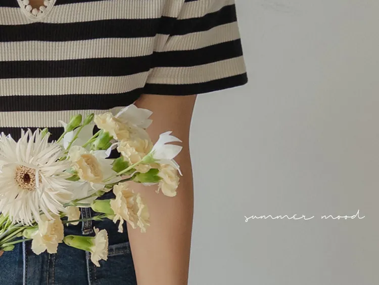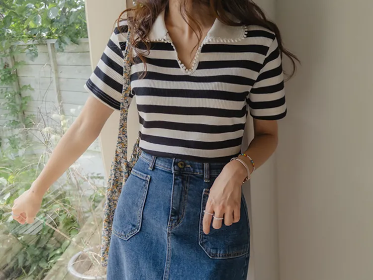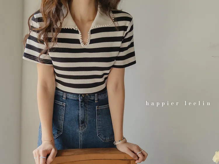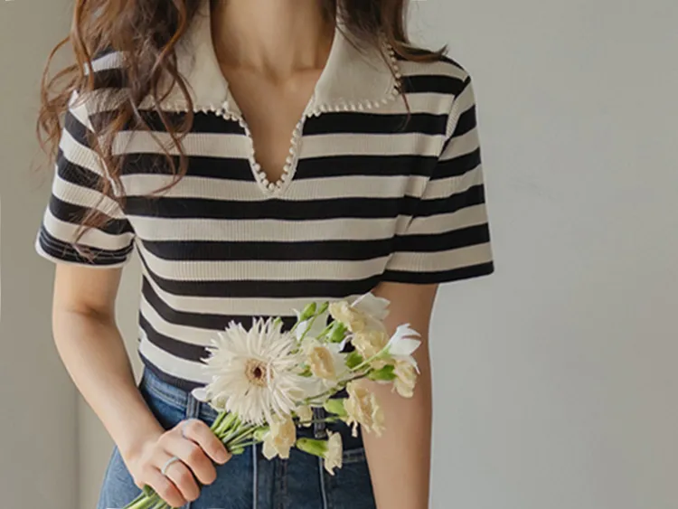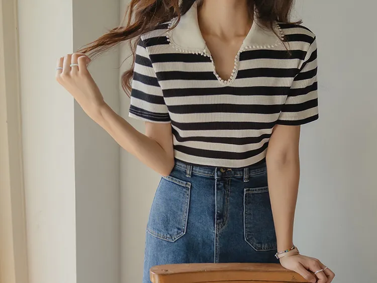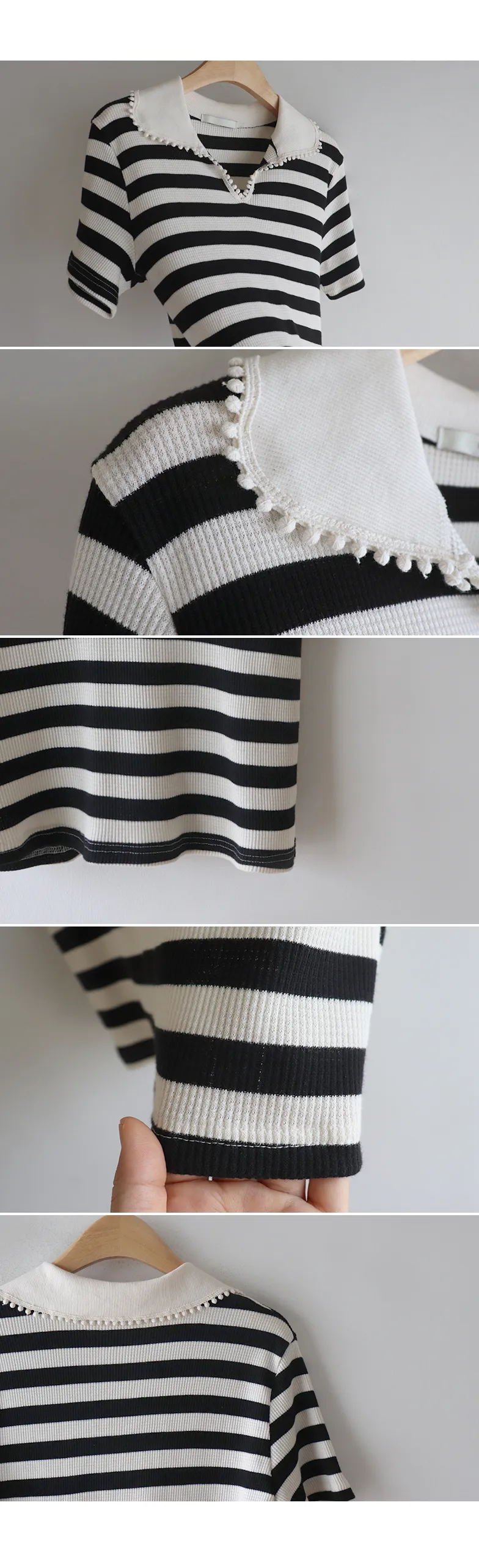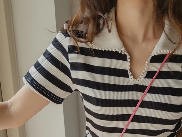 [圓形~可愛的蕾絲領點上衣! ] [領子和V領細節的絲滑氣氛] [條紋和半修身版型,讓你的身體線條看起來苗條] [華夫格編織超彈力,很舒服]