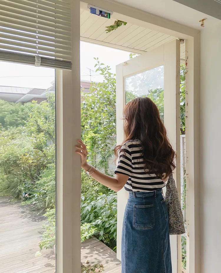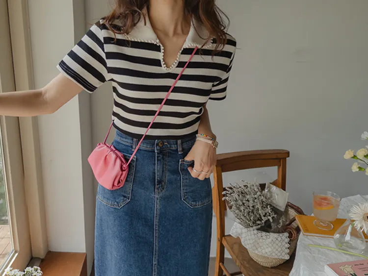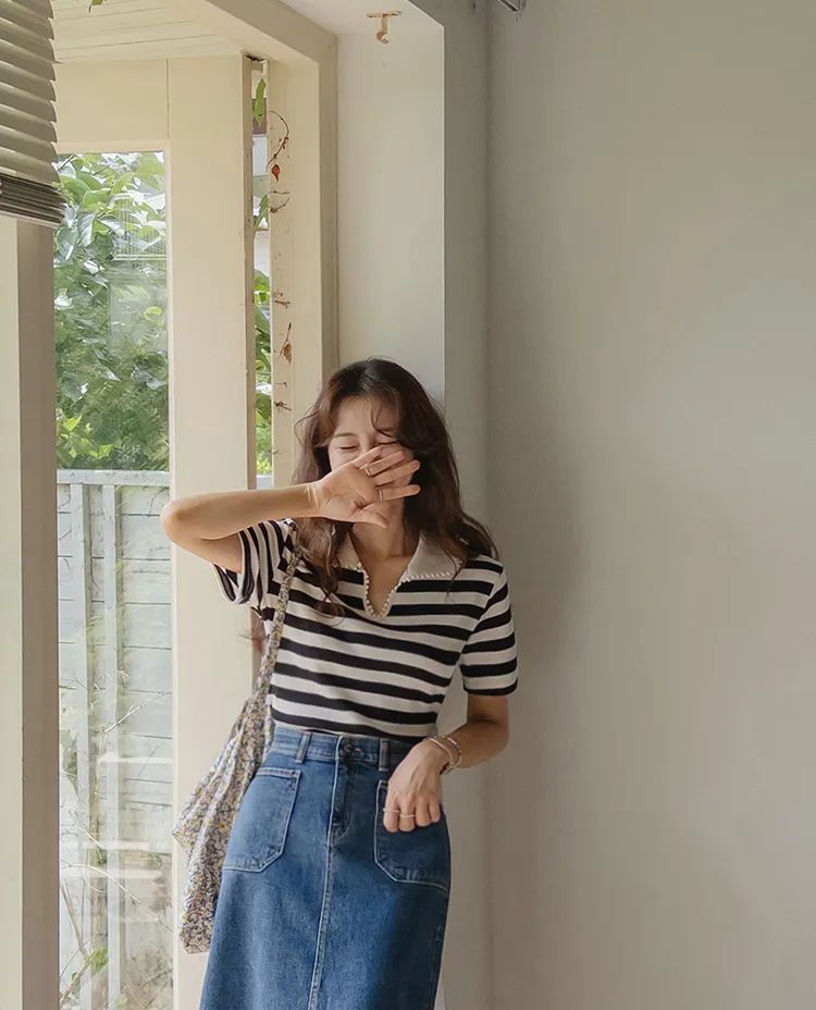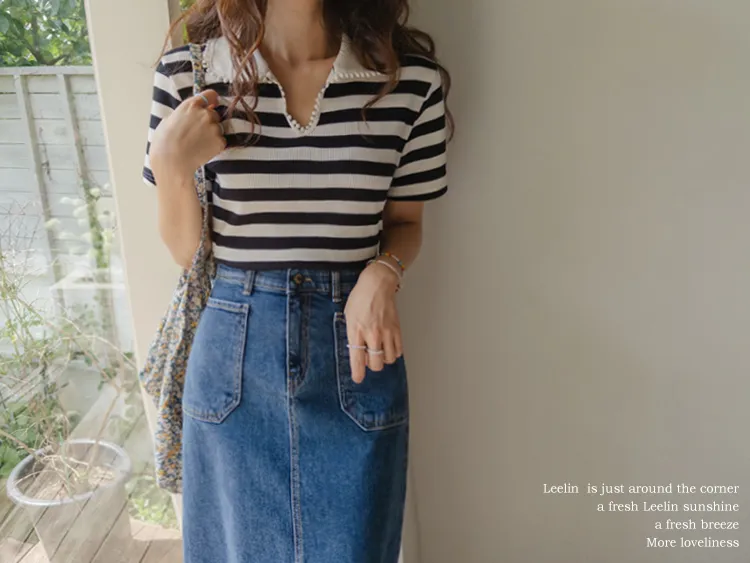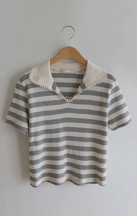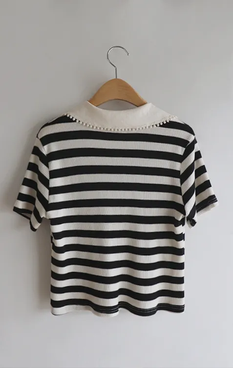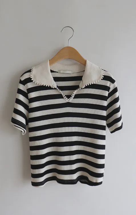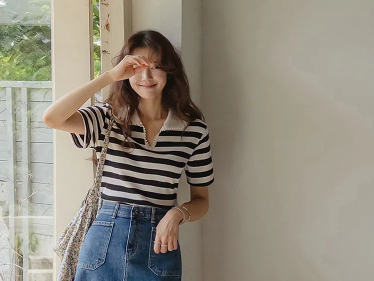 [圓形~可愛的蕾絲領點上衣! ] [領子和V領細節的絲滑氣氛] [條紋和半修身版型,讓你的身體線條看起來苗條] [華夫格編織超彈力,很舒服]