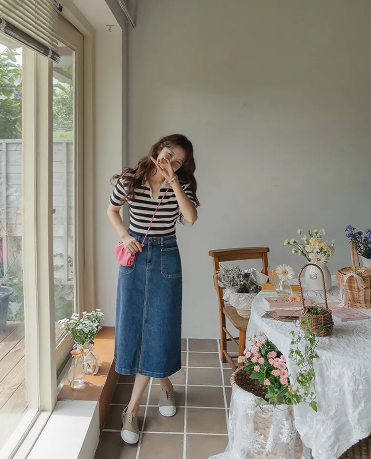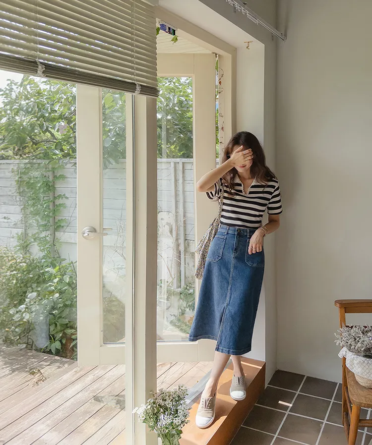 獨特前口袋設計H剪裁前開衩牛仔中長裙