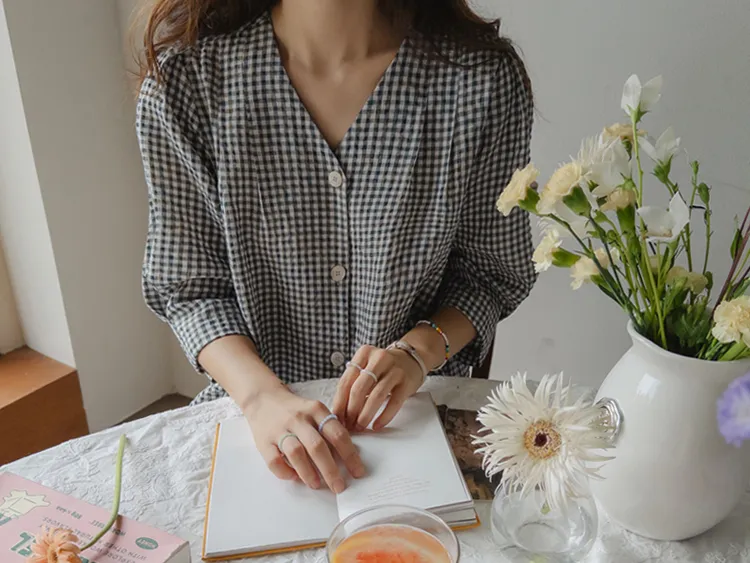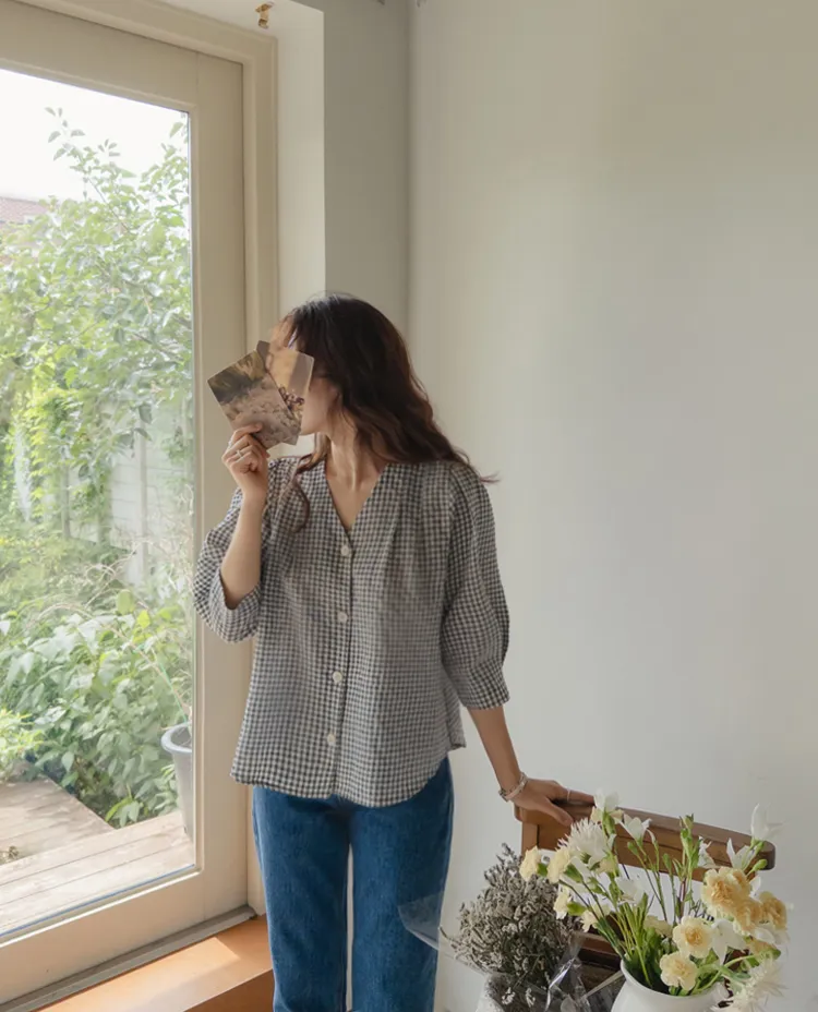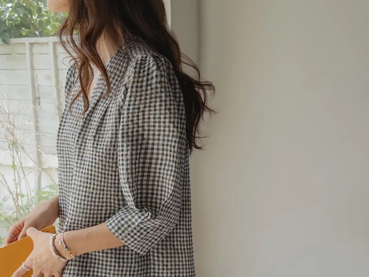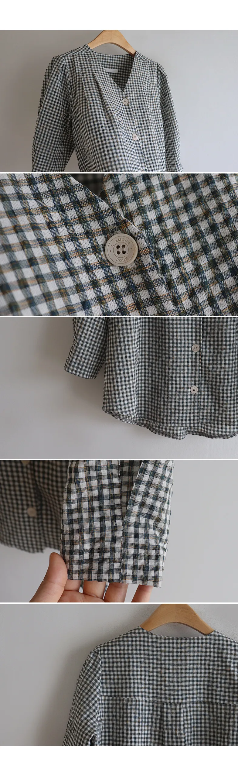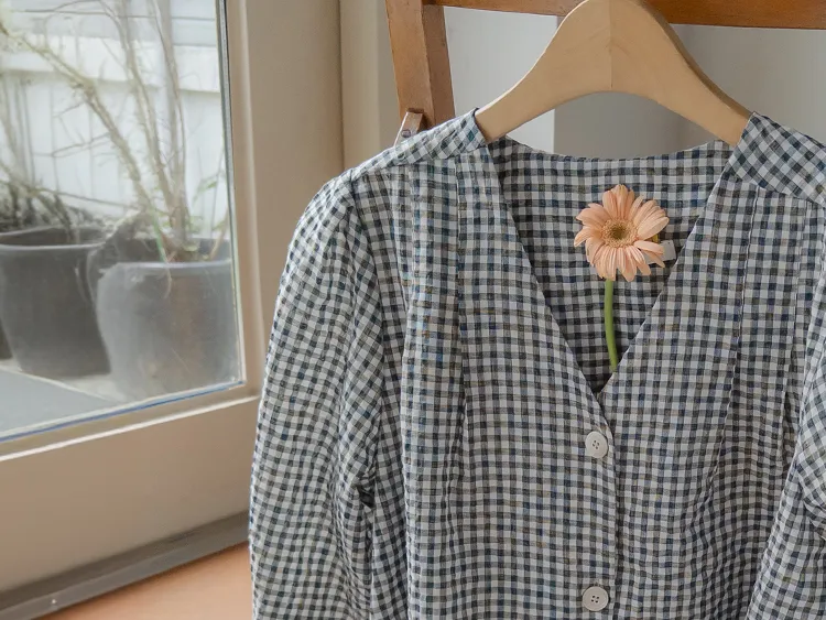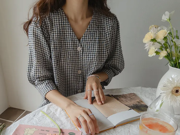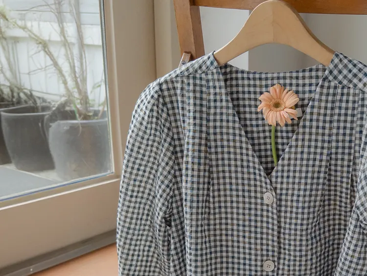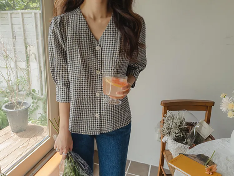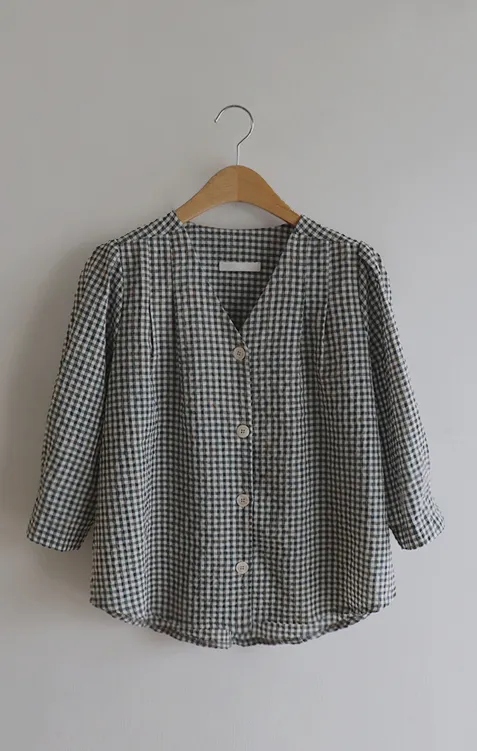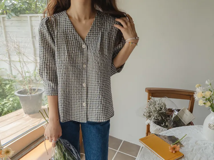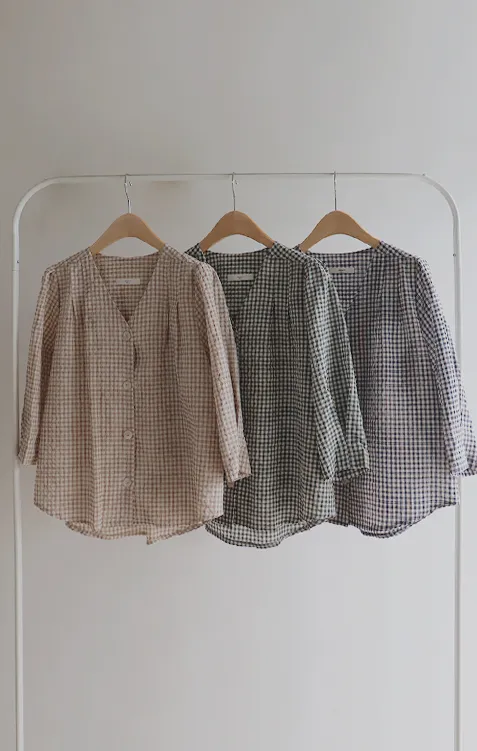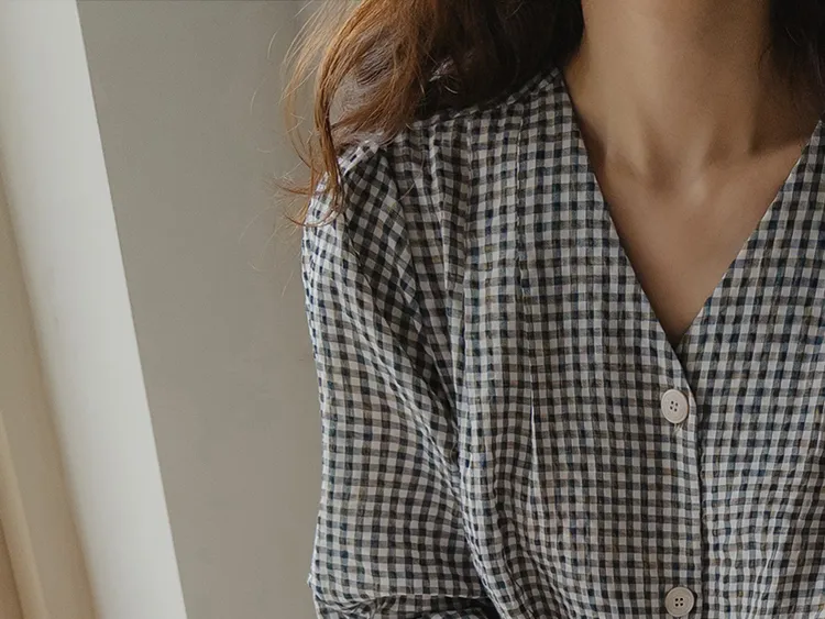 [V領排扣上衣♥,引人注目的色感格紋][觸感舒適][從夏季到中期都很適合使用! ][V領設計增強了女性氣質]