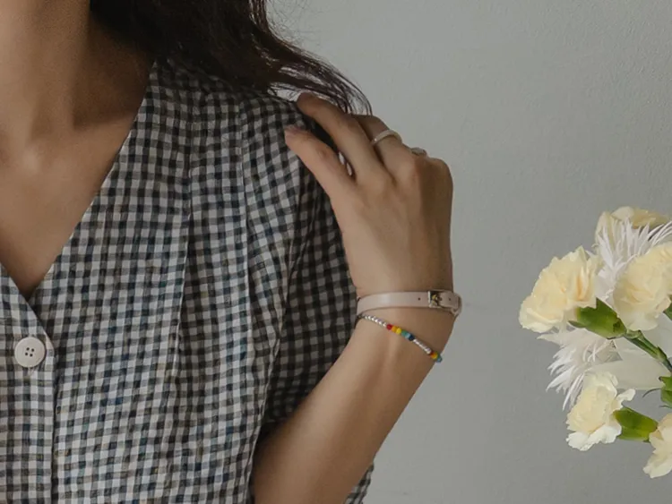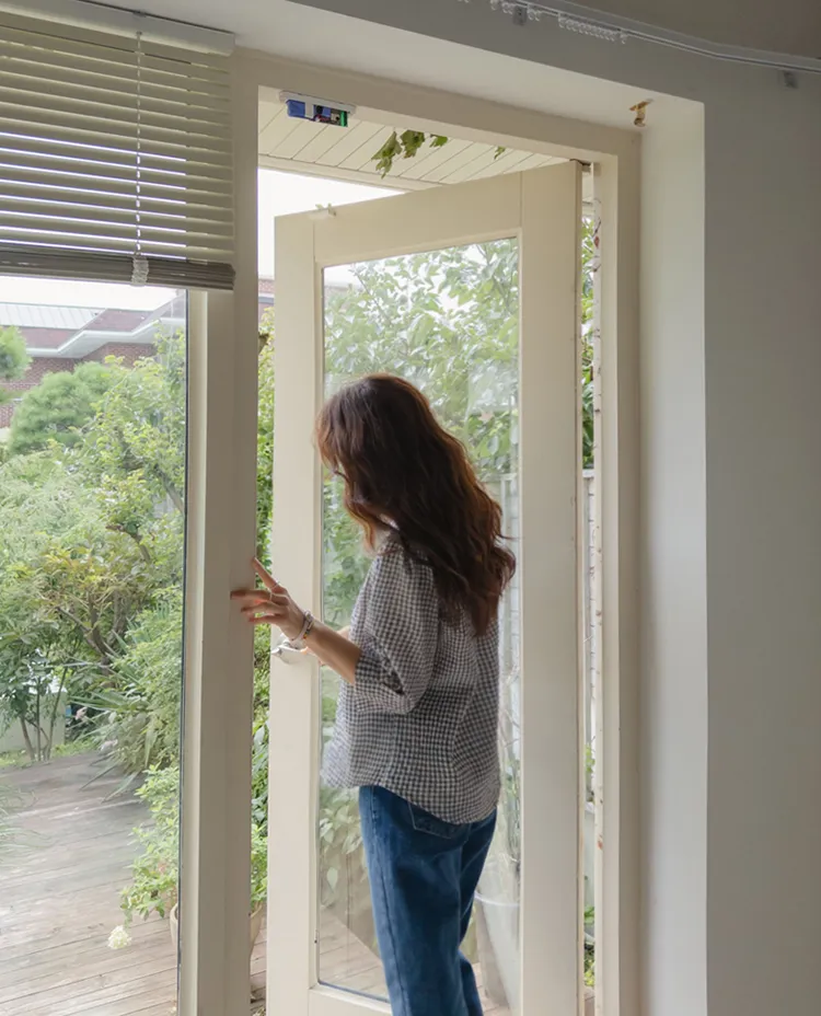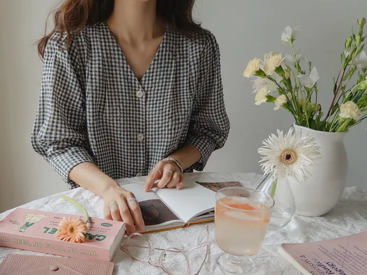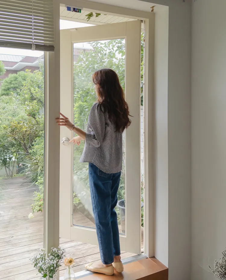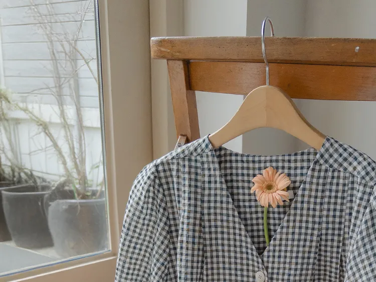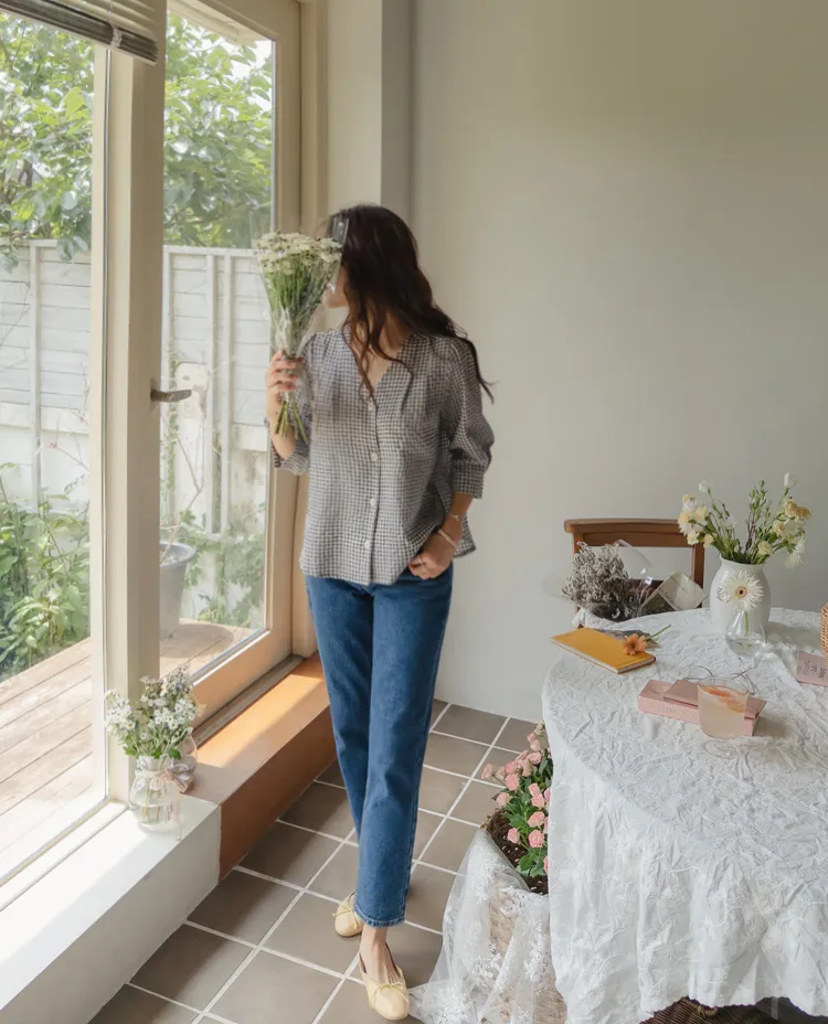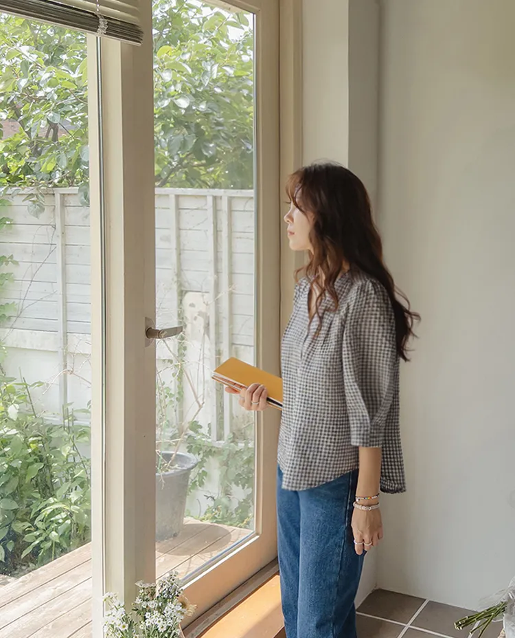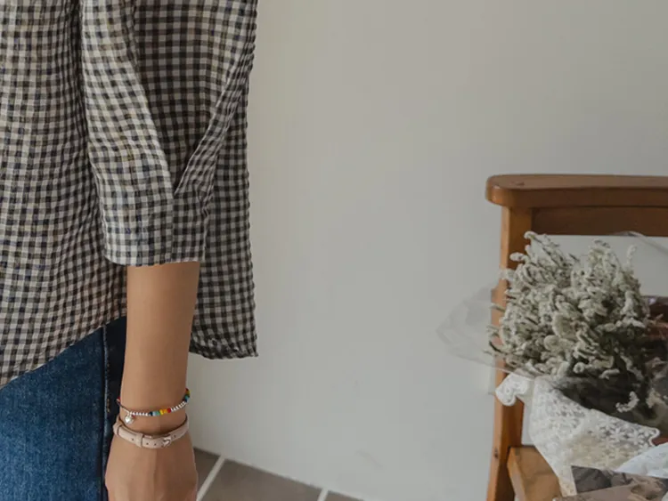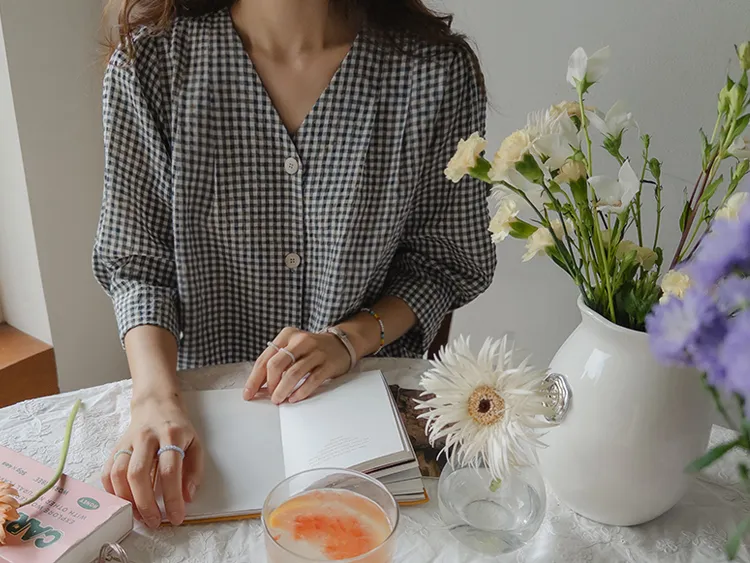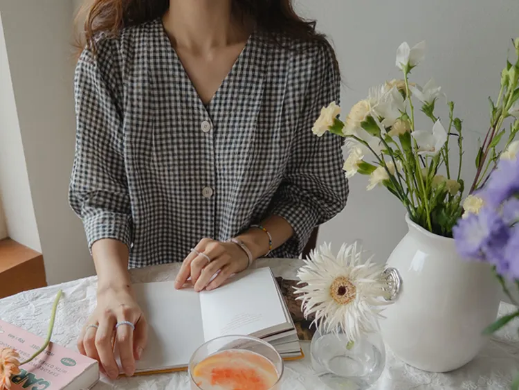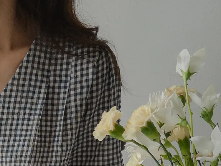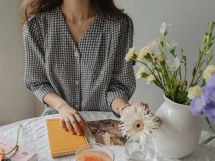 [V領排扣上衣♥,引人注目的色感格紋][觸感舒適][從夏季到中期都很適合使用! ][V領設計增強了女性氣質]