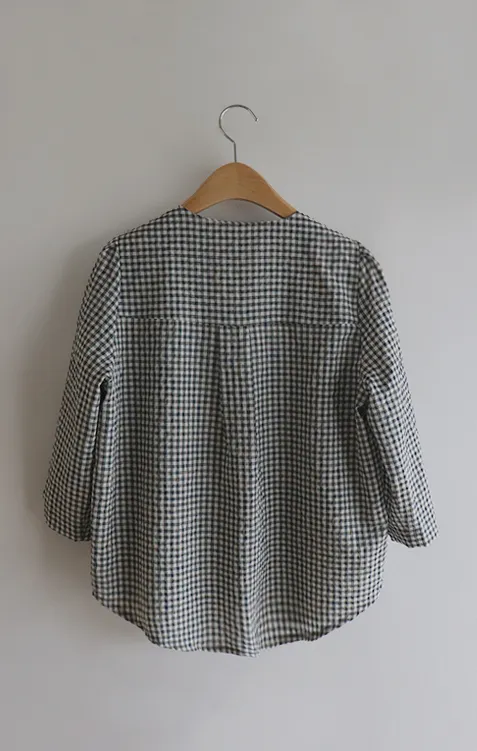 肩線袖末針摺V領色感格紋排扣上衣