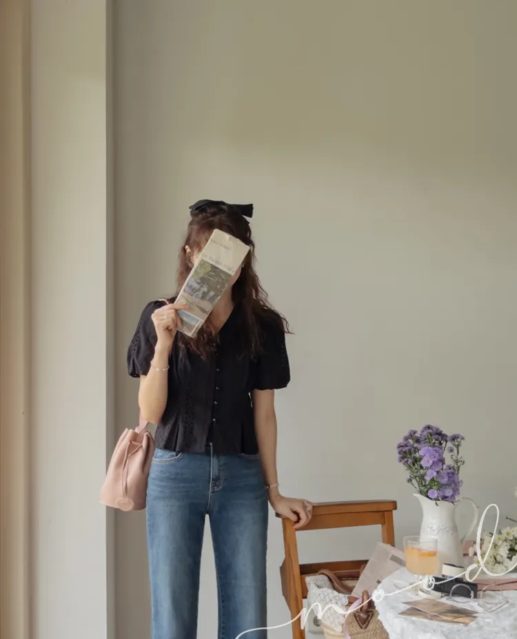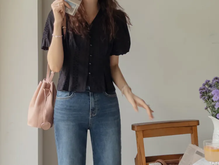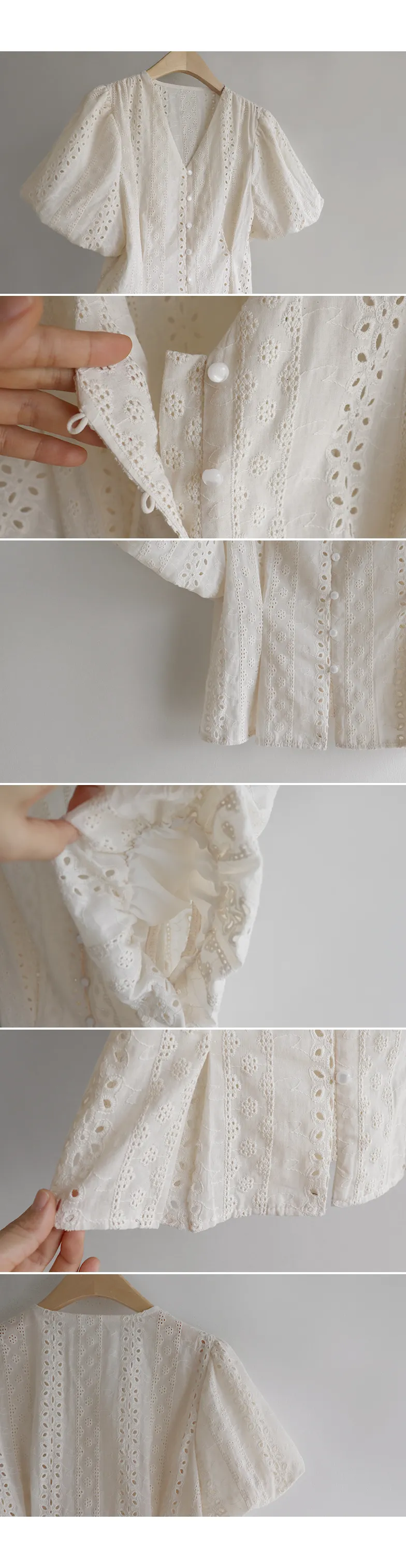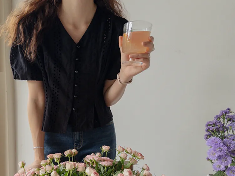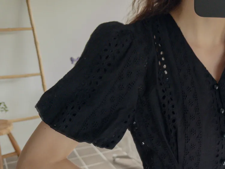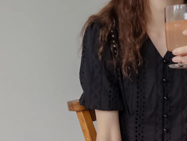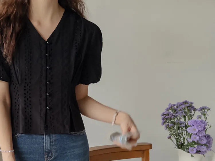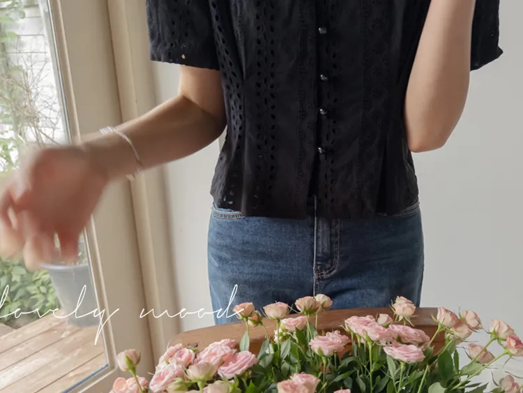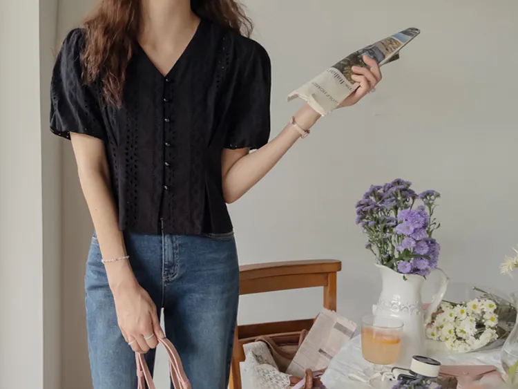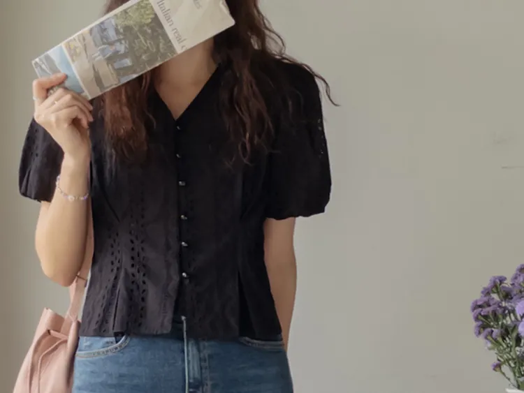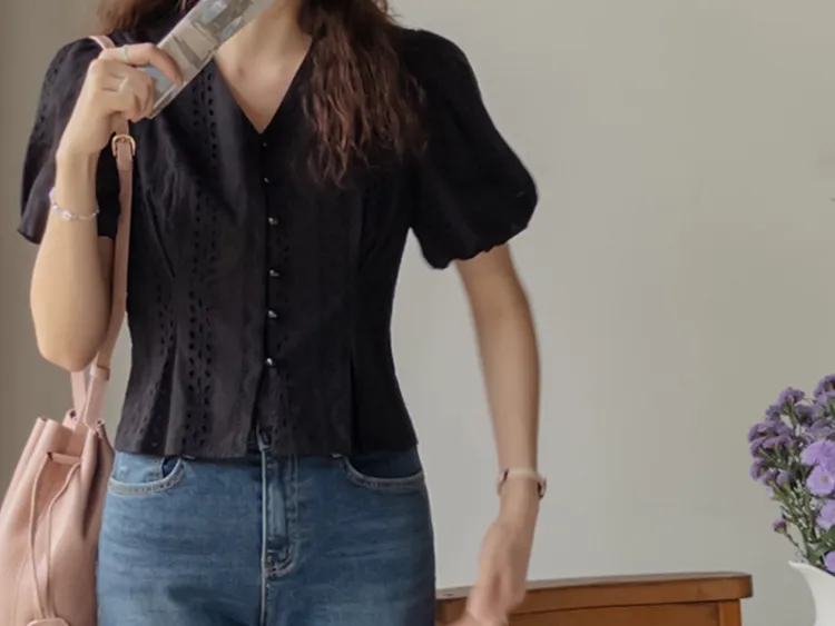 浪漫蕾絲鏤空花朵針摺腰線排扣上衣