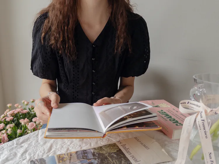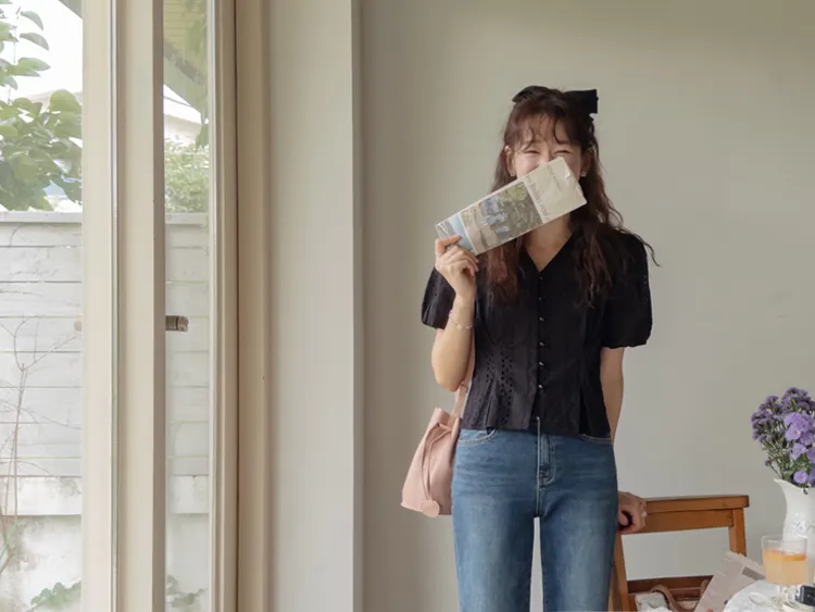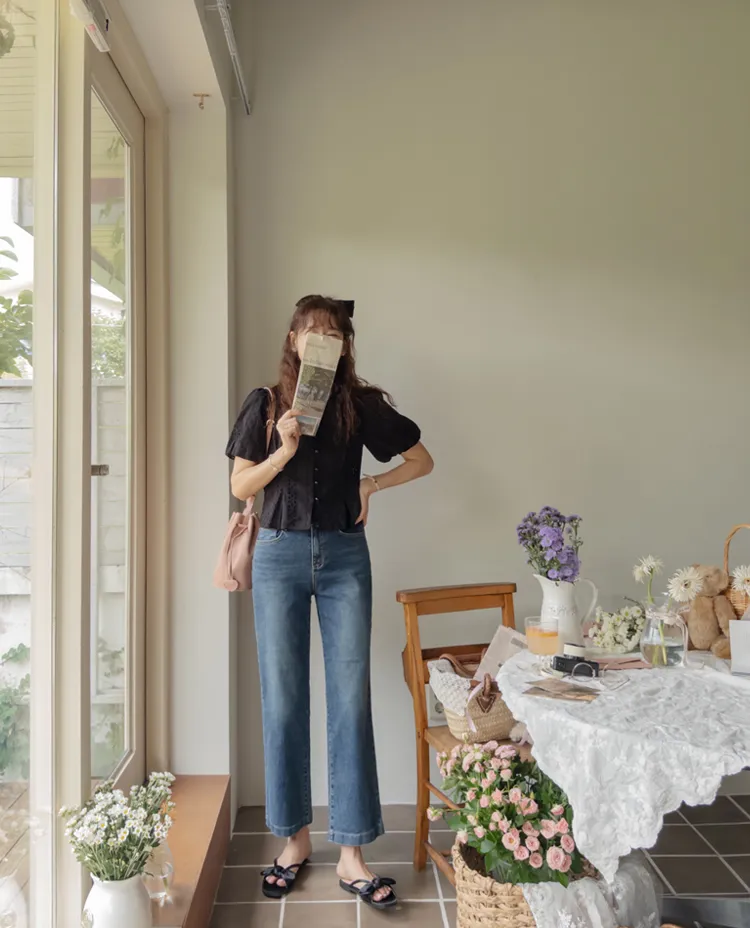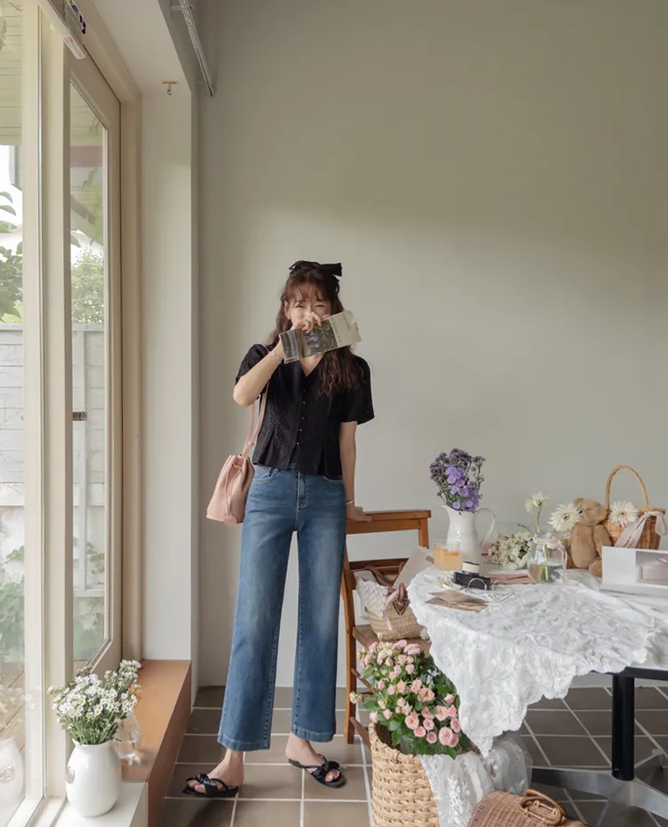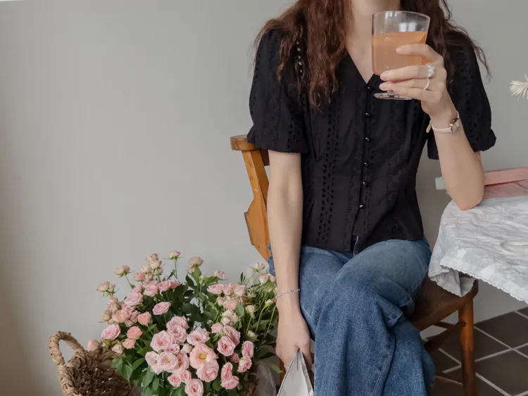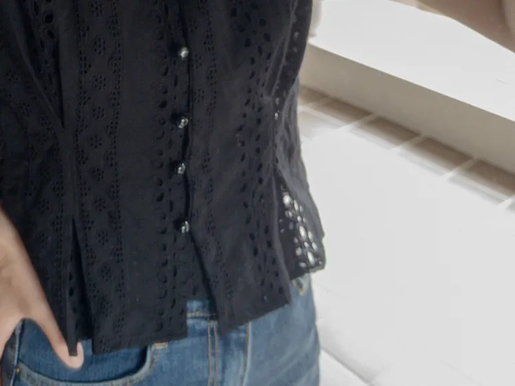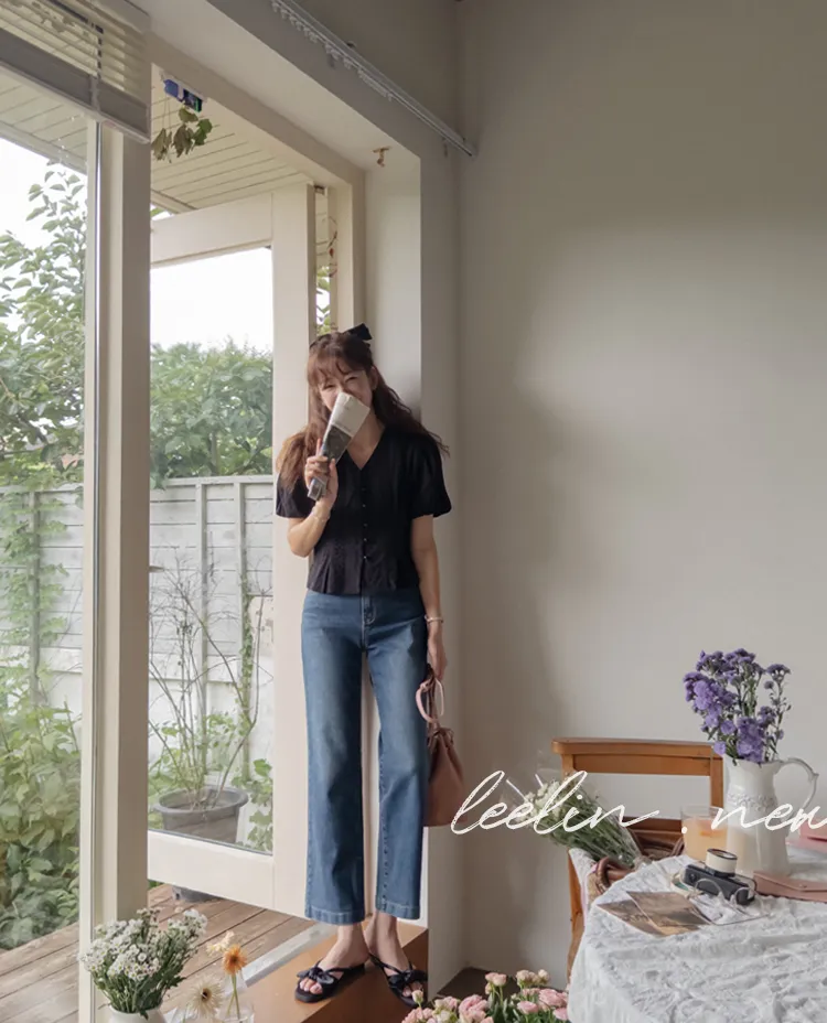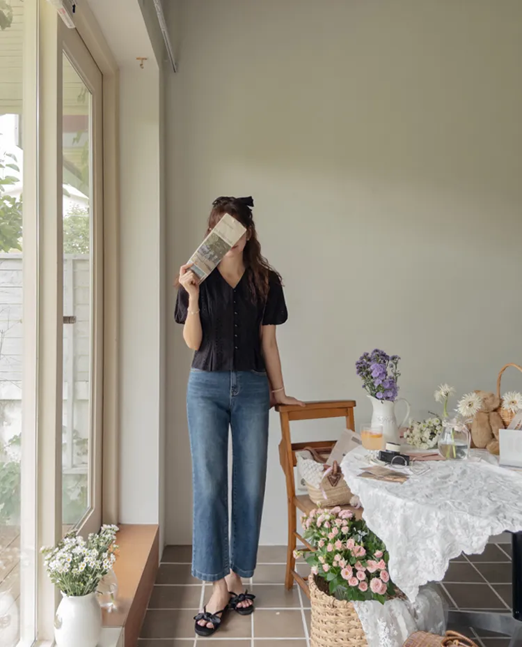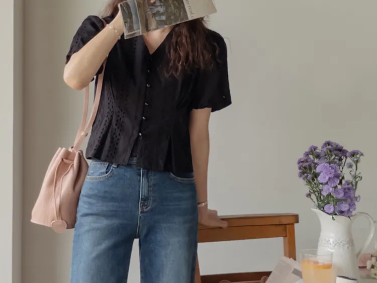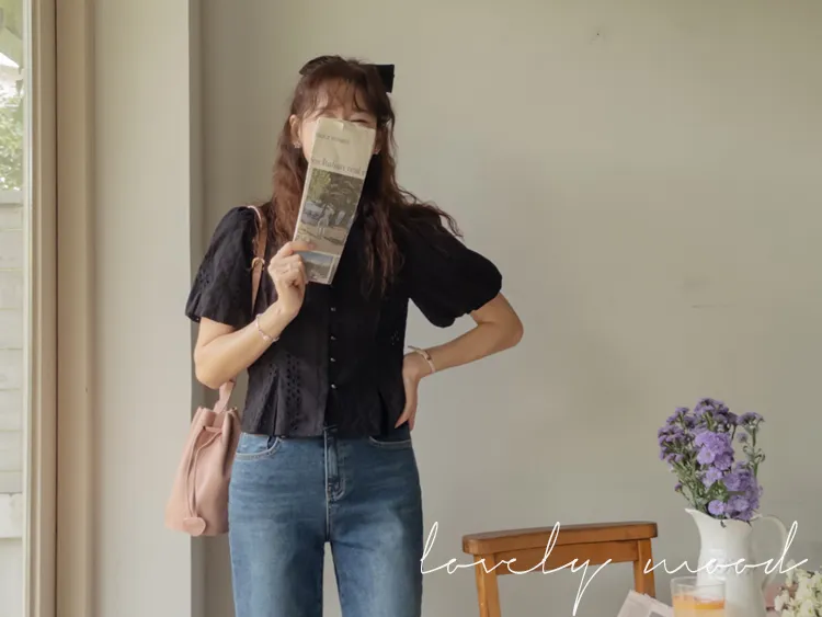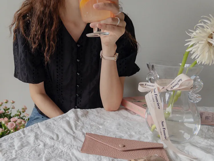 浪漫蕾絲鏤空花朵針摺腰線排扣上衣