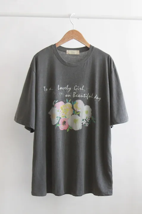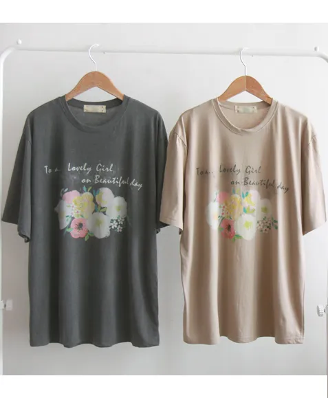 漂亮花朵字母印花修身寬鬆短袖上衣