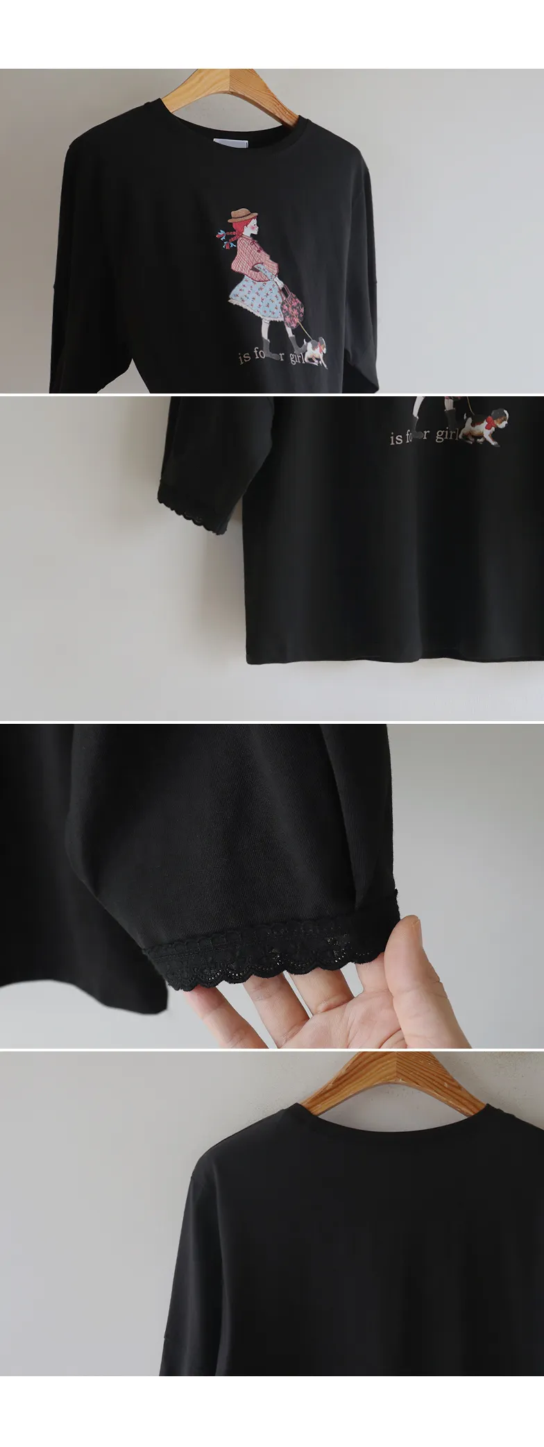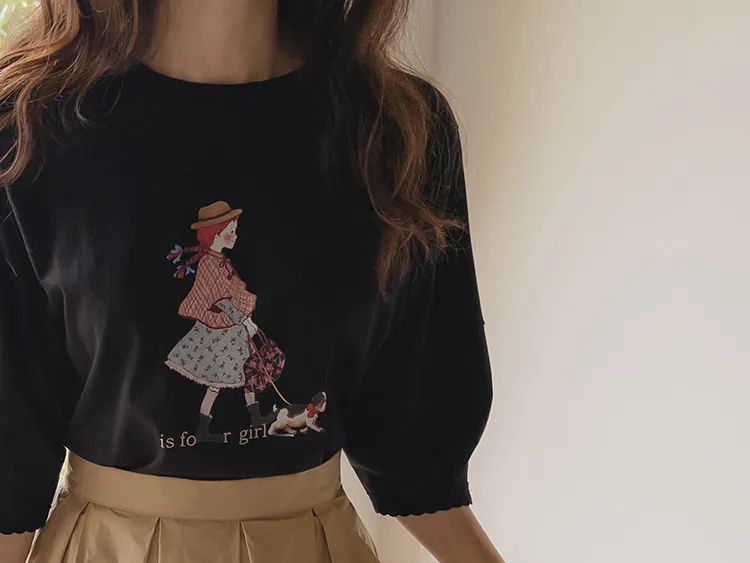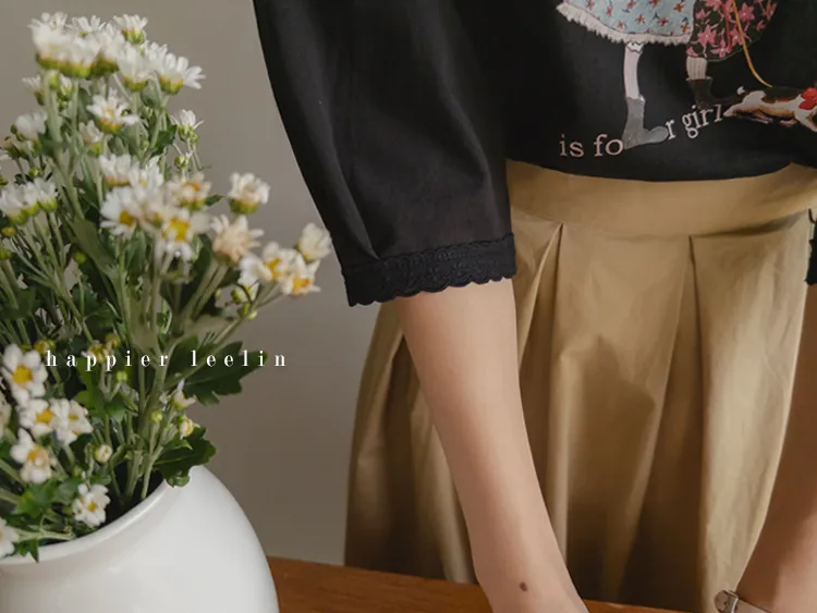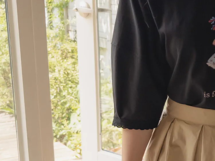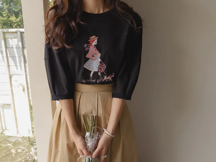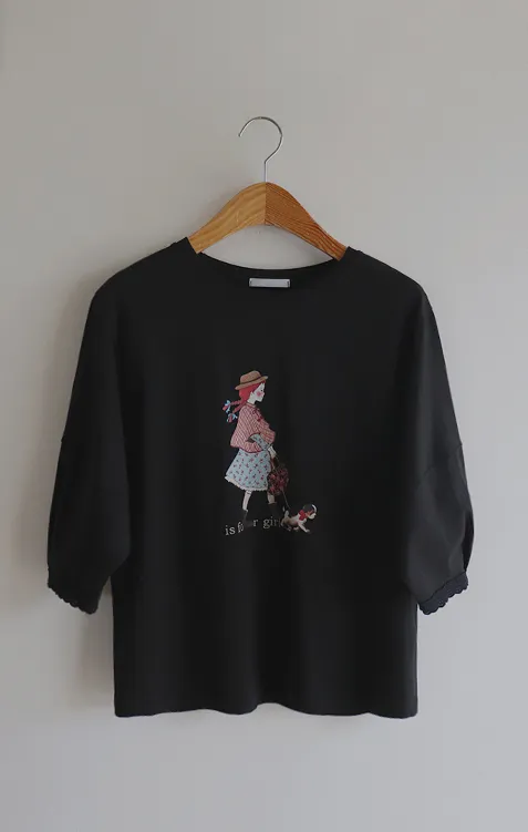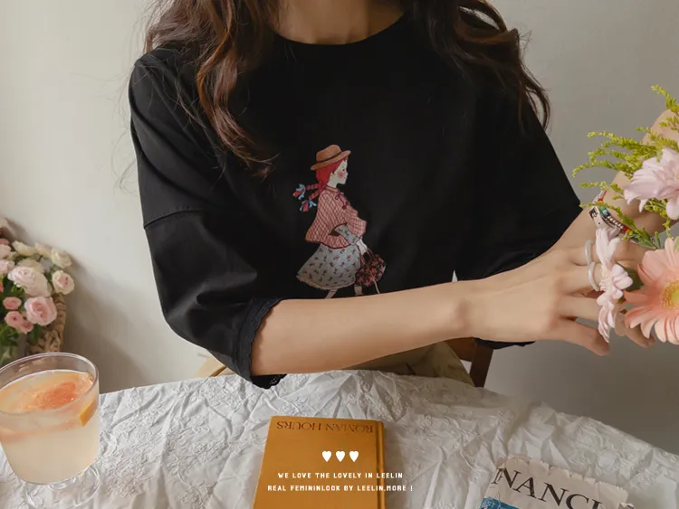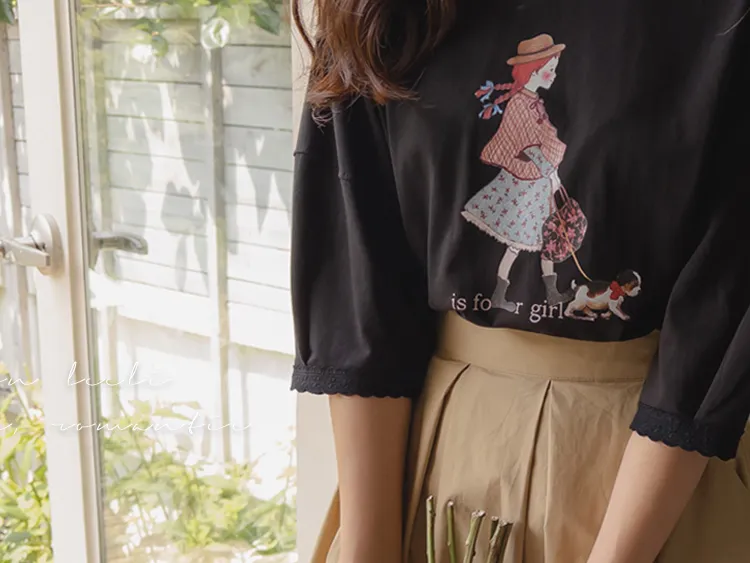 漂亮袖末蕾絲女孩印花上衣