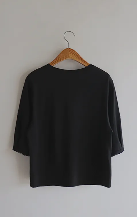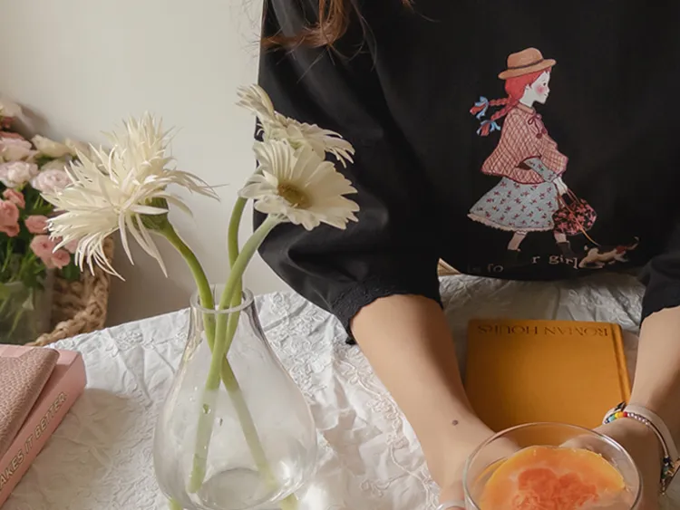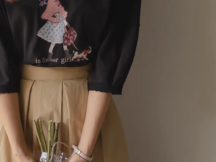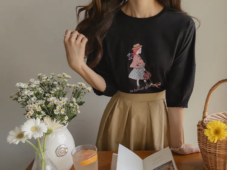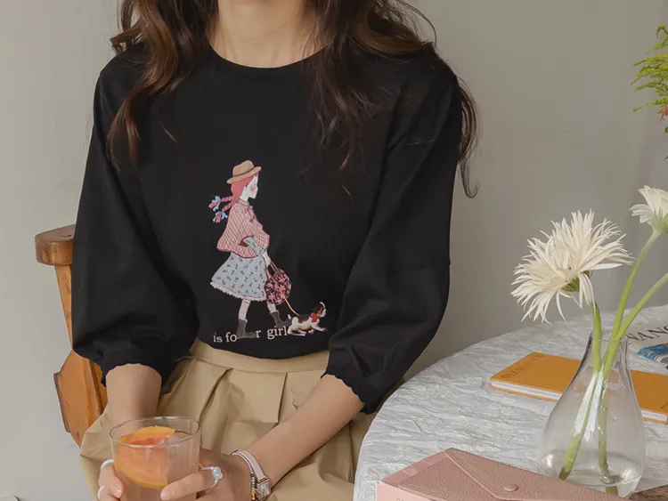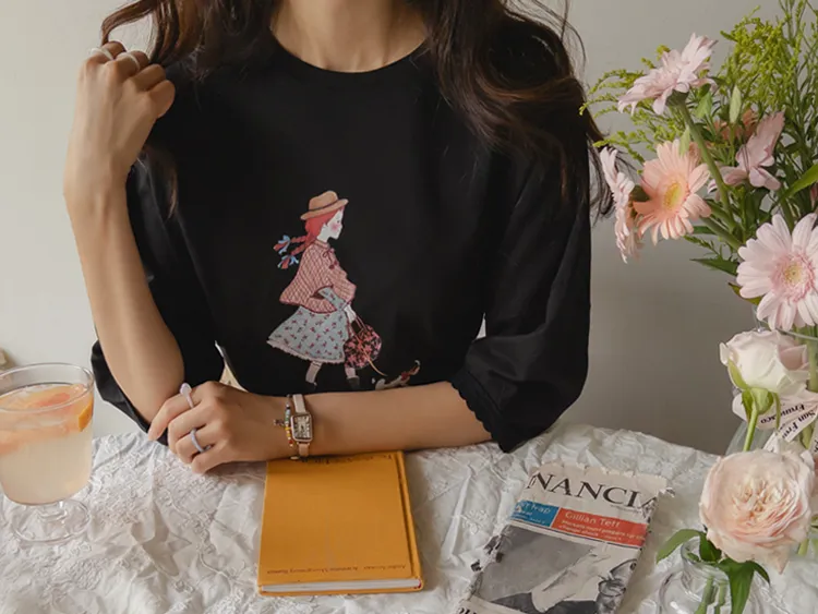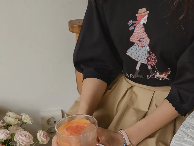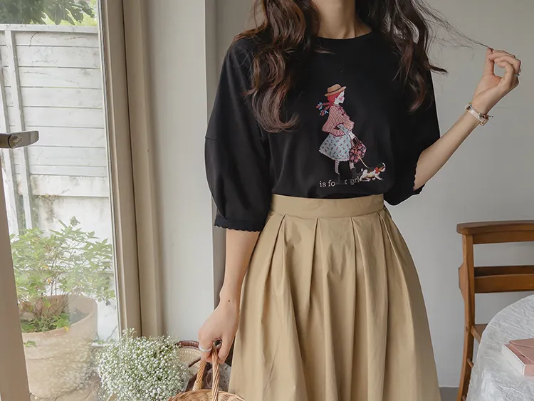 漂亮袖末蕾絲女孩印花上衣