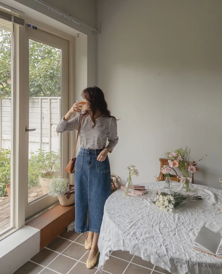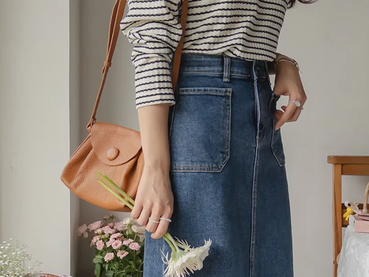 獨特前口袋設計H剪裁前開衩牛仔中長裙