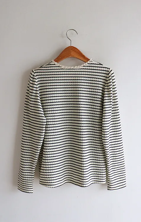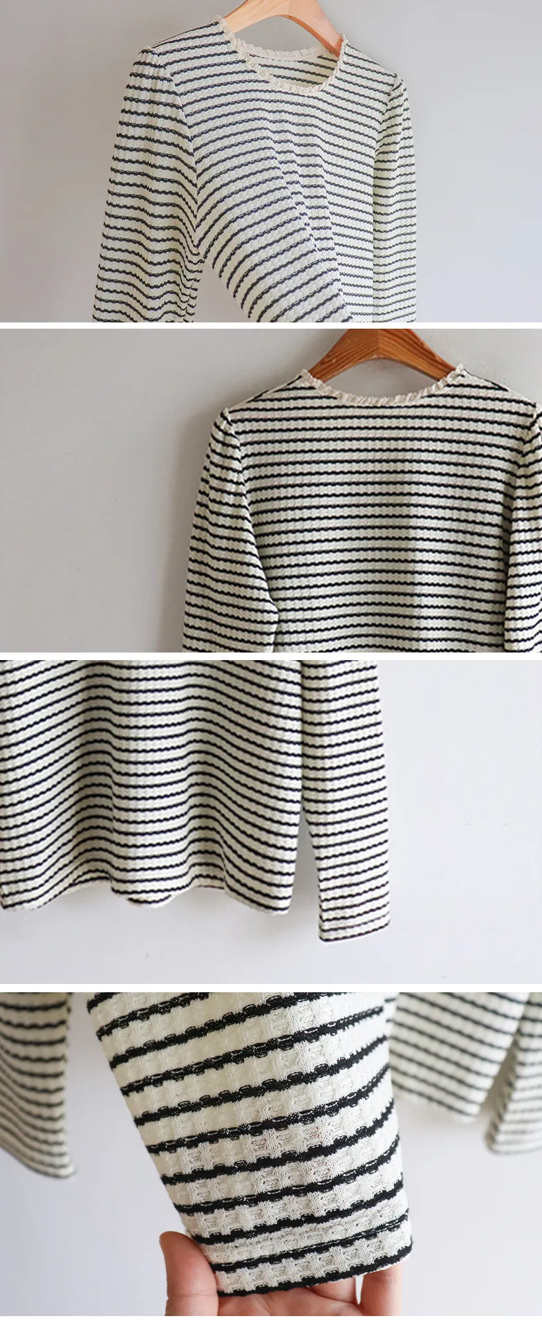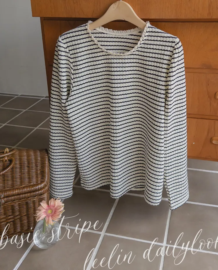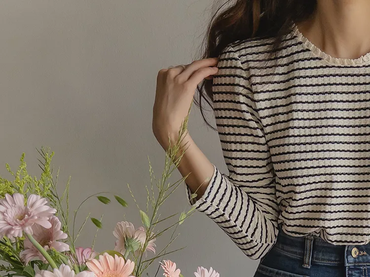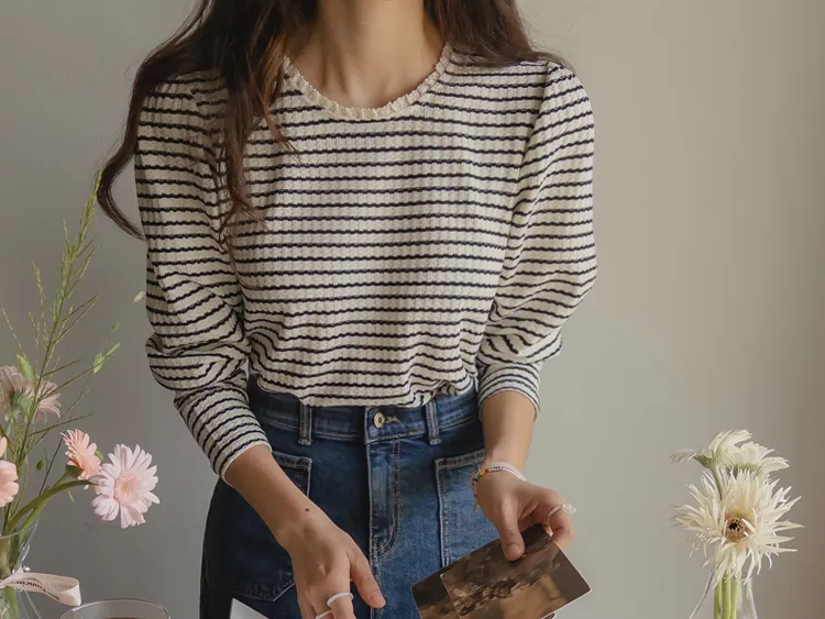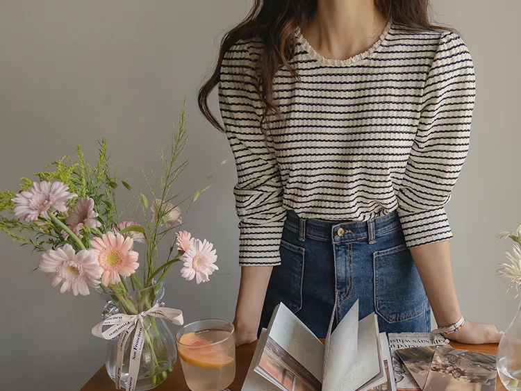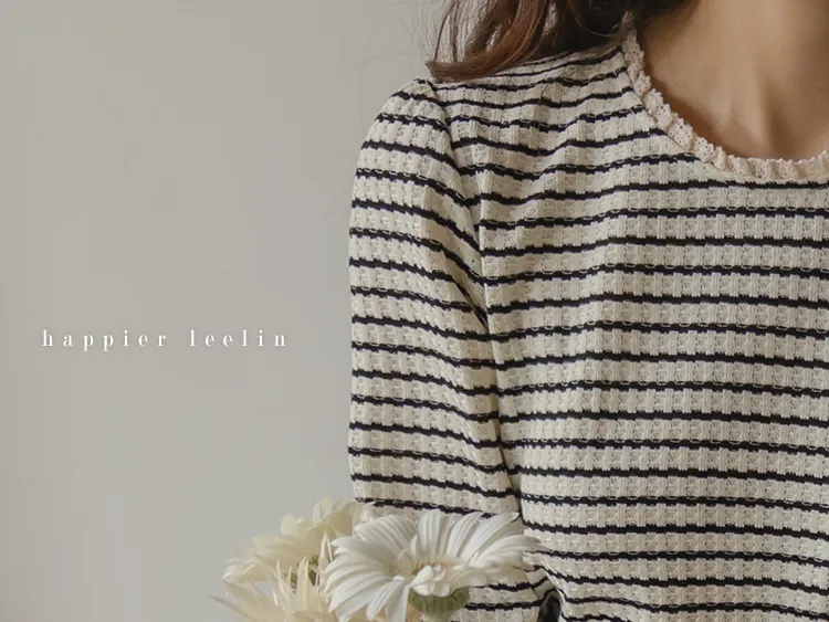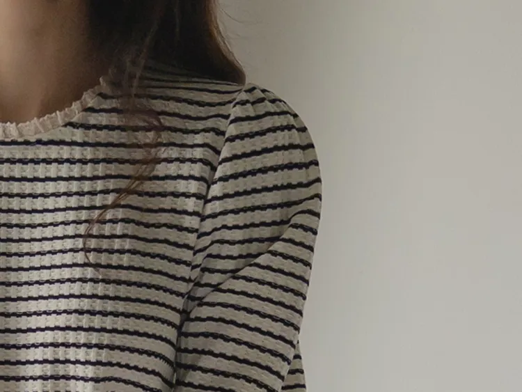 [彈性舒適,2% 氨綸彈性♥] [條紋上衣,領口飾有褶邊細節] [穿著柔軟舒適] [可以搭配任何下裝單品。