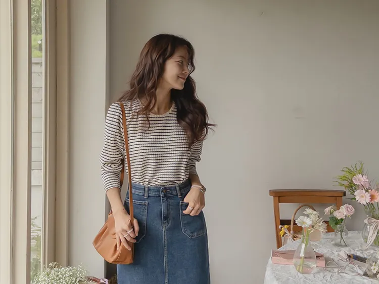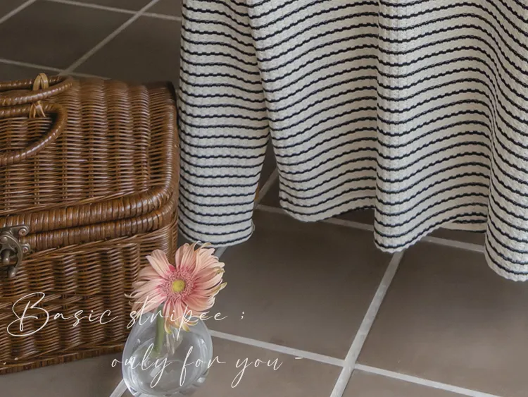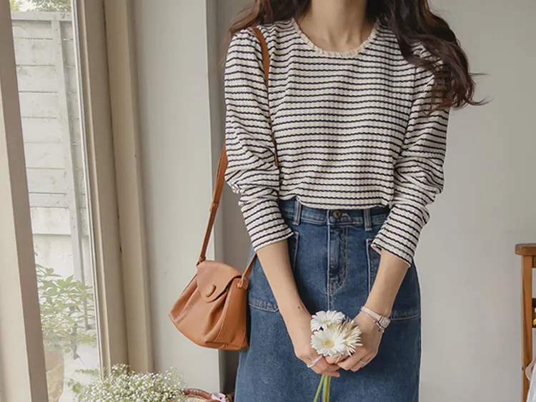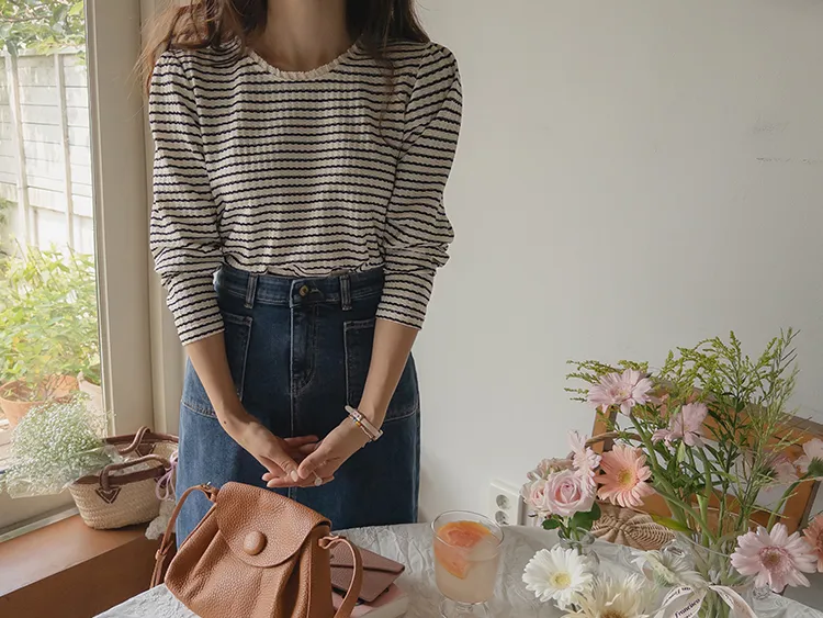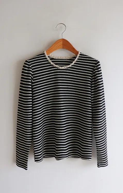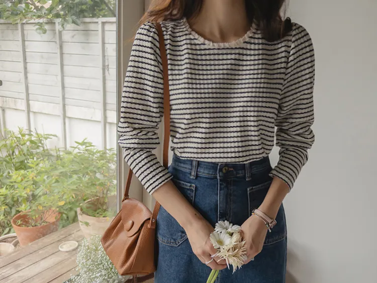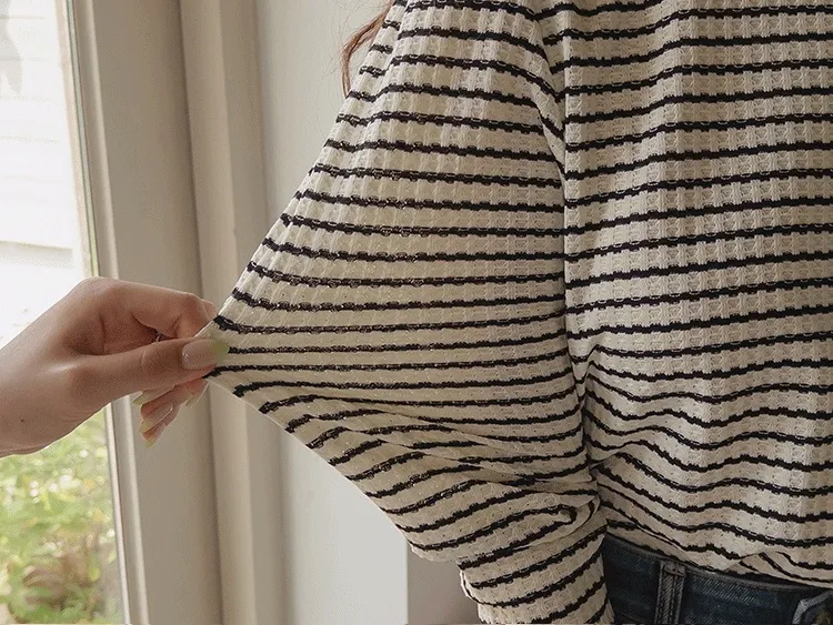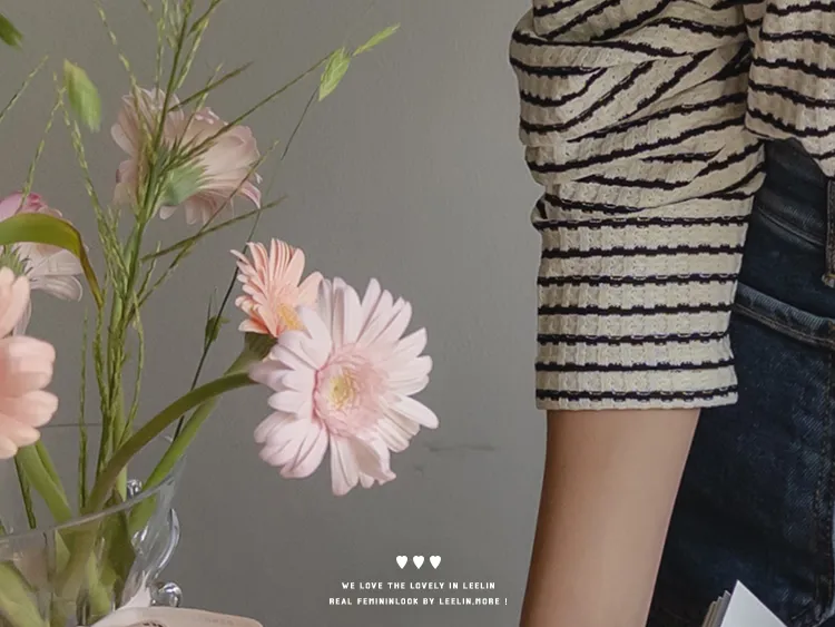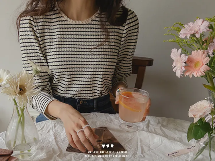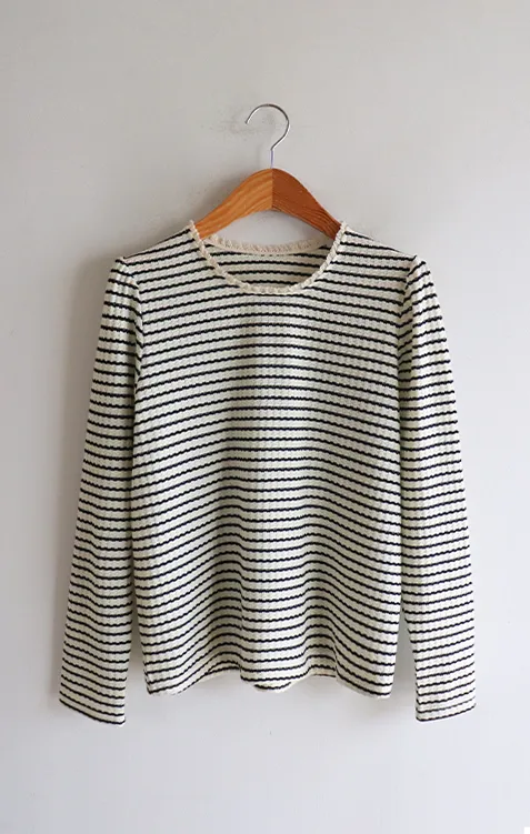 [彈性舒適,2% 氨綸彈性♥] [條紋上衣,領口飾有褶邊細節] [穿著柔軟舒適] [可以搭配任何下裝單品。