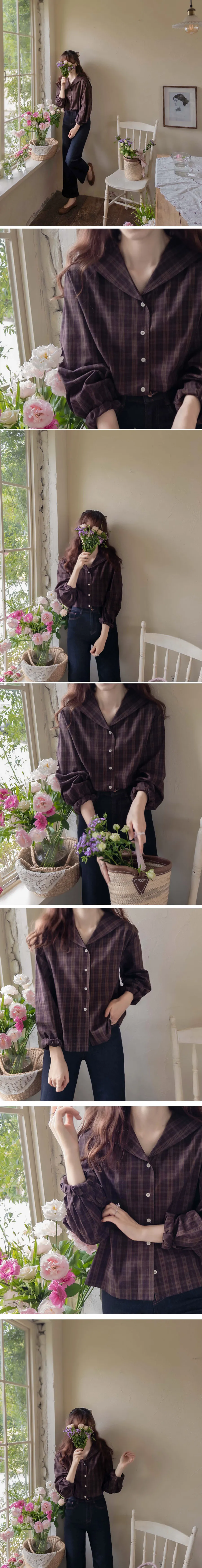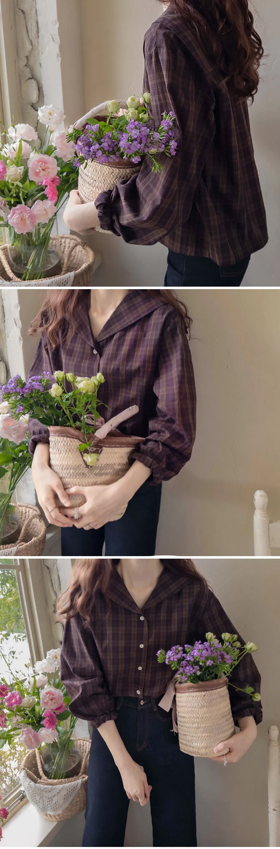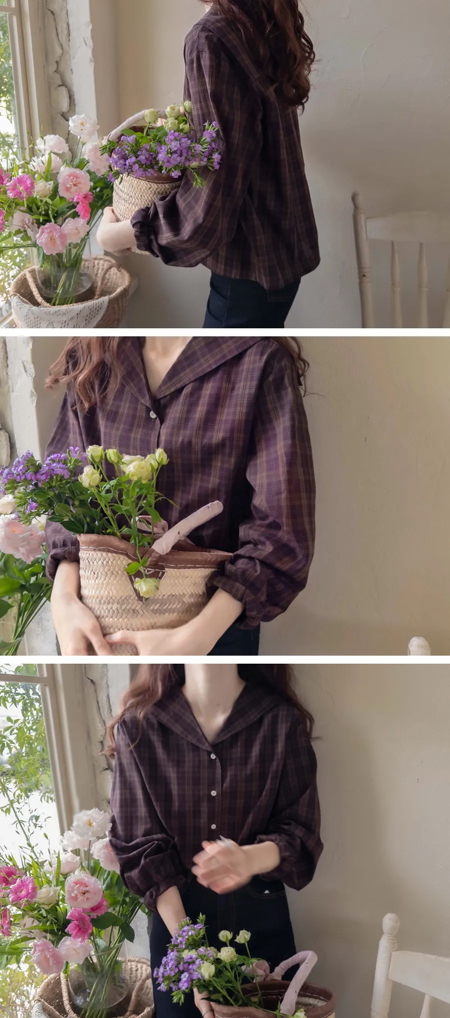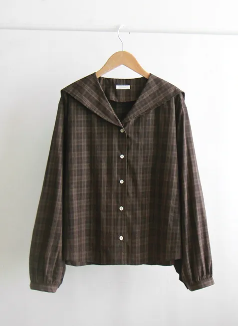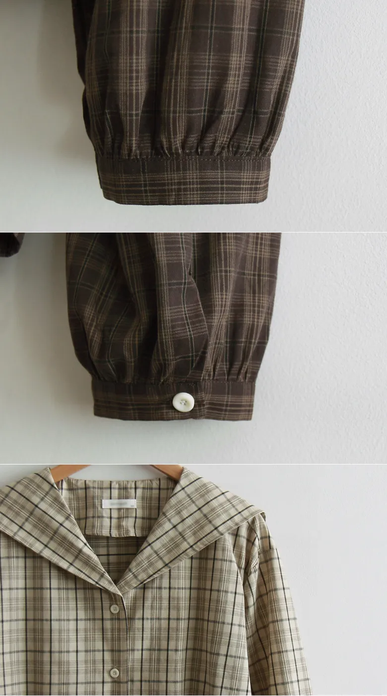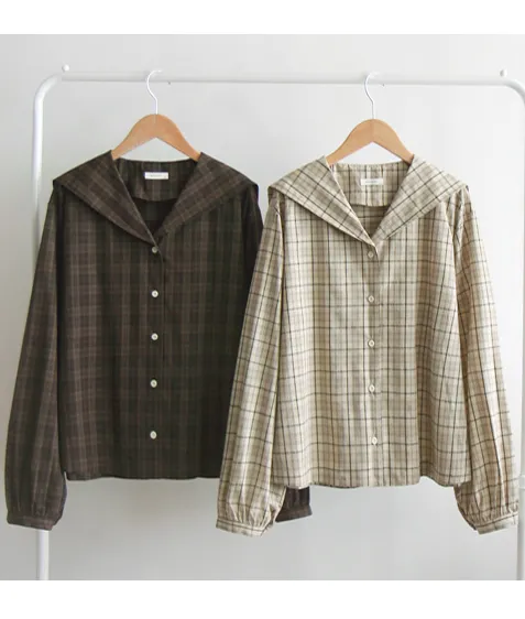 精緻優雅秋色水手領格紋排扣上衣 米色現貨