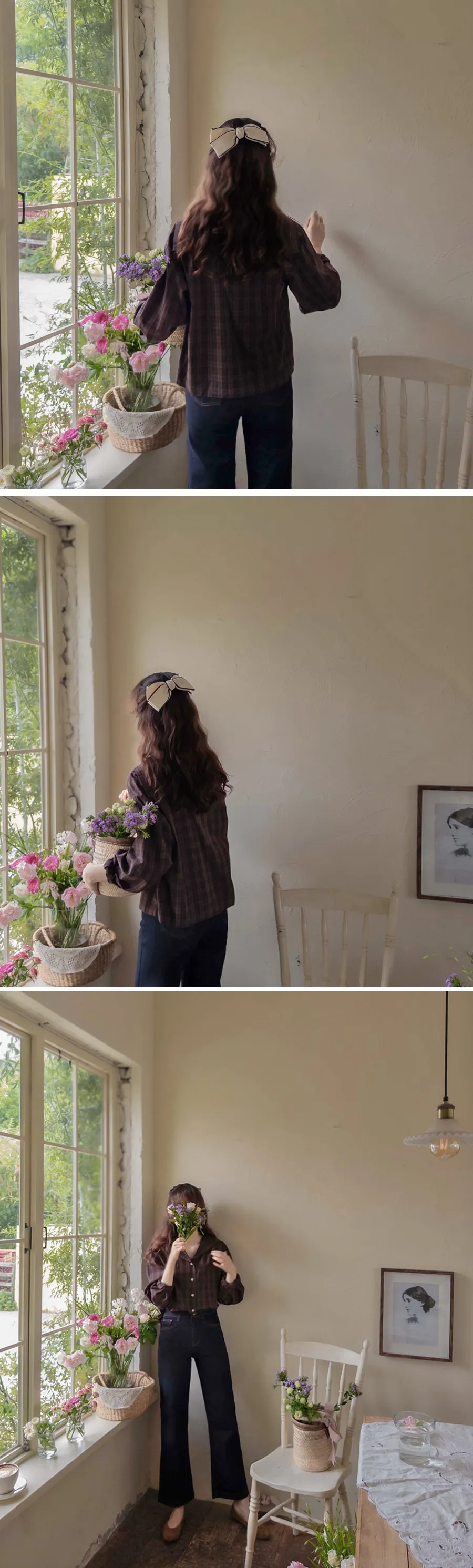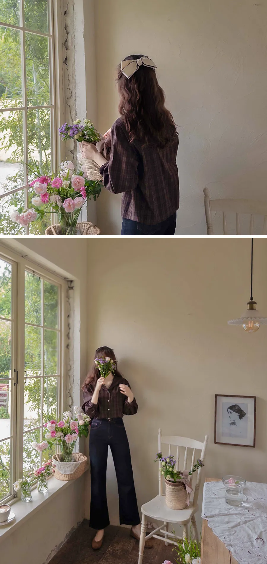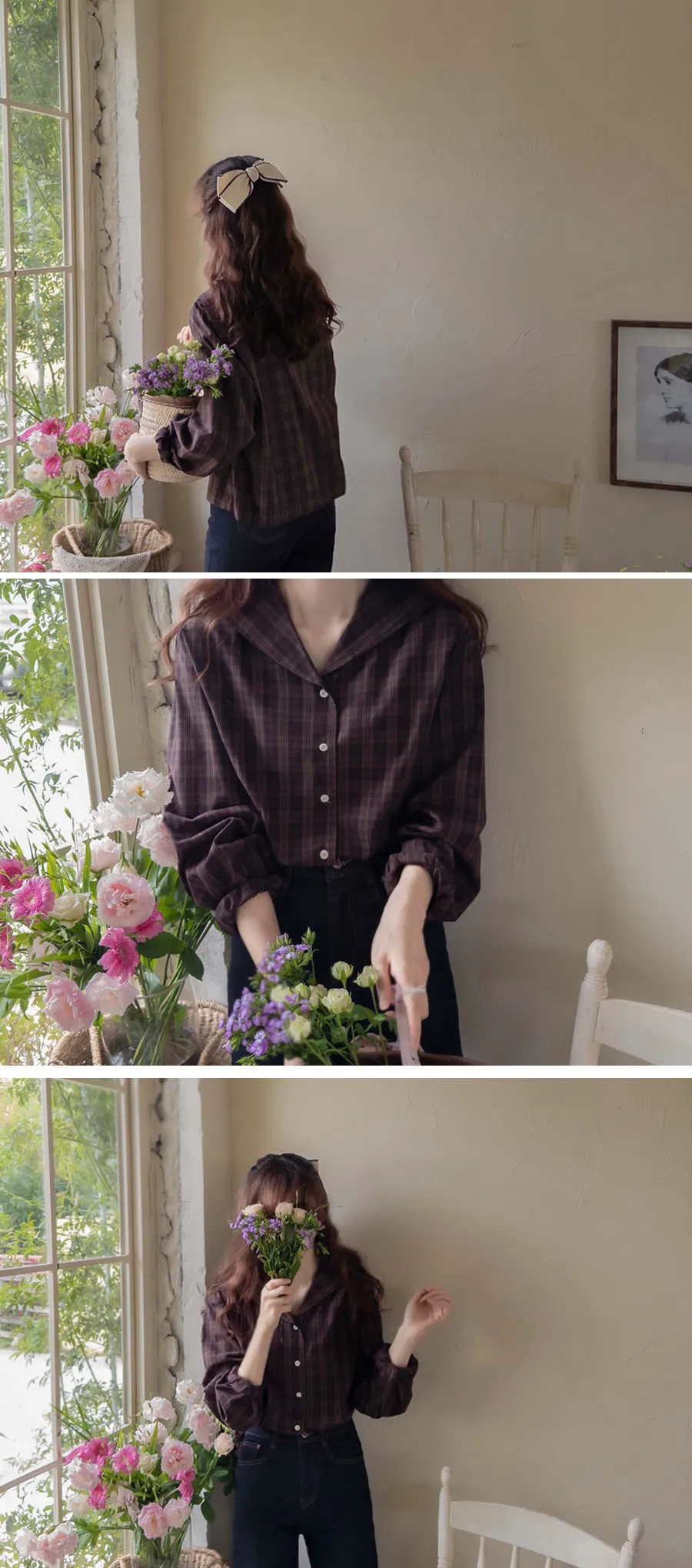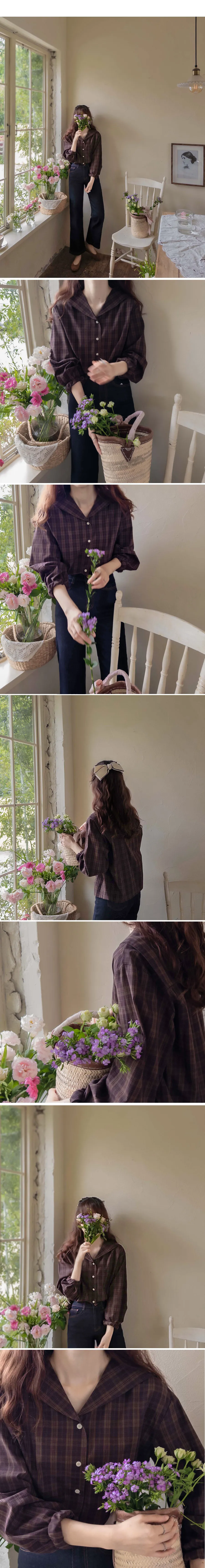 精緻優雅秋色水手領格紋排扣上衣 米色現貨