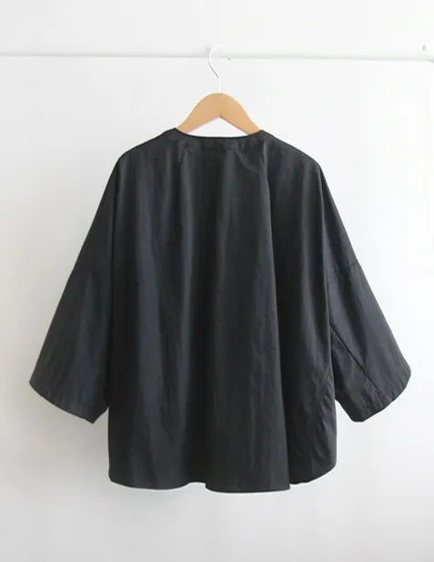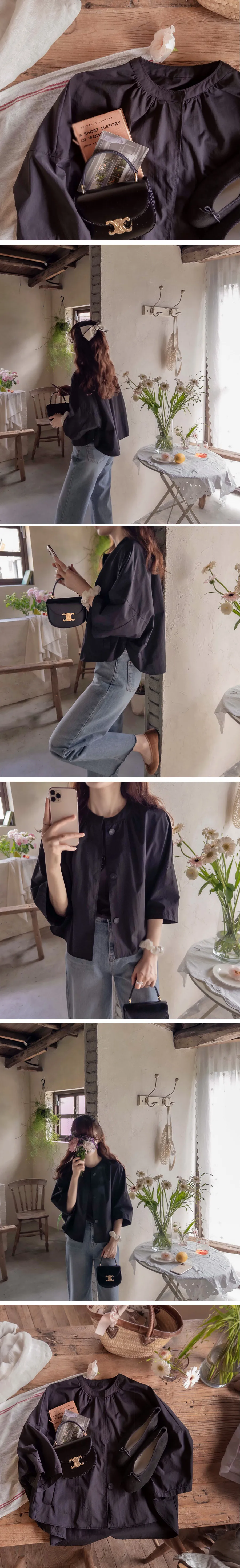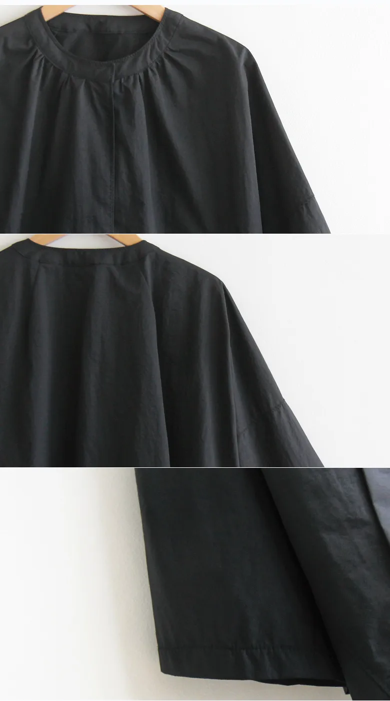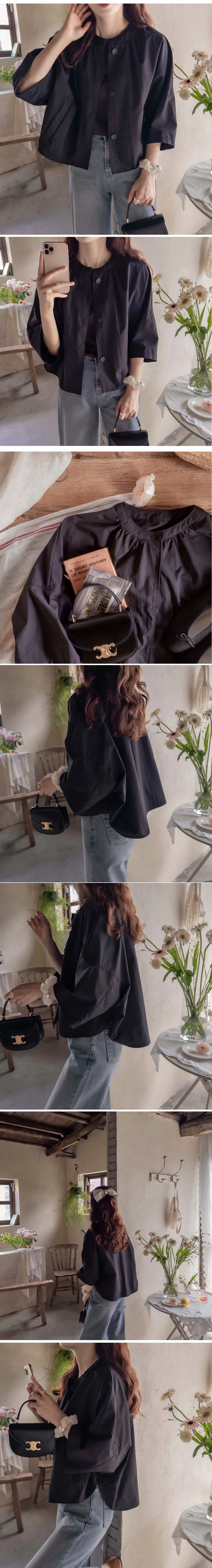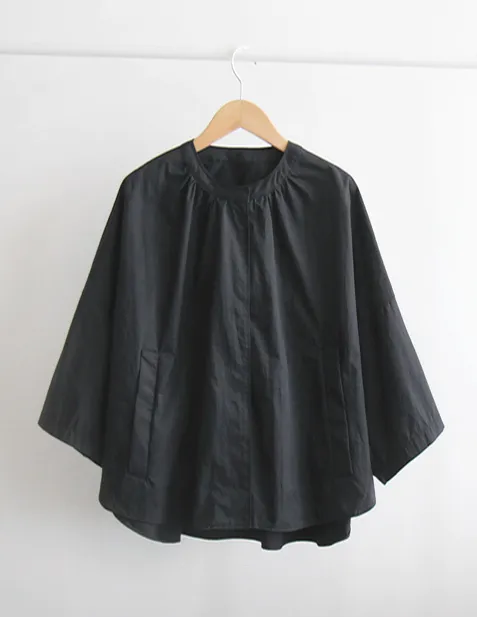 [換季夾克][採用優質材料製成的輕盈、挺括、堅固的面料][打開時像夾克,用隱藏鈕扣扣緊時像襯衫][蝙蝠袖,向袖子方向逐漸變窄][鋸齒形縫線單面和可愛的斗篷般的感覺,帶有圖案和剪裁線的夾克] [帶有時尚線條的跨季節夾克外套]