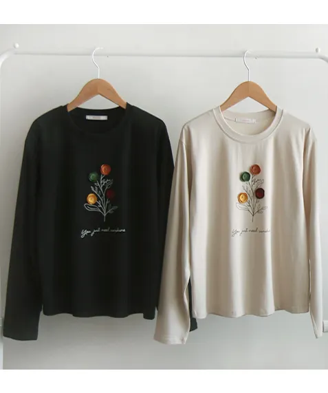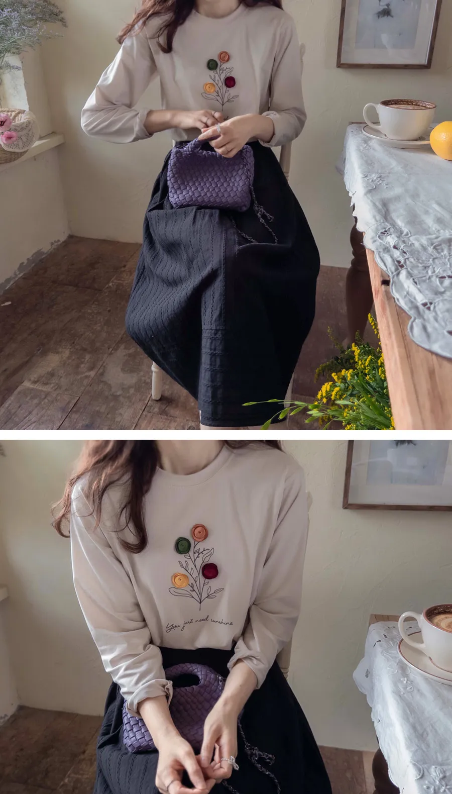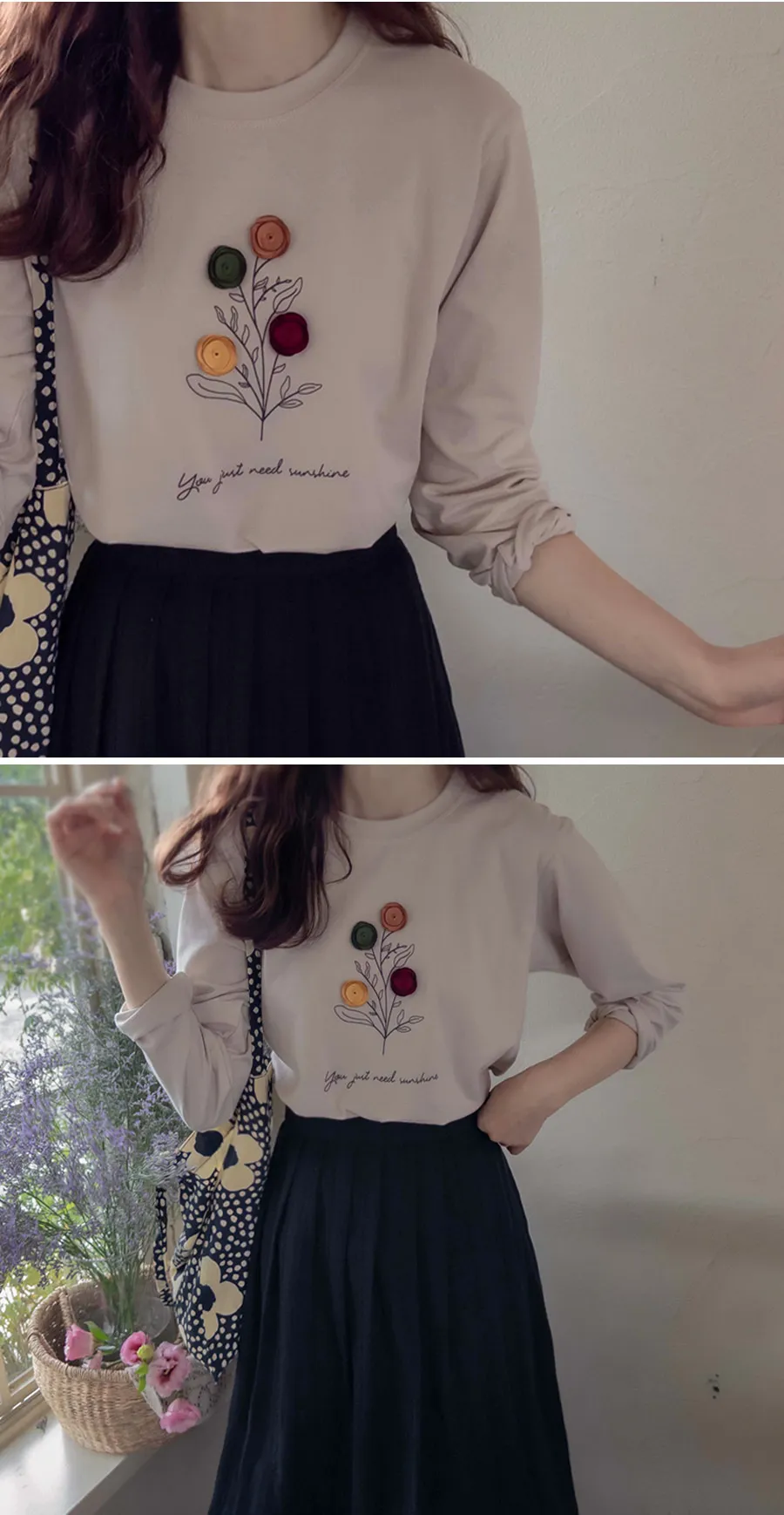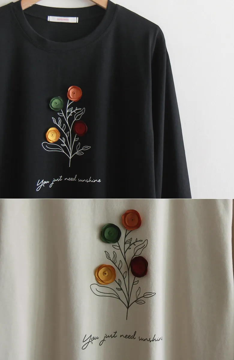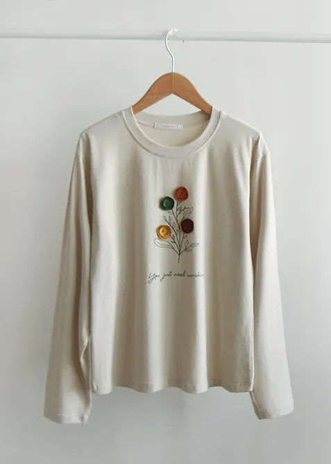 【舒適上衣,彈性好,觸感好】【適合秋季穿的T卹】【以立體花朵和字母印花為點,時尚意境】【基礎色,非常適合日常穿著】 [可愛推薦作為以立體花為點的時尚秋季上衣]