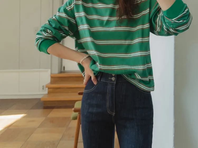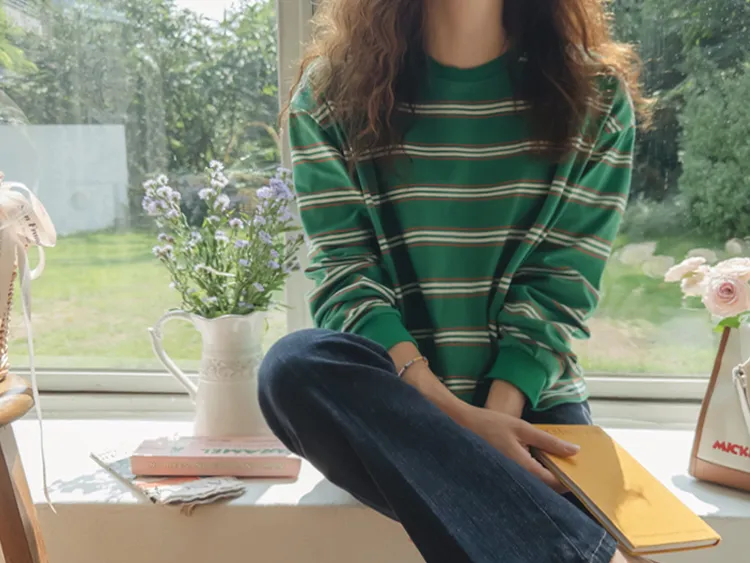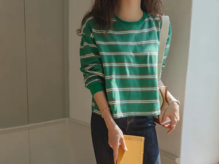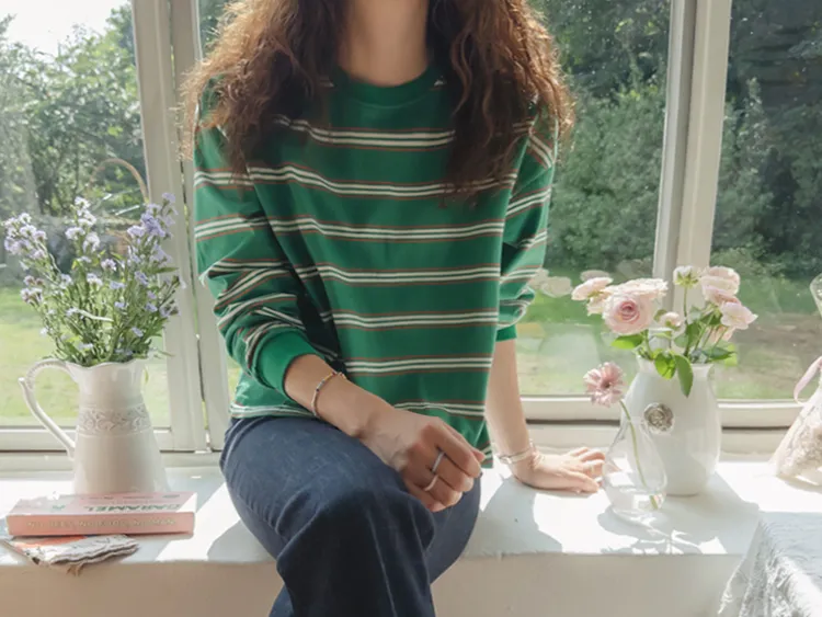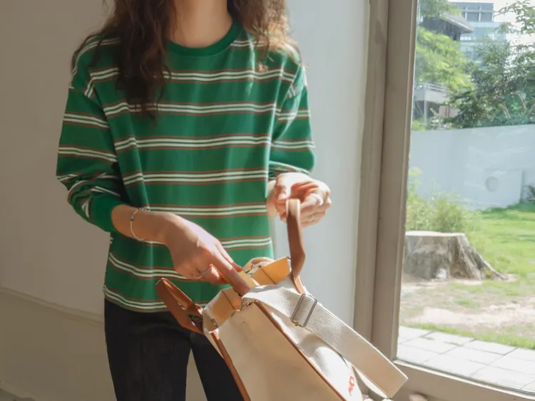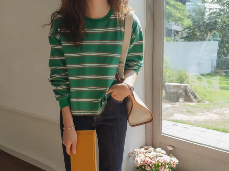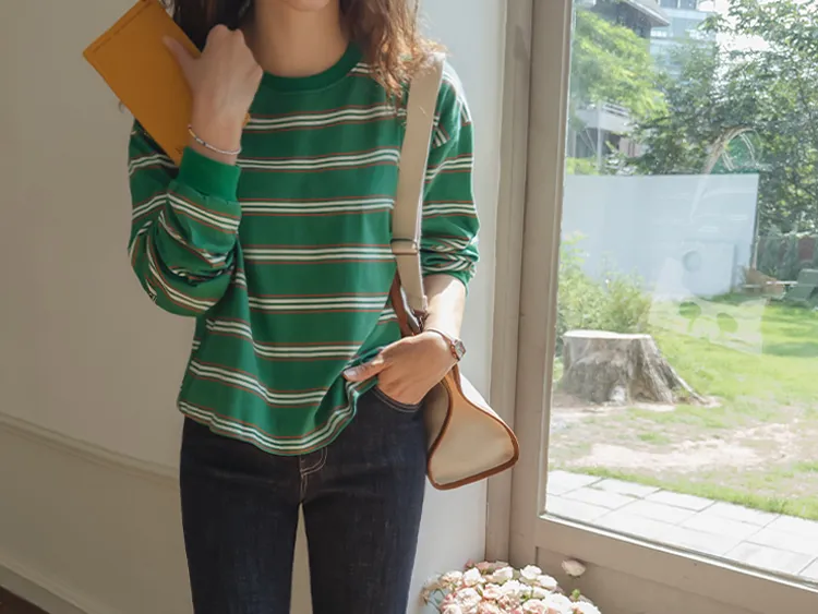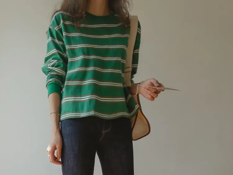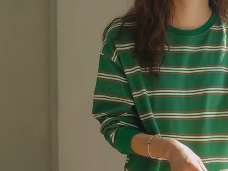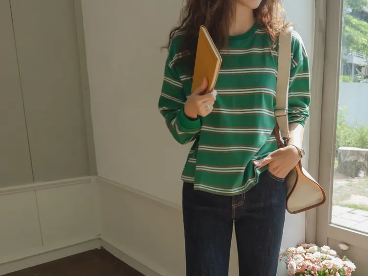 精靈條紋上衣長袖版,受到了很多人的喜愛! ] [休閒心情下穿著舒適的條紋T卹] [活潑又可愛] [色彩繽紛的條紋圖案充滿了新鮮感】【可以搭配任何下裝單品,輕鬆穿搭的萬用單品!