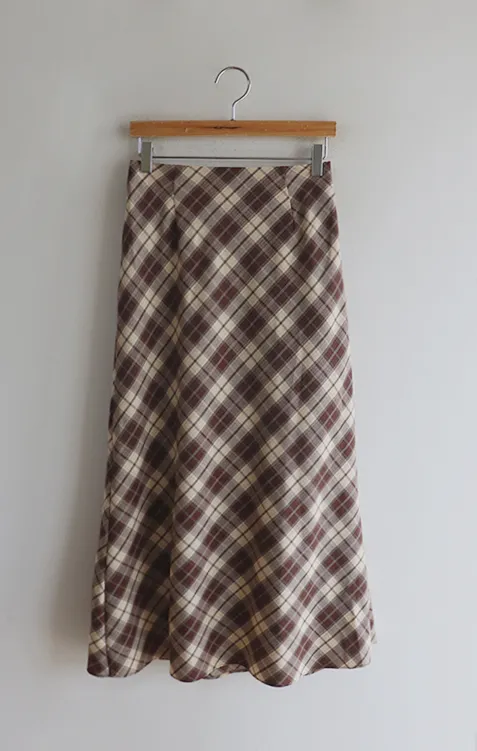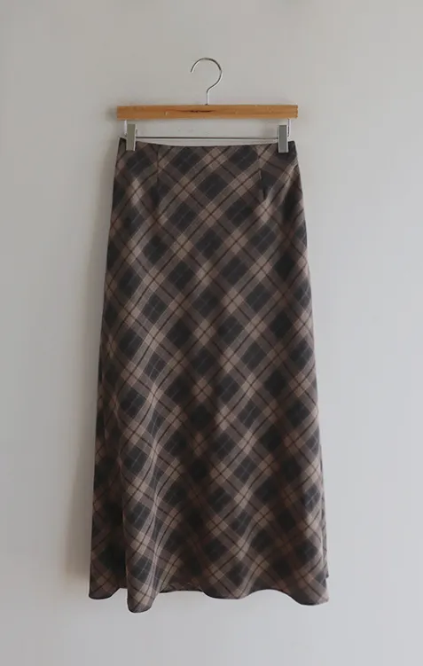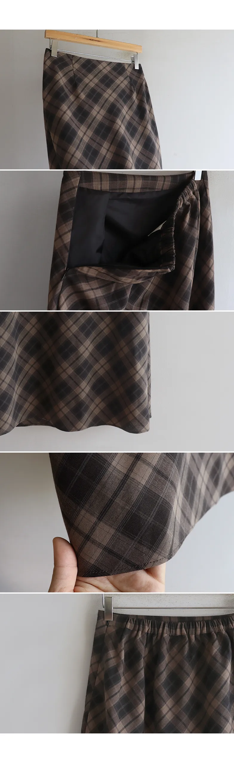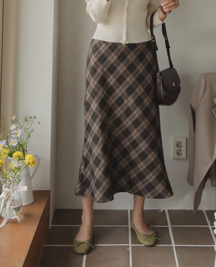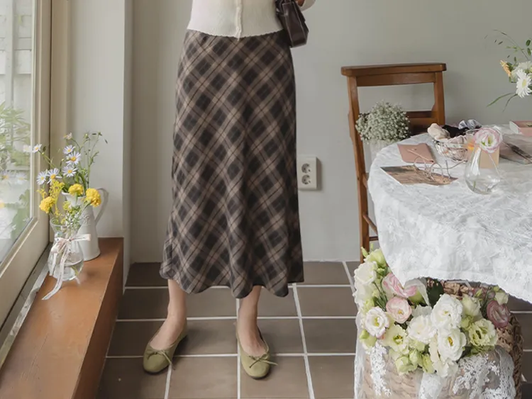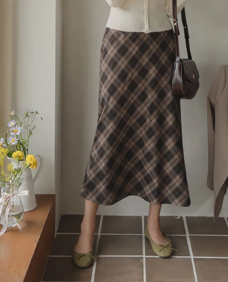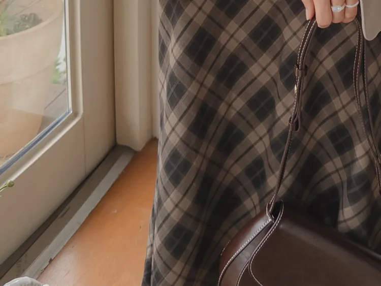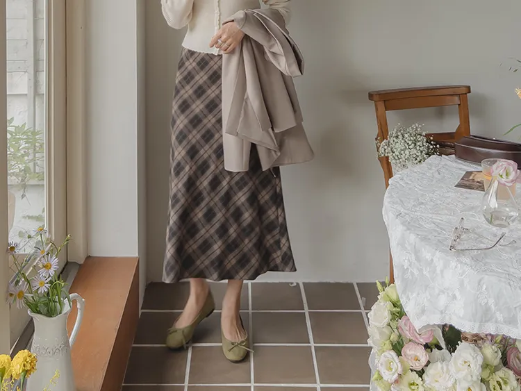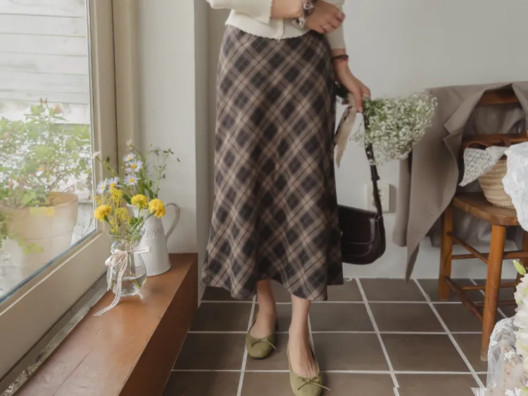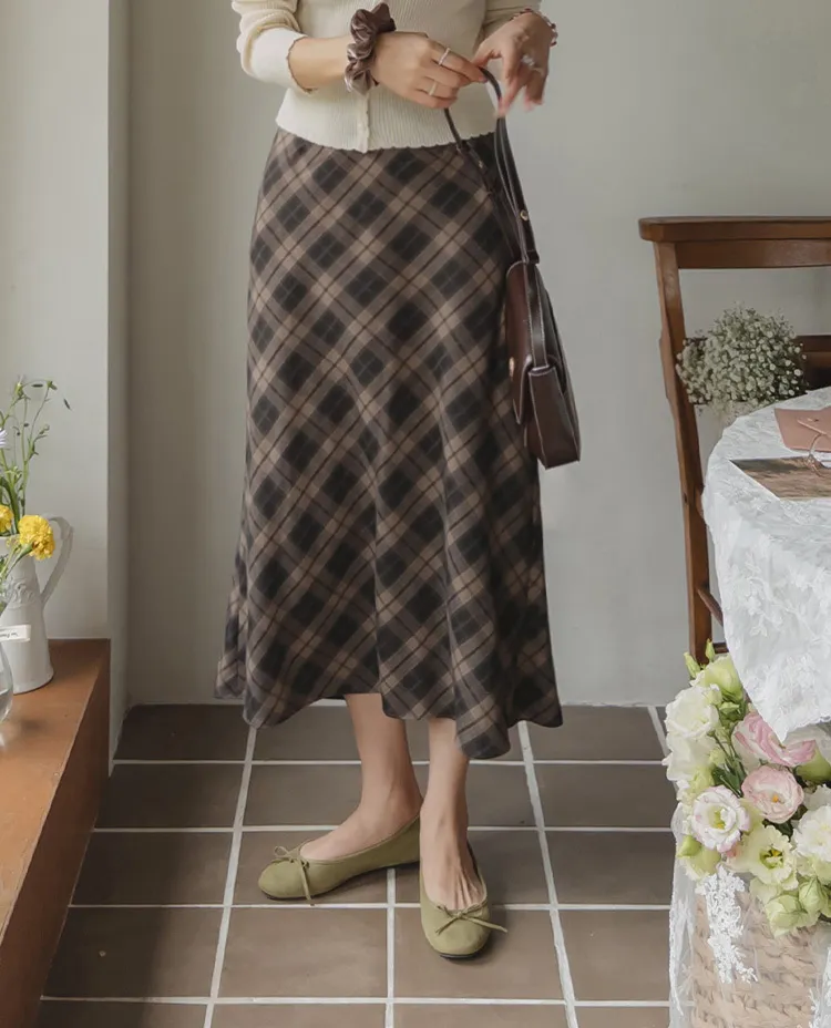 【帶有喜怒無常的格紋圖案的傘擺形中長裙♡】【大氣的棕色色調】【適度的傘擺輪廓,使下半身線條看起來非常漂亮! 】【含有氨綸+後腰帶,穿著很舒服〜】