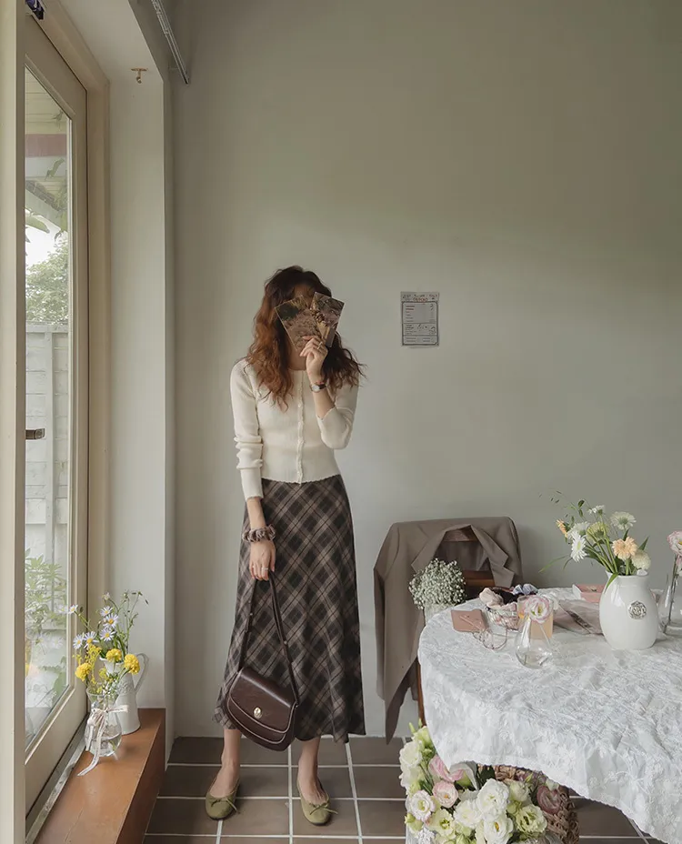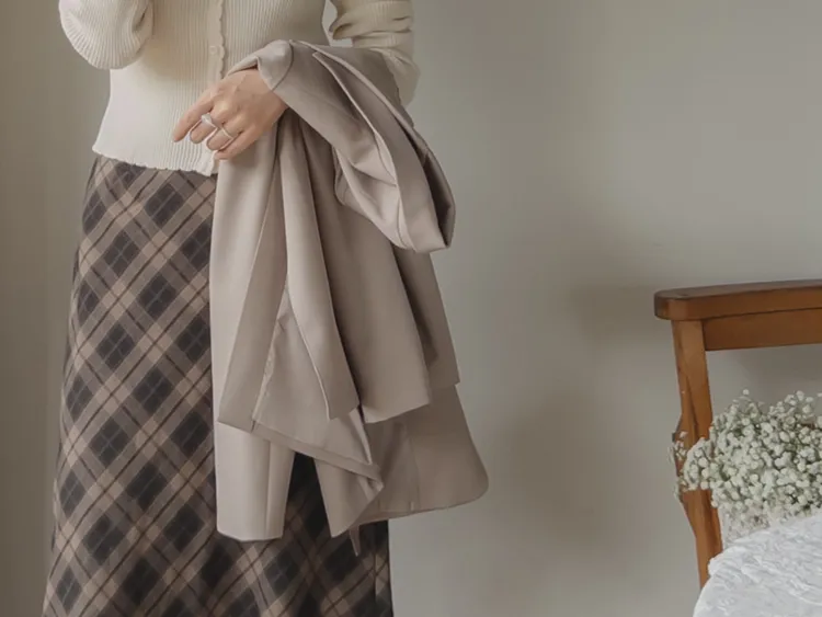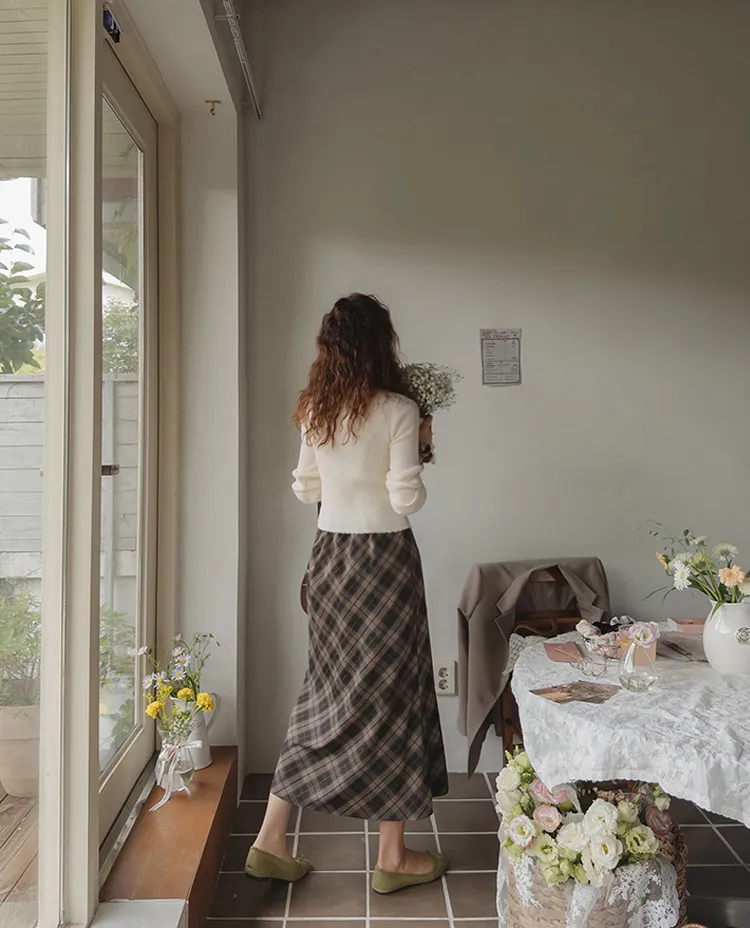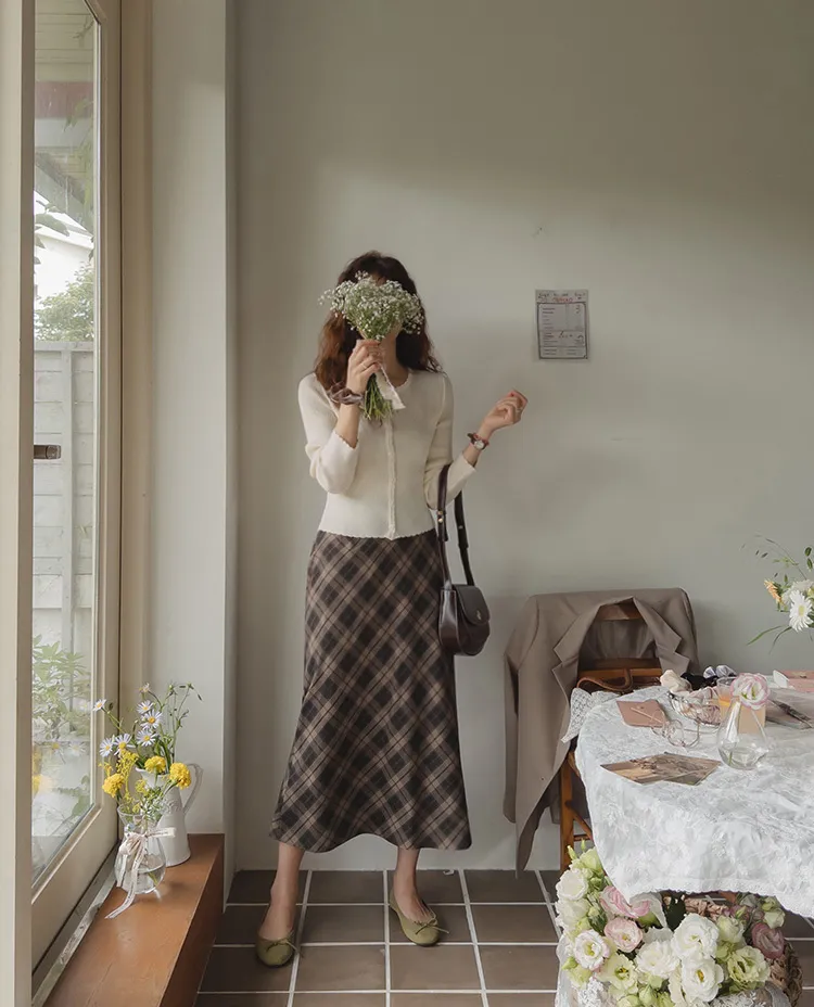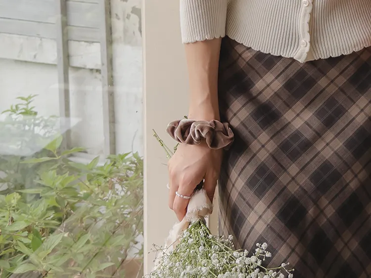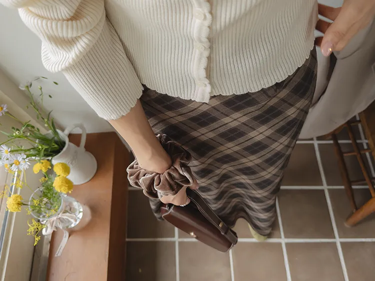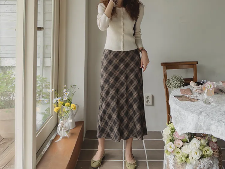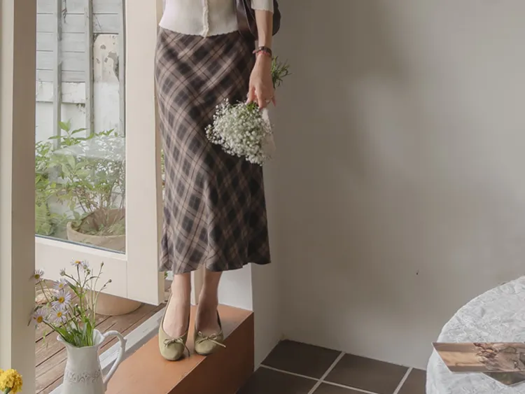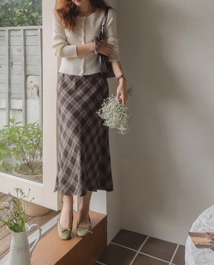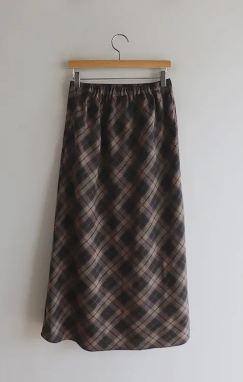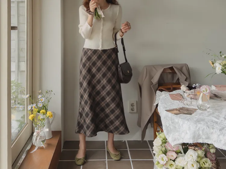 【帶有喜怒無常的格紋圖案的傘擺形中長裙♡】【大氣的棕色色調】【適度的傘擺輪廓,使下半身線條看起來非常漂亮! 】【含有氨綸+後腰帶,穿著很舒服〜】
