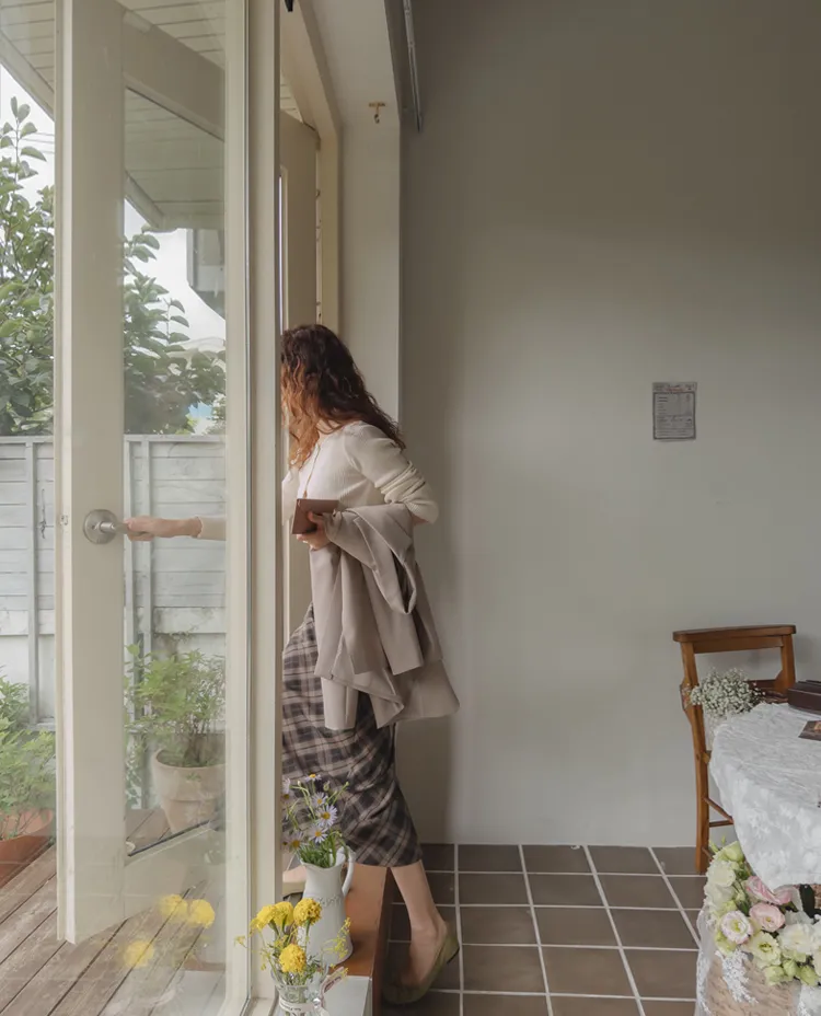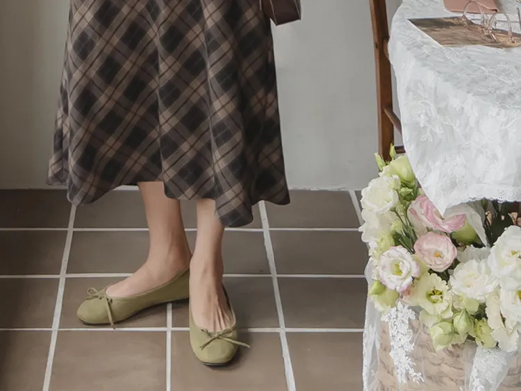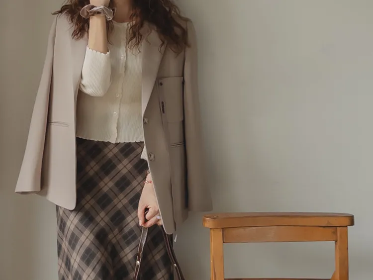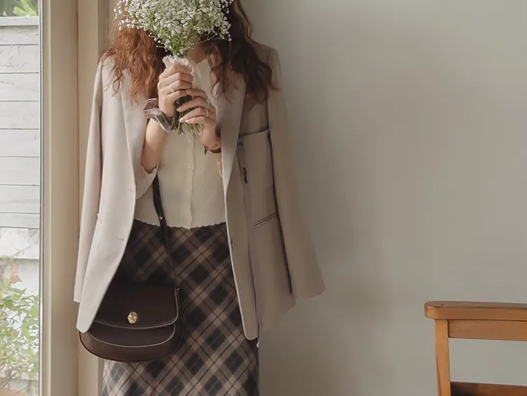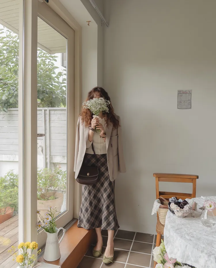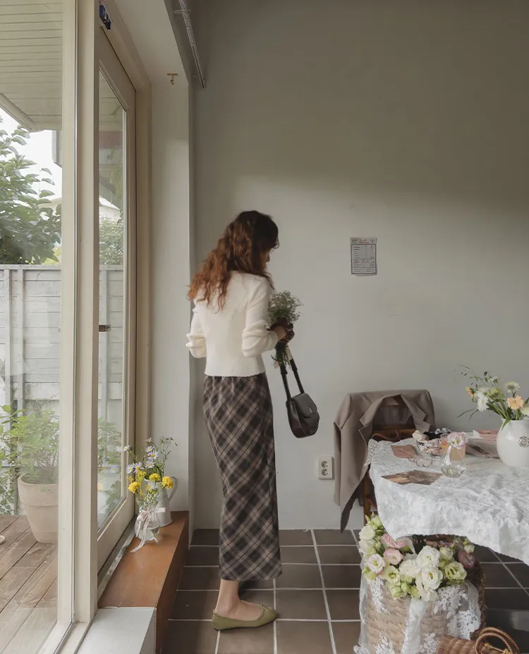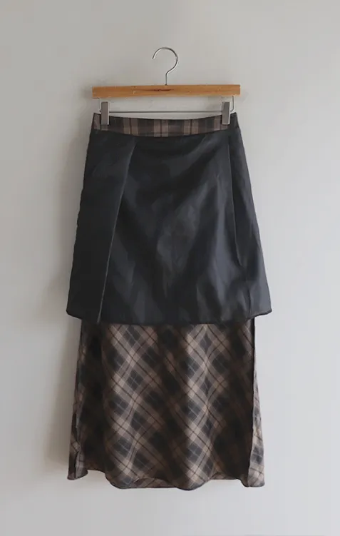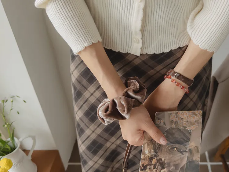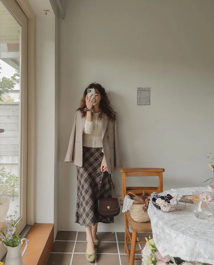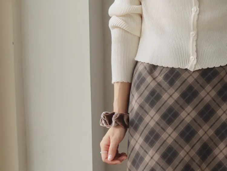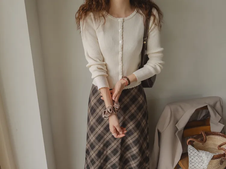 【帶有喜怒無常的格紋圖案的傘擺形中長裙♡】【大氣的棕色色調】【適度的傘擺輪廓,使下半身線條看起來非常漂亮! 】【含有氨綸+後腰帶,穿著很舒服〜】