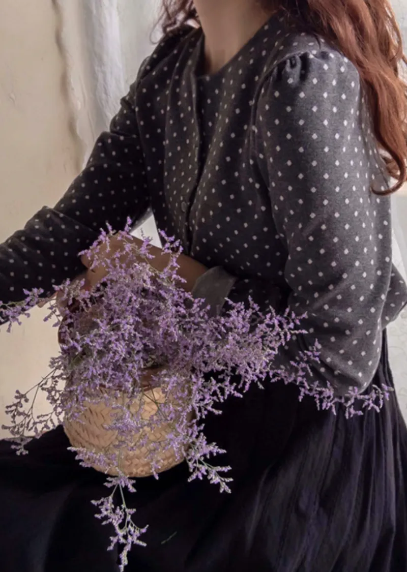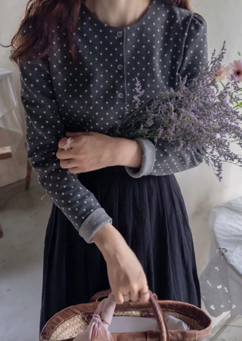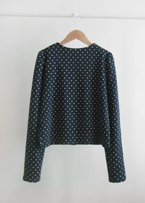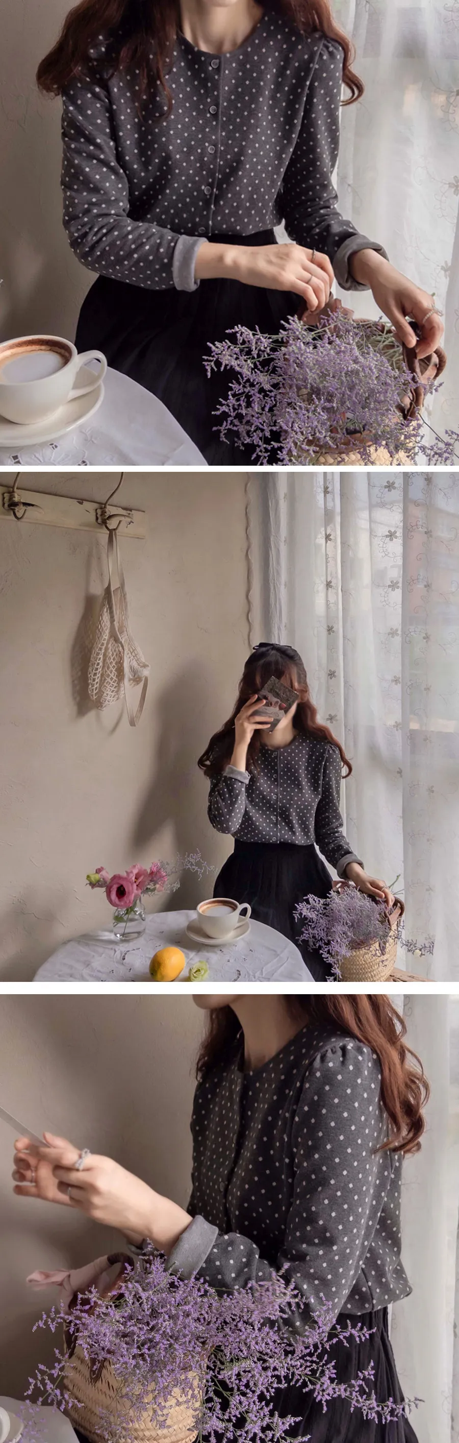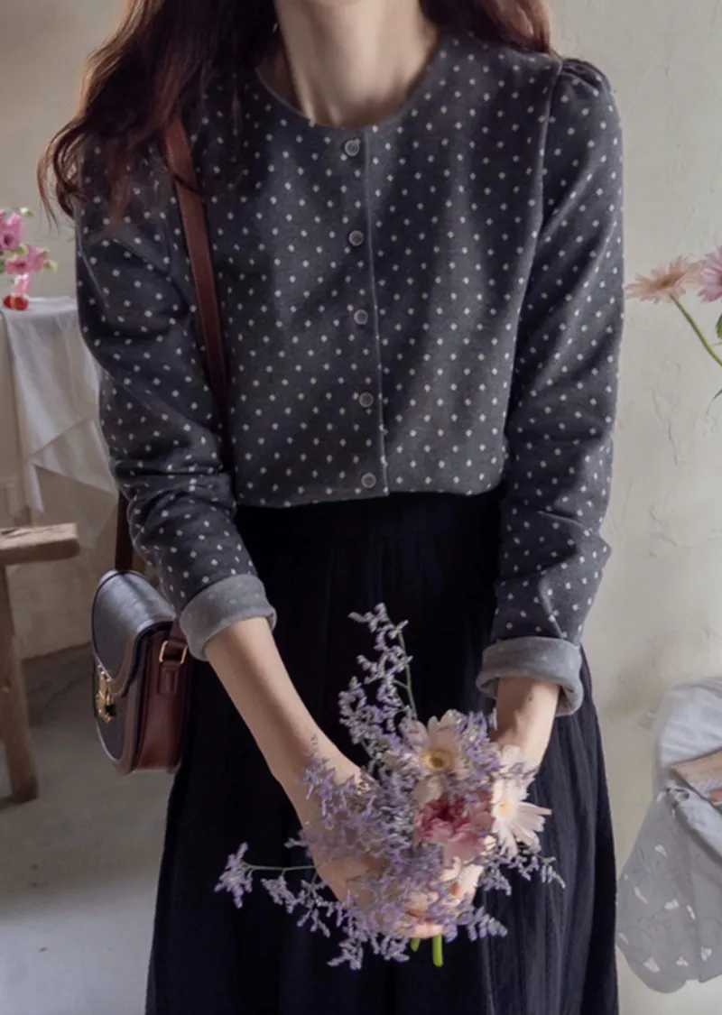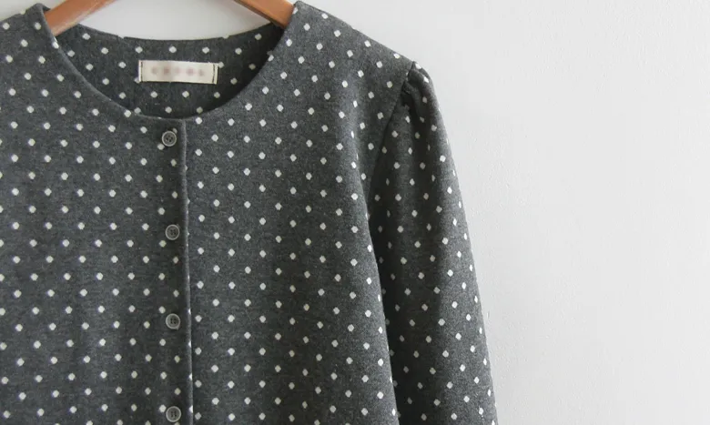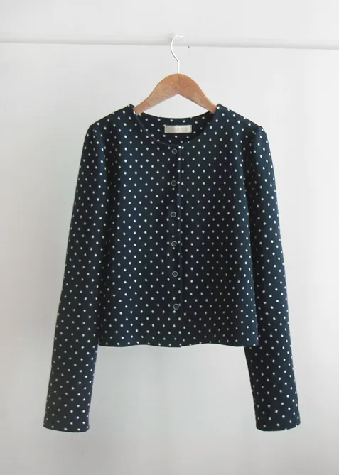 [秋季風格的開衫][充滿活力的圓點圖案的漂亮開衫][顏色增添了精緻的感覺][舒適的開衫,緊緻而堅挺的彈性][肩部剪裁使它很漂亮][帶有可愛圖案的邊緣開衫
