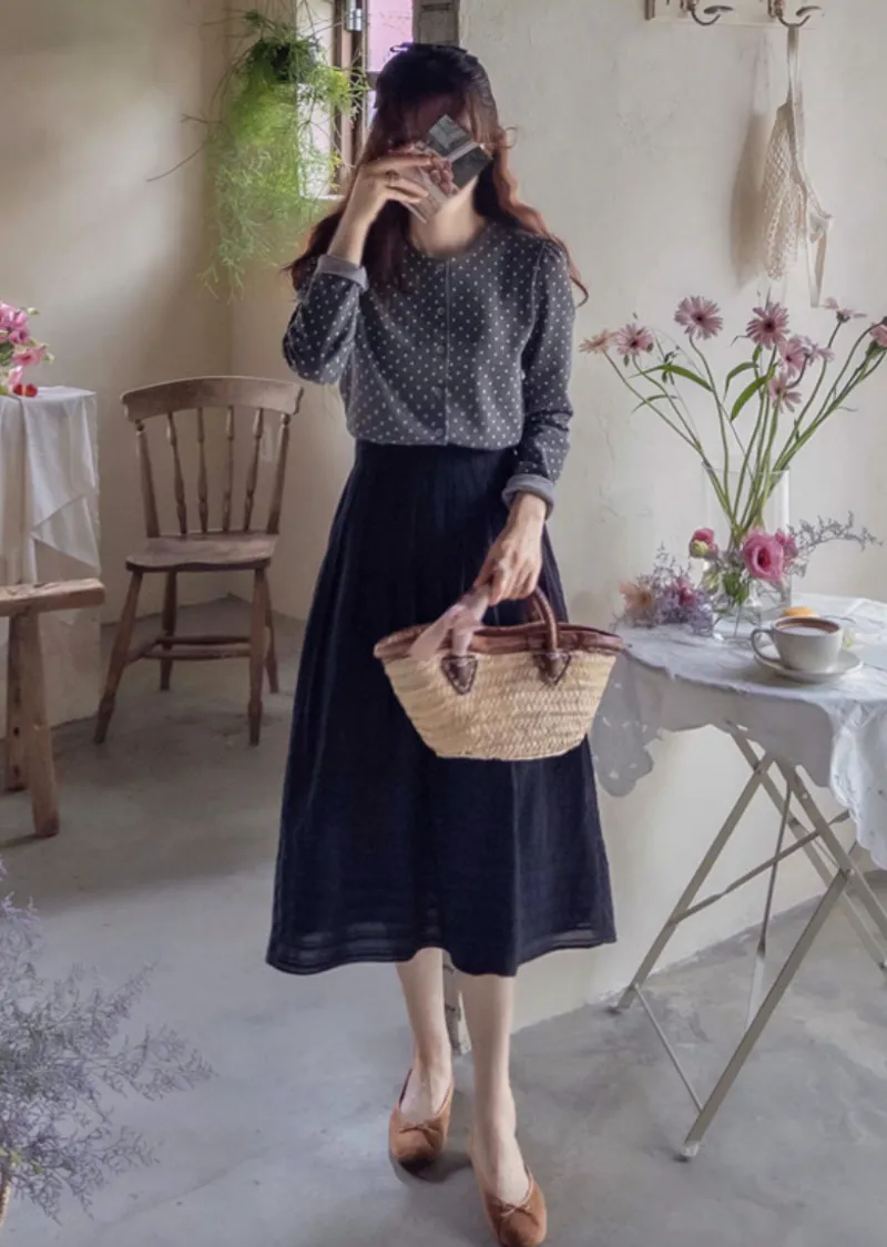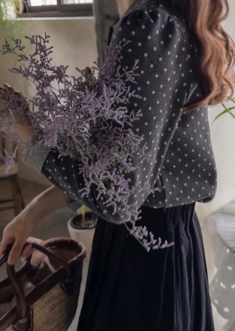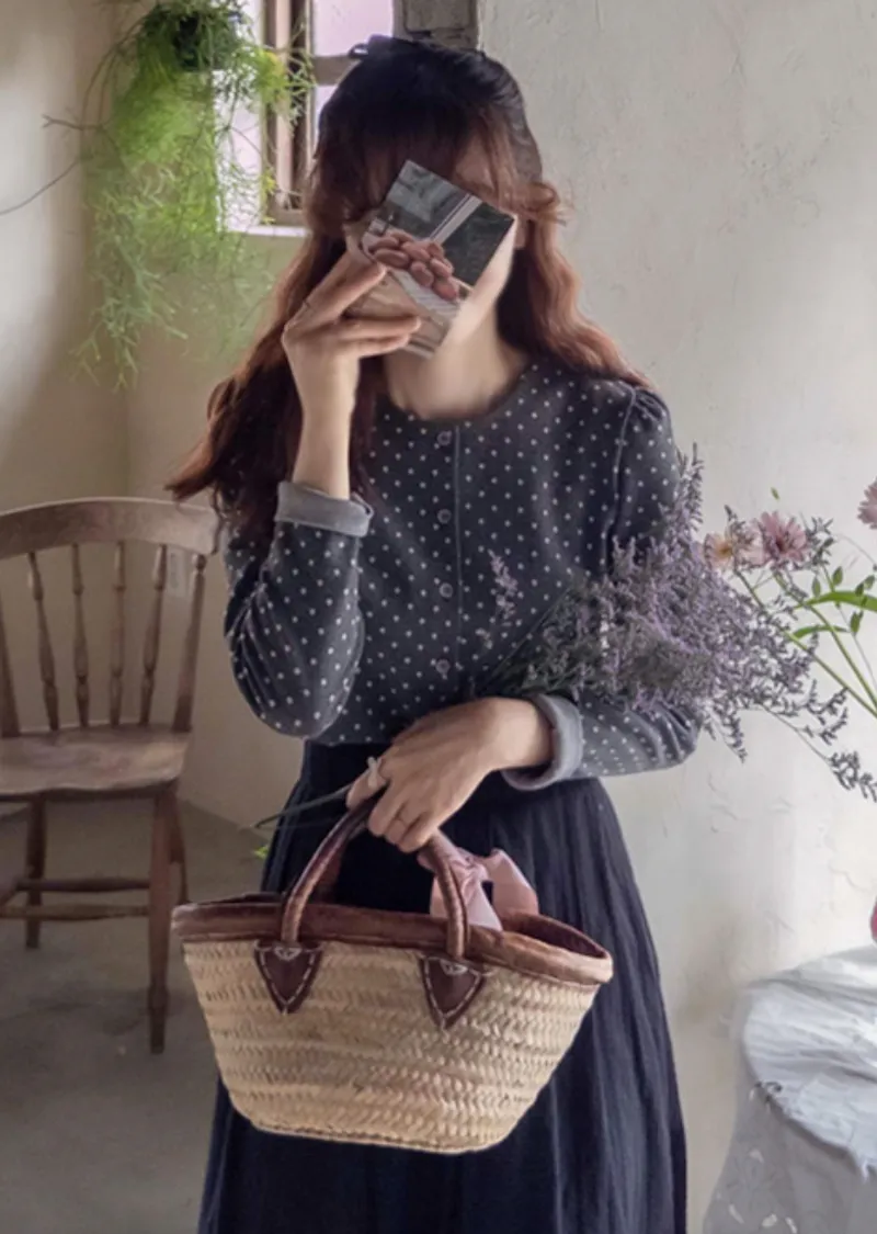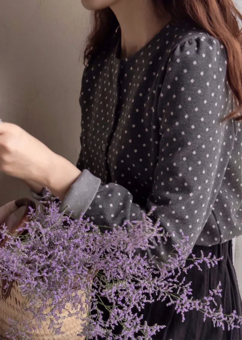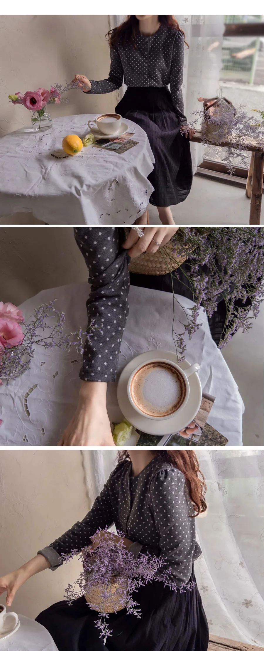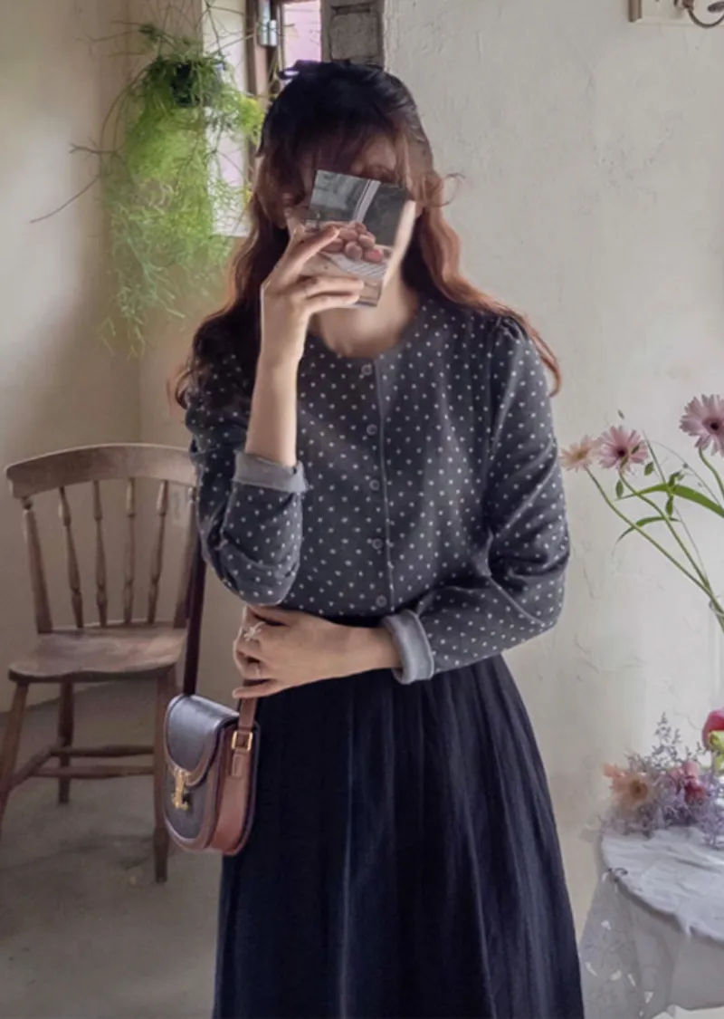 [秋季風格的開衫][充滿活力的圓點圖案的漂亮開衫][顏色增添了精緻的感覺][舒適的開衫,緊緻而堅挺的彈性][肩部剪裁使它很漂亮][帶有可愛圖案的邊緣開衫