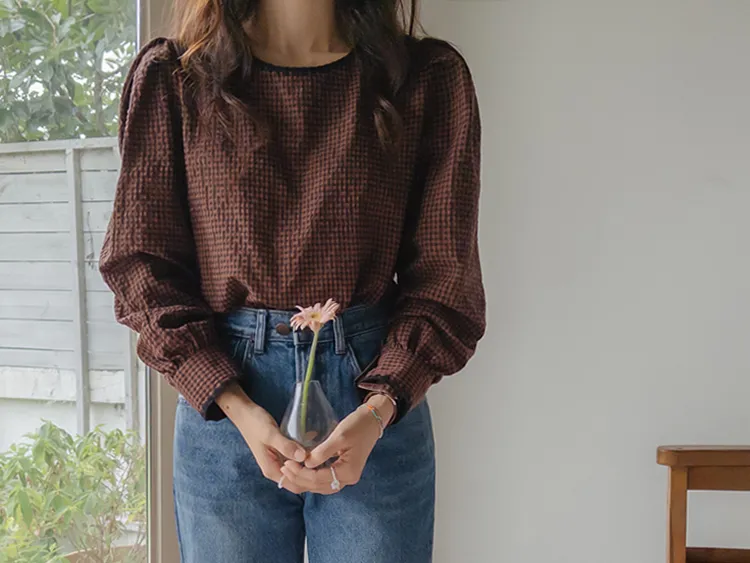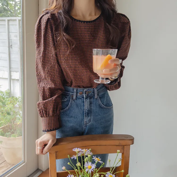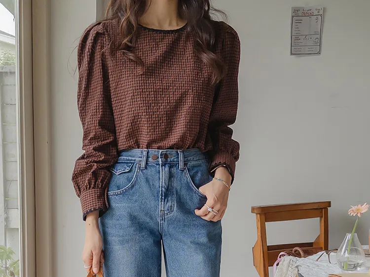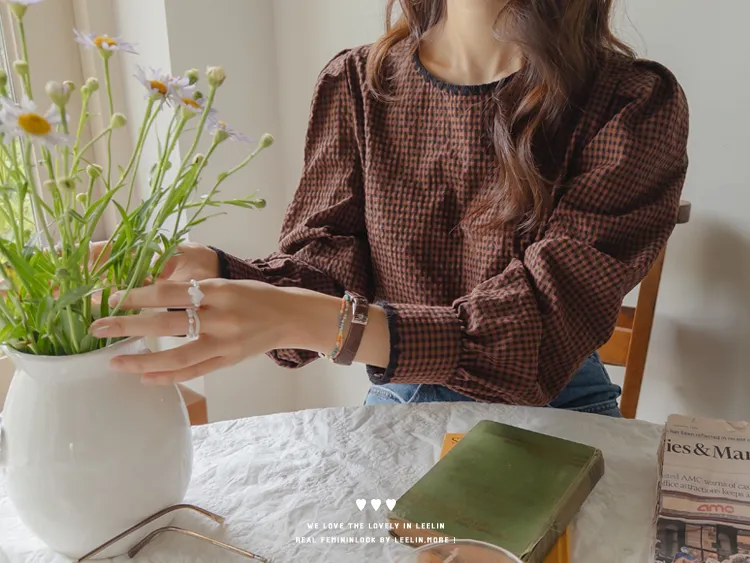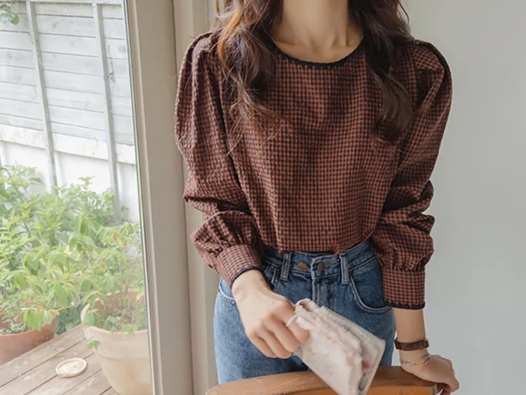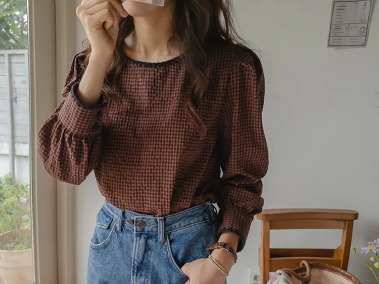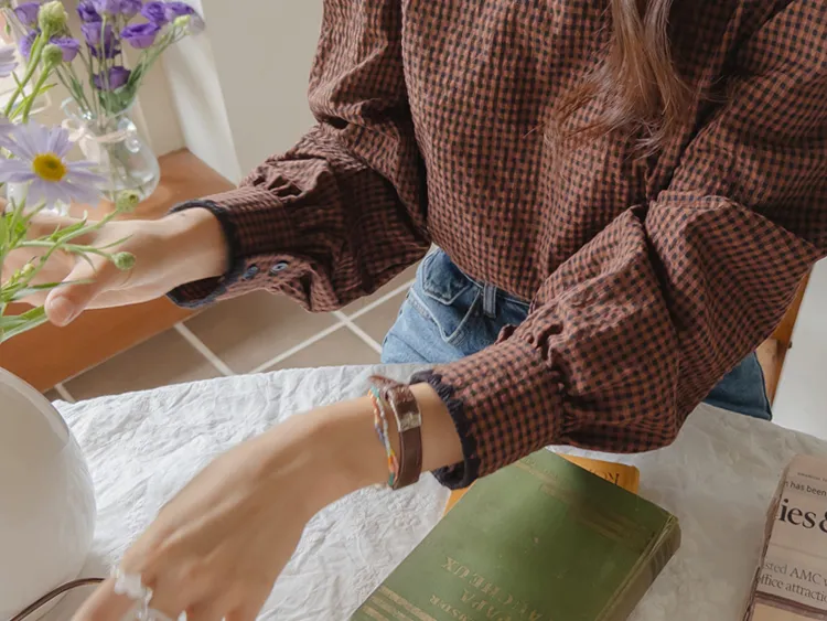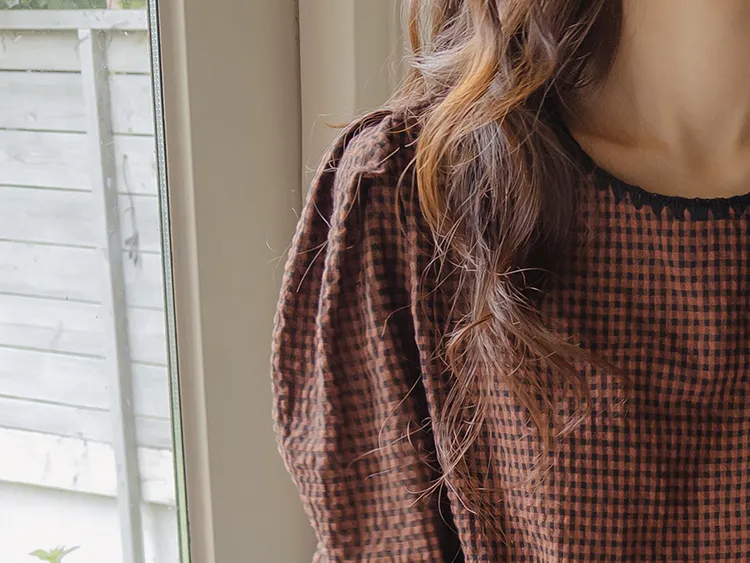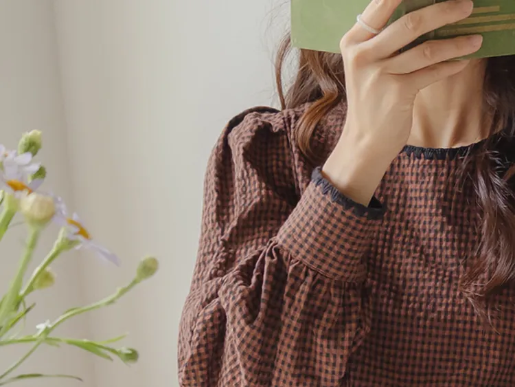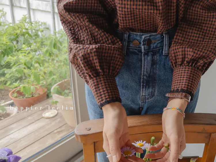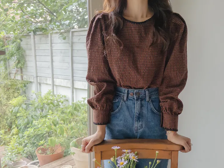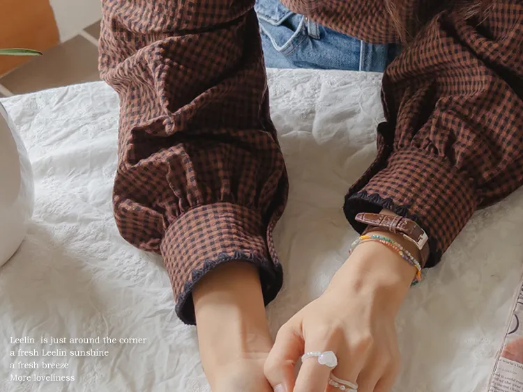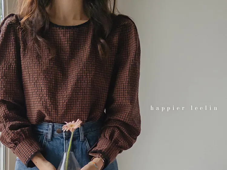 【花瓣狀刺繡邊的領子好可愛♥】【可以搭配褲子和裙子都很棒】【很柔軟~舒適輕薄的面料,就從現在開始吧~】【非常適合秋季!心情不錯的格紋色