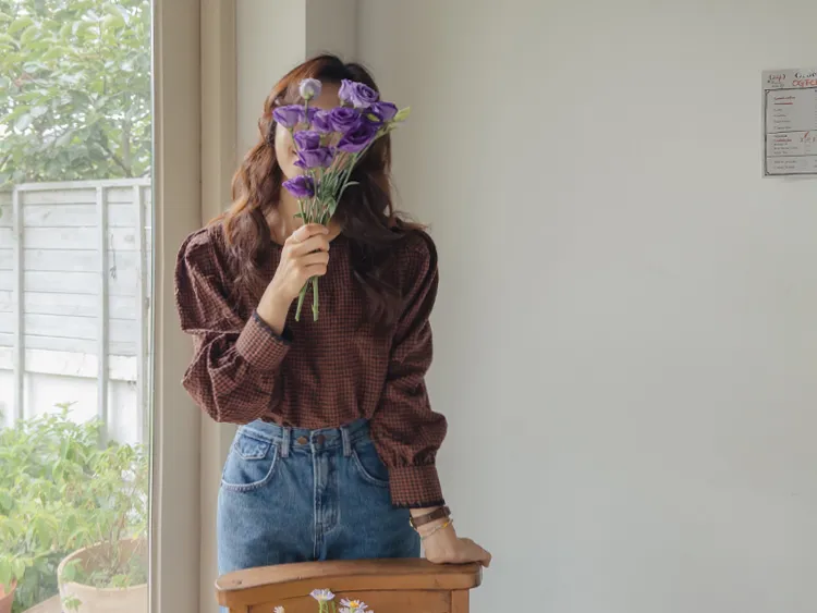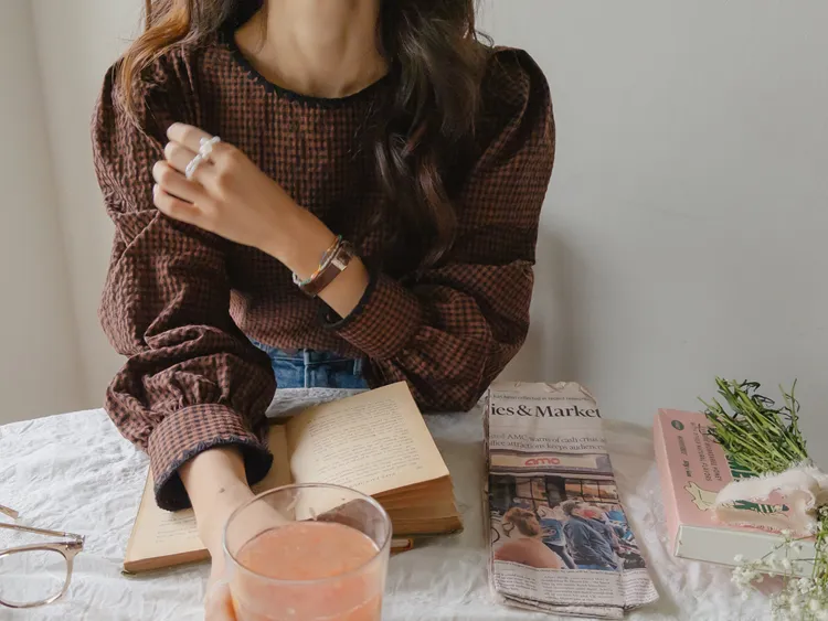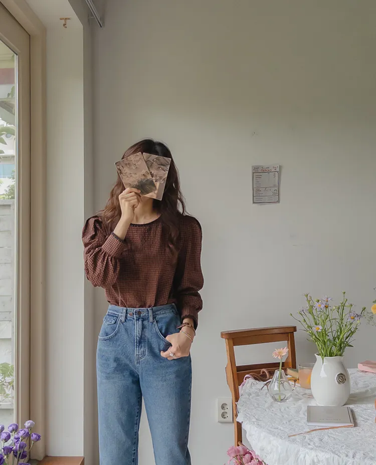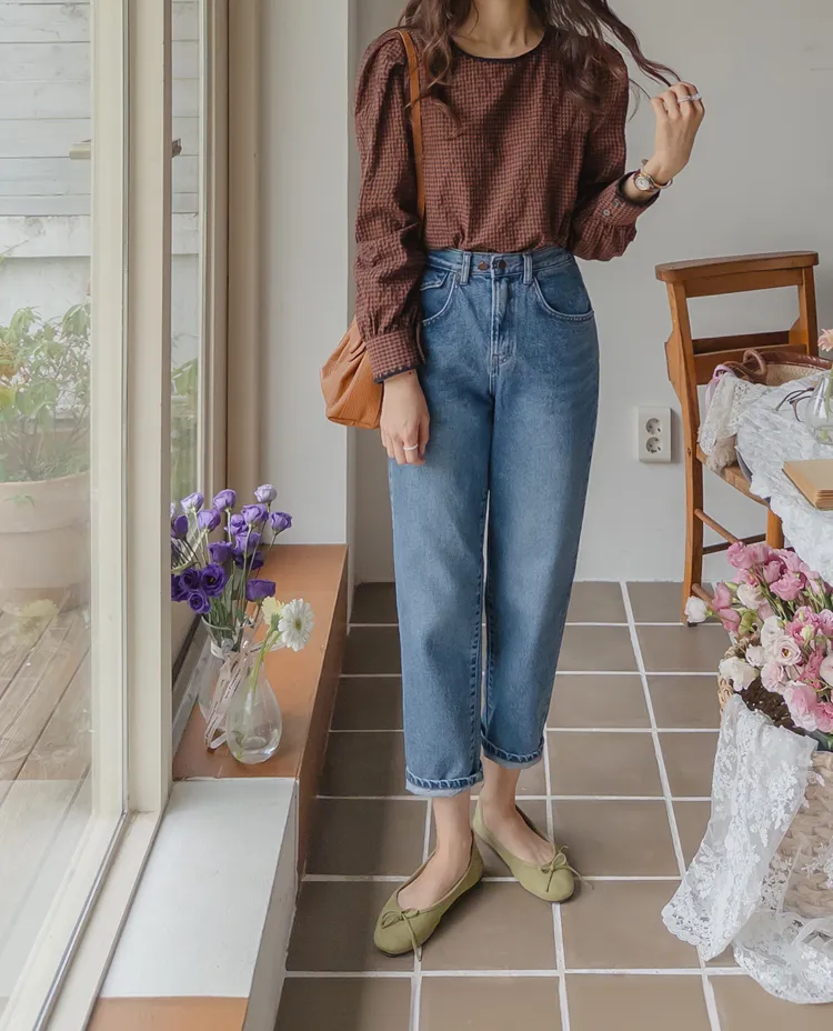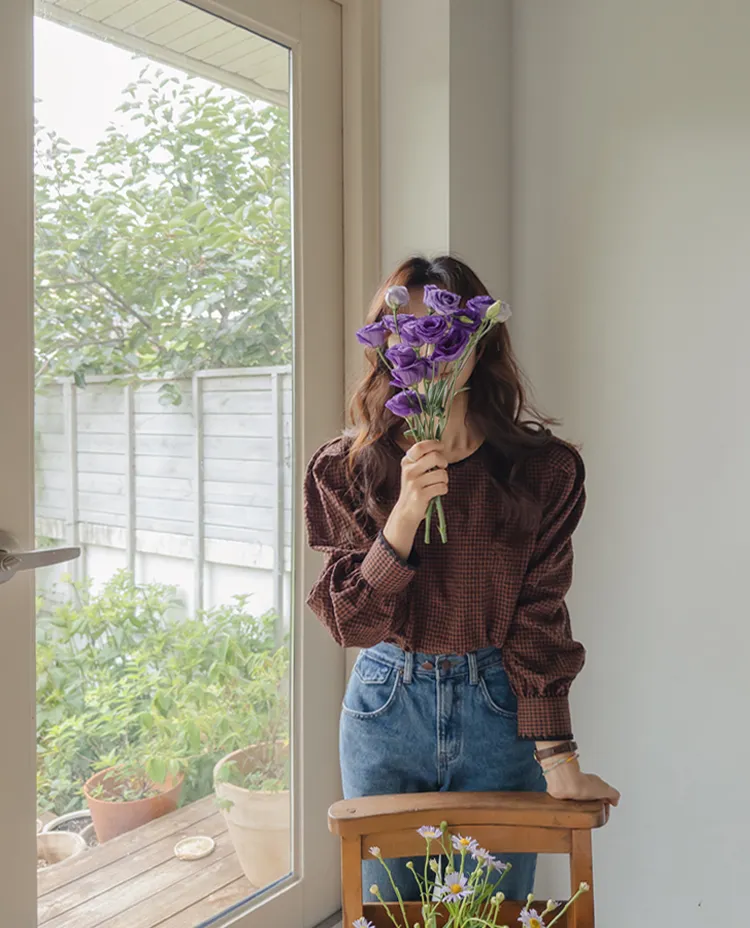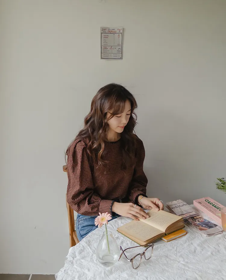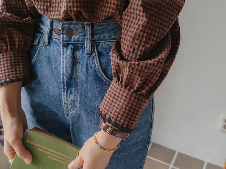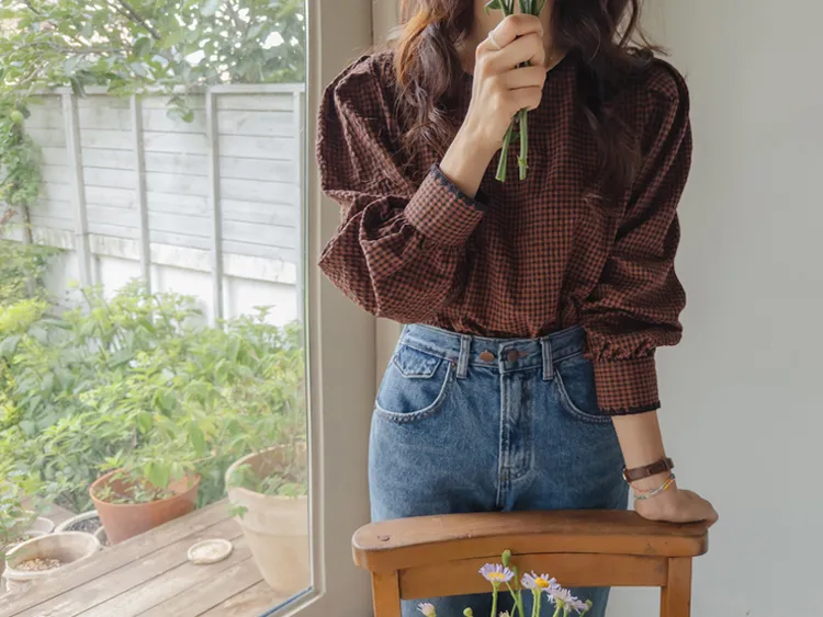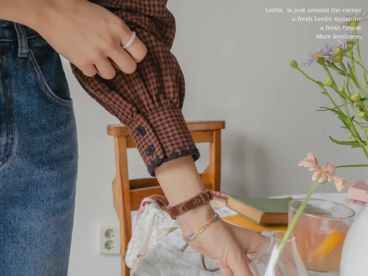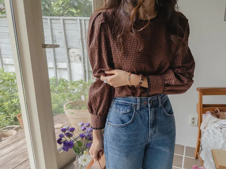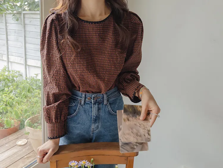 【花瓣狀刺繡邊的領子好可愛♥】【可以搭配褲子和裙子都很棒】【很柔軟~舒適輕薄的面料,就從現在開始吧~】【非常適合秋季!心情不錯的格紋色