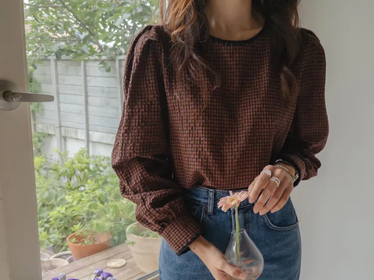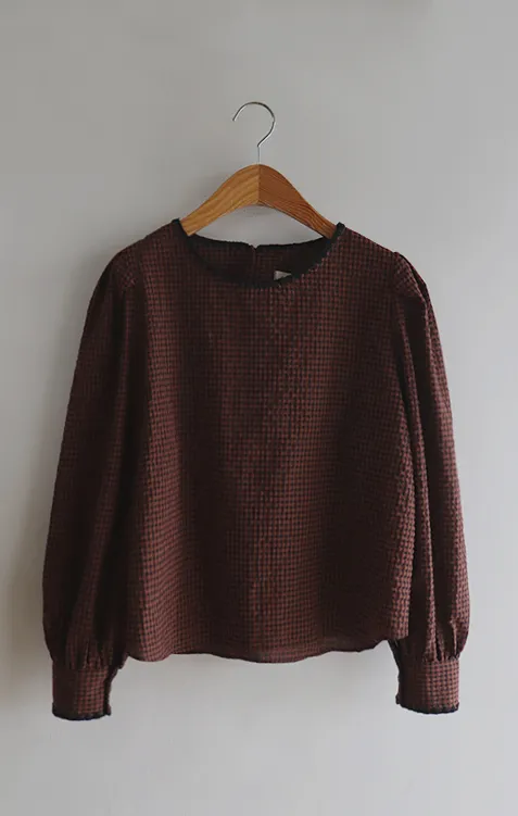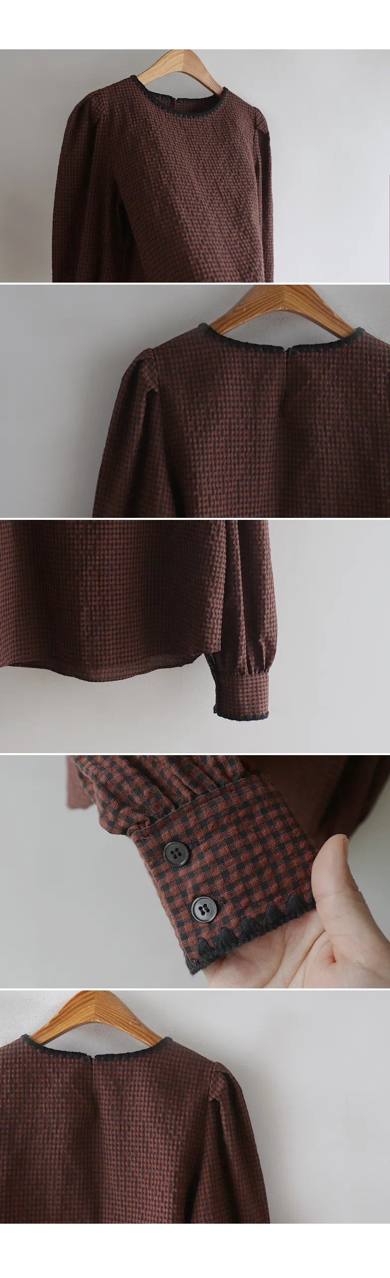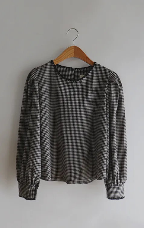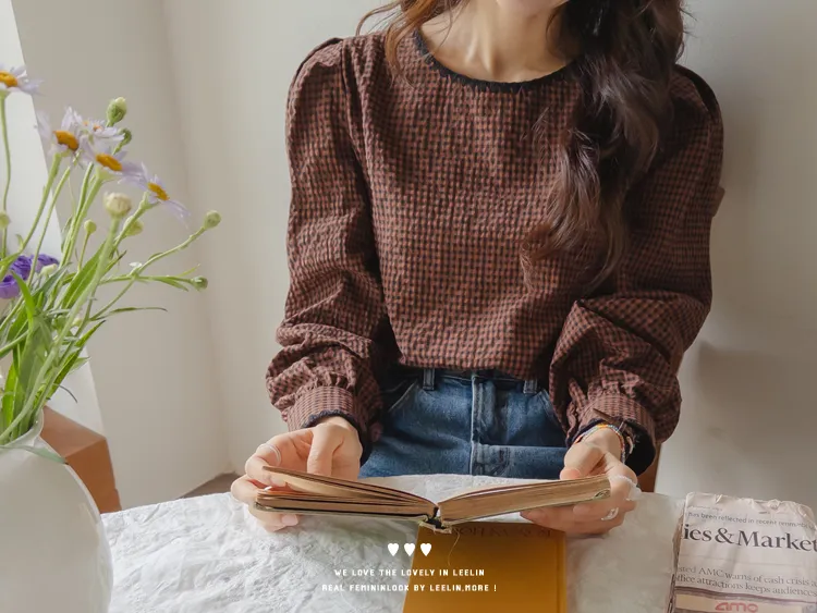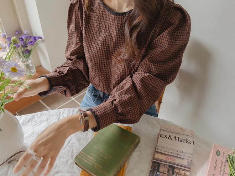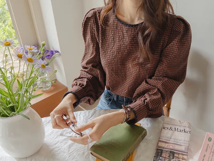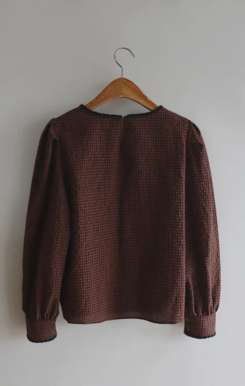 波浪刺繡邊肩線抽褶皺摺格紋上衣