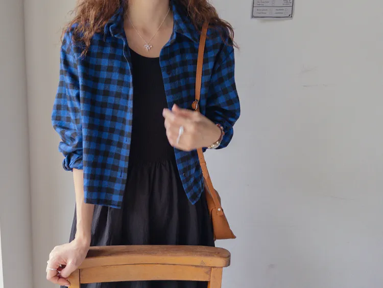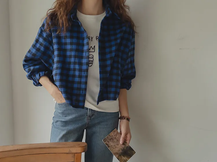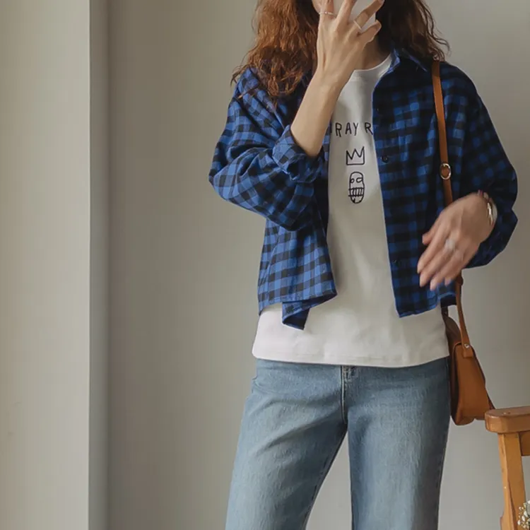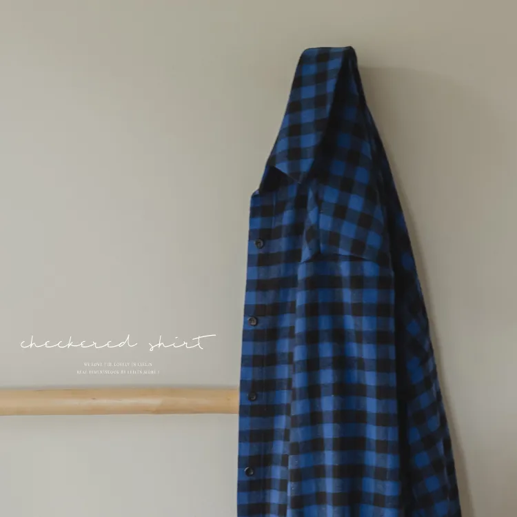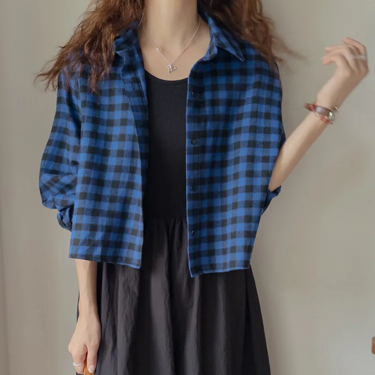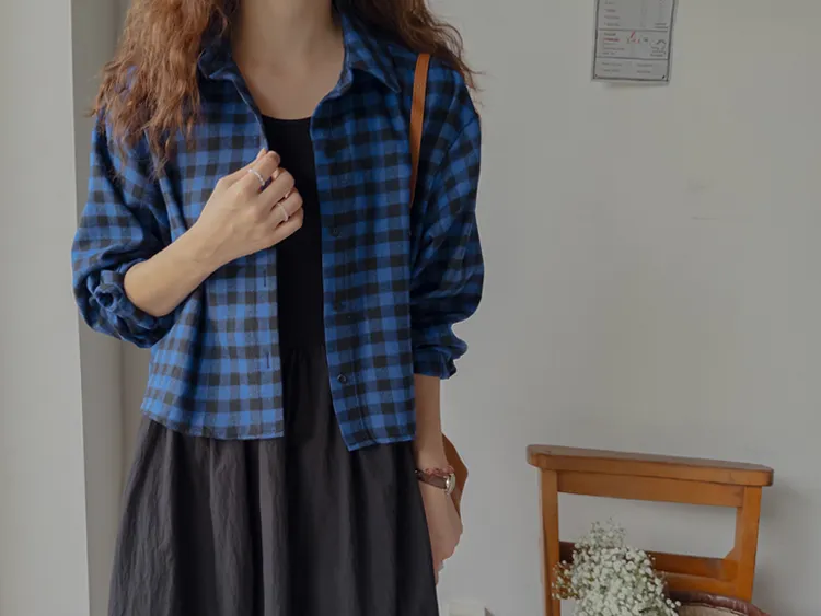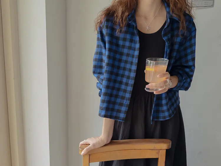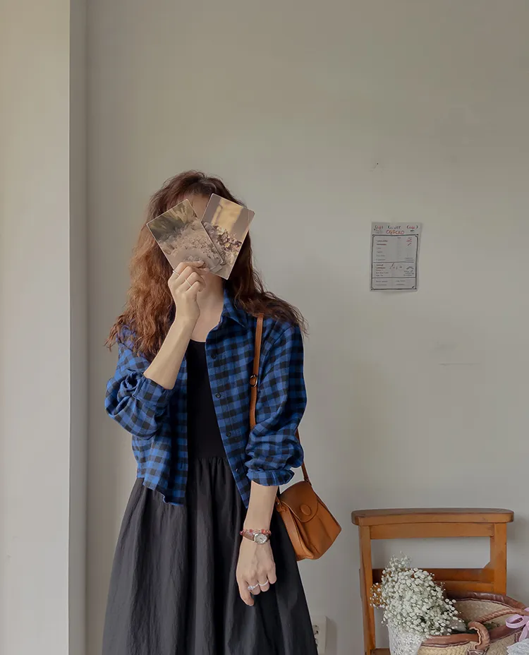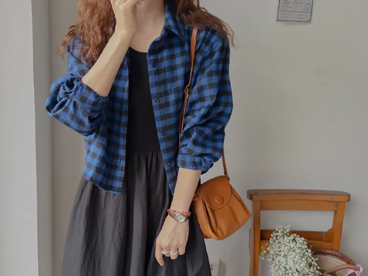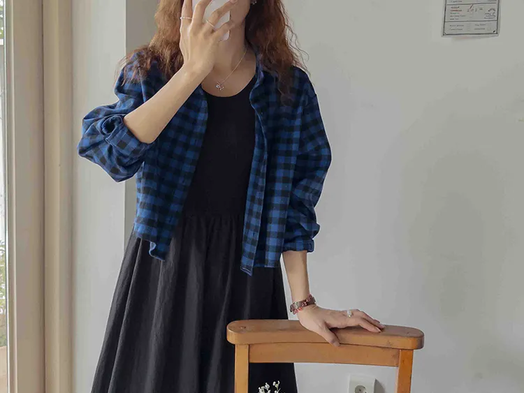 【成為亮點的格紋襯衫♥】【外面的桃色拉絲材質,很有觸感~】【即使沒有任何特效,格紋圖案也很有存在感!半短款,顯腿長】