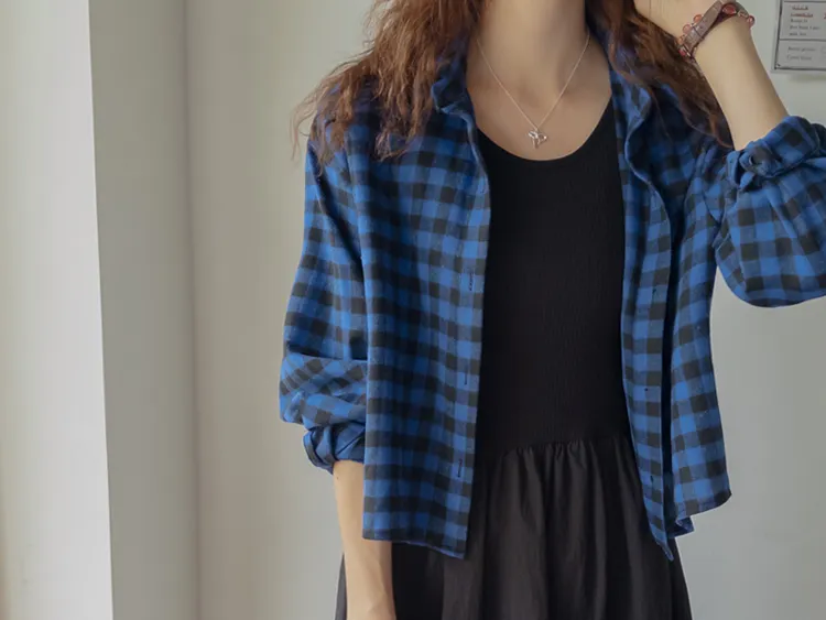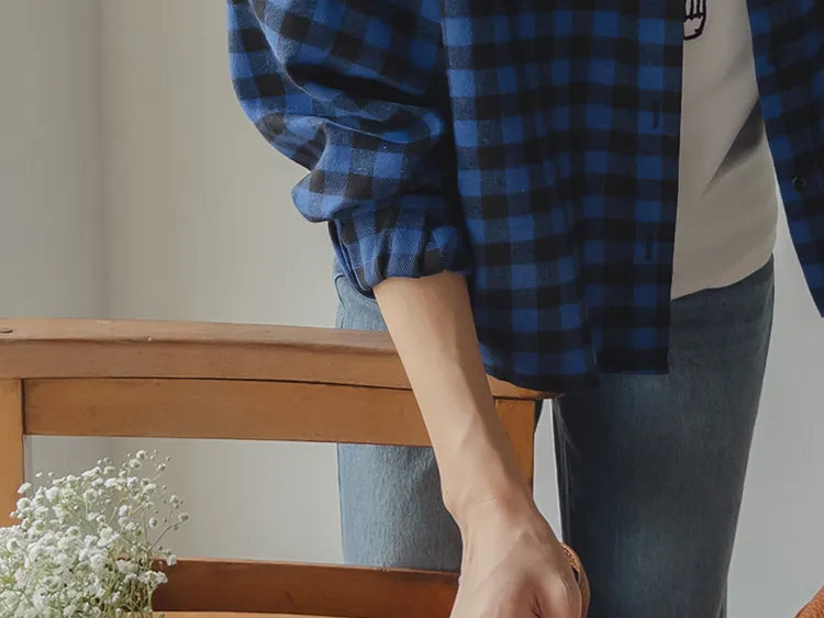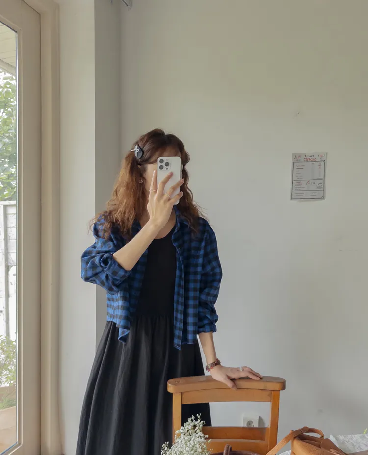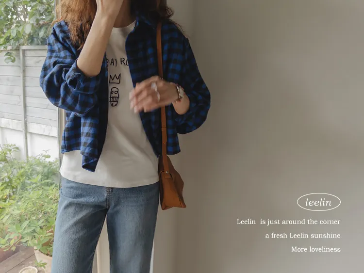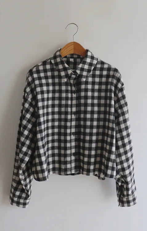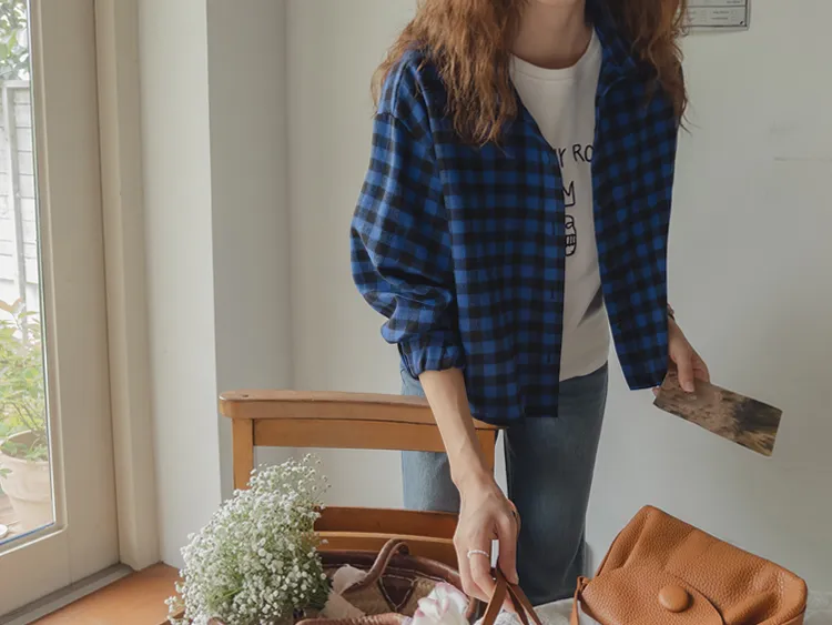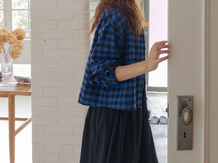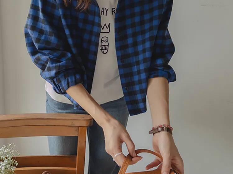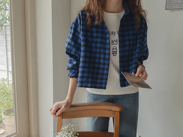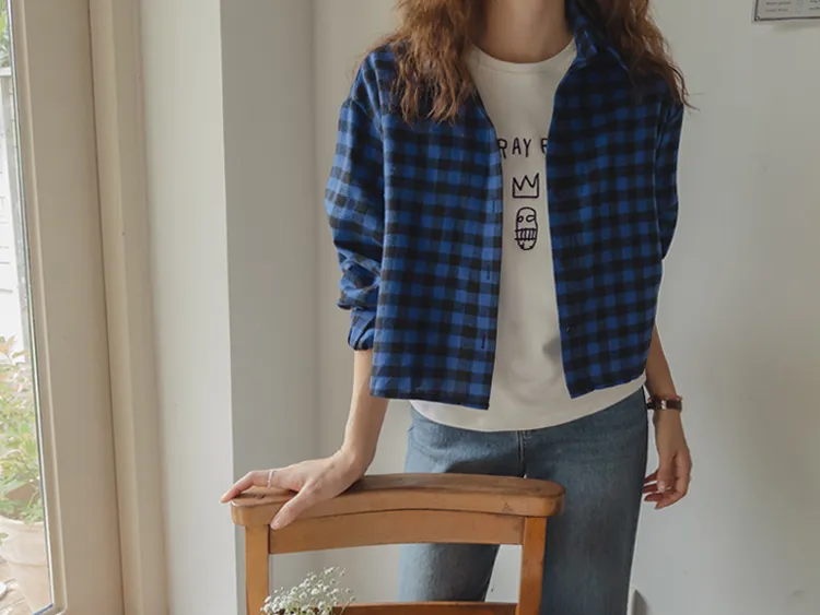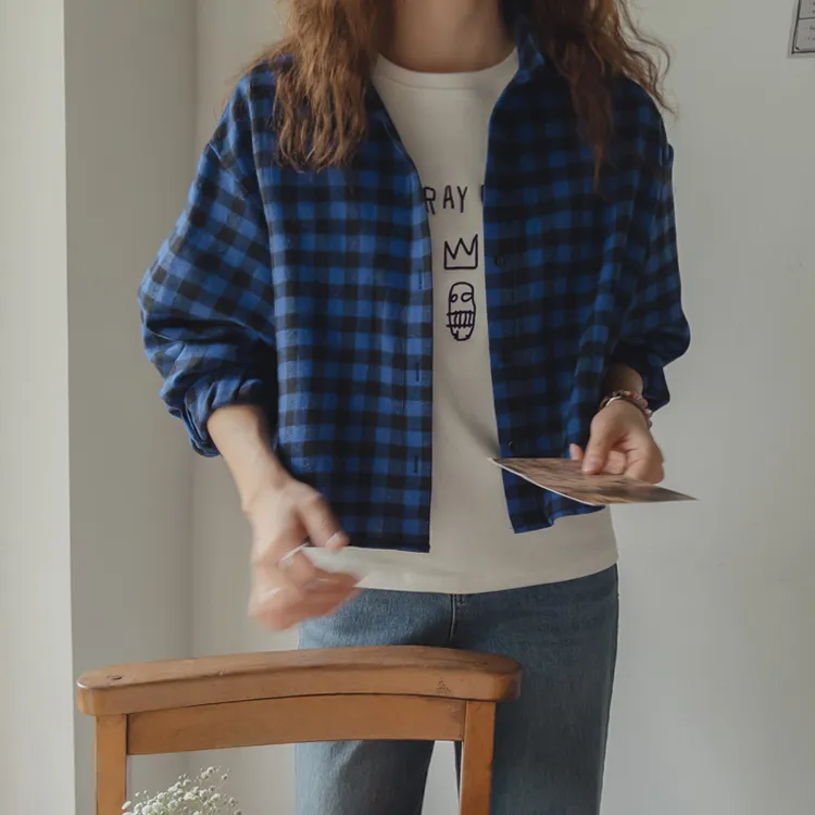【成為亮點的格紋襯衫♥】【外面的桃色拉絲材質,很有觸感~】【即使沒有任何特效,格紋圖案也很有存在感!半短款,顯腿長】