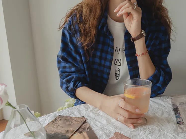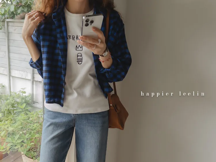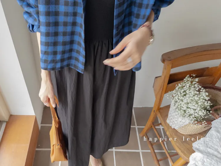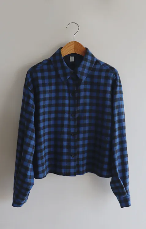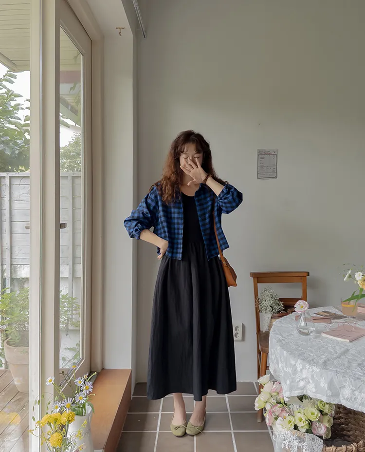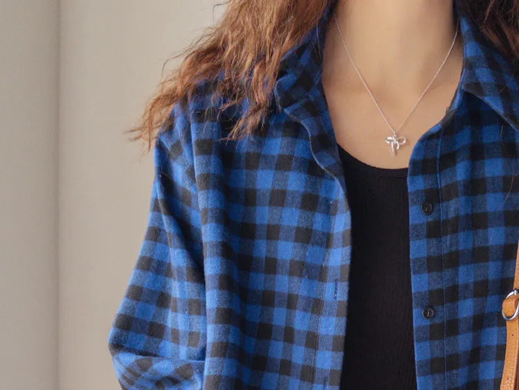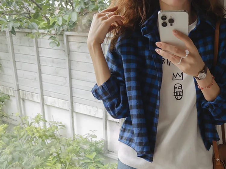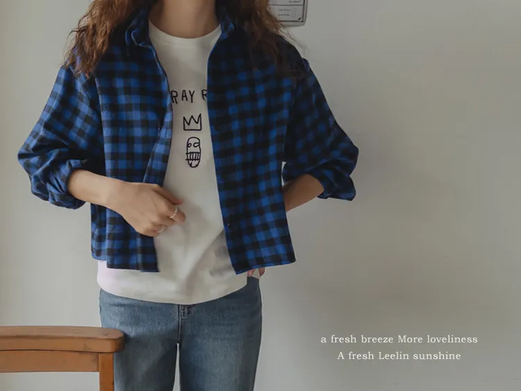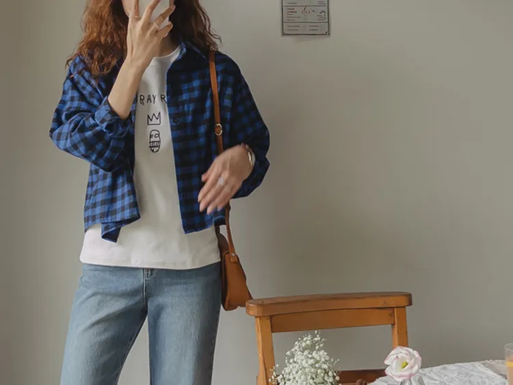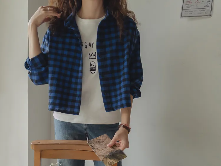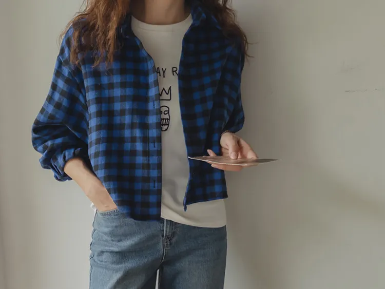 【成為亮點的格紋襯衫♥】【外面的桃色拉絲材質,很有觸感~】【即使沒有任何特效,格紋圖案也很有存在感!半短款,顯腿長】