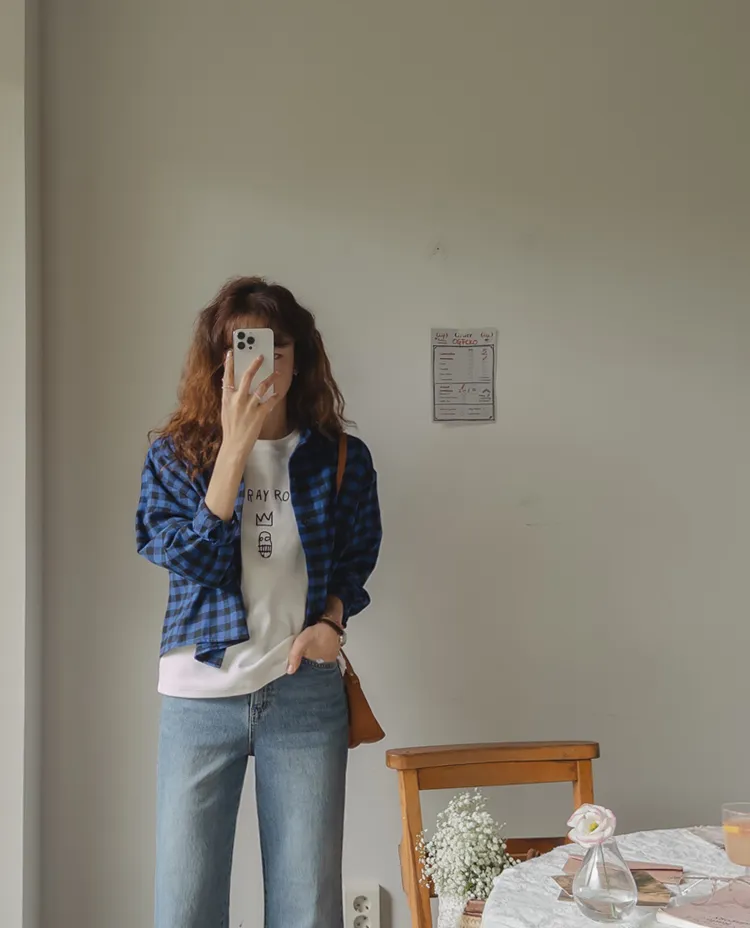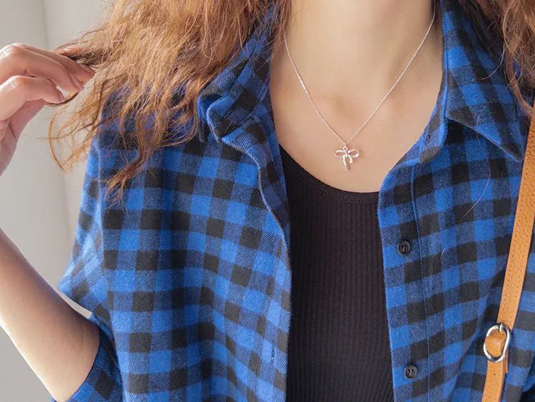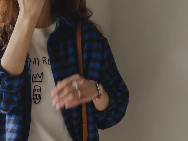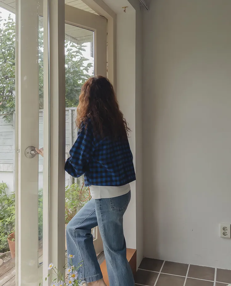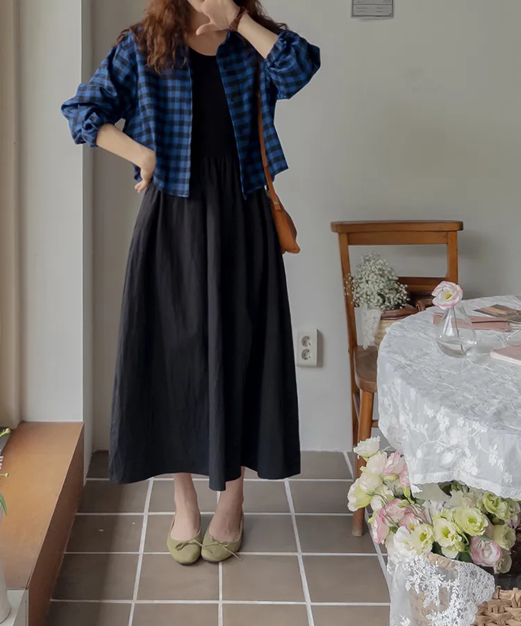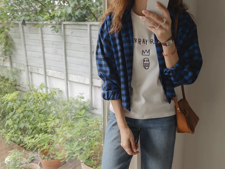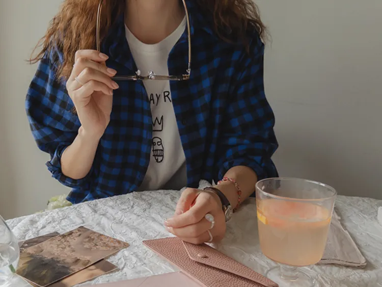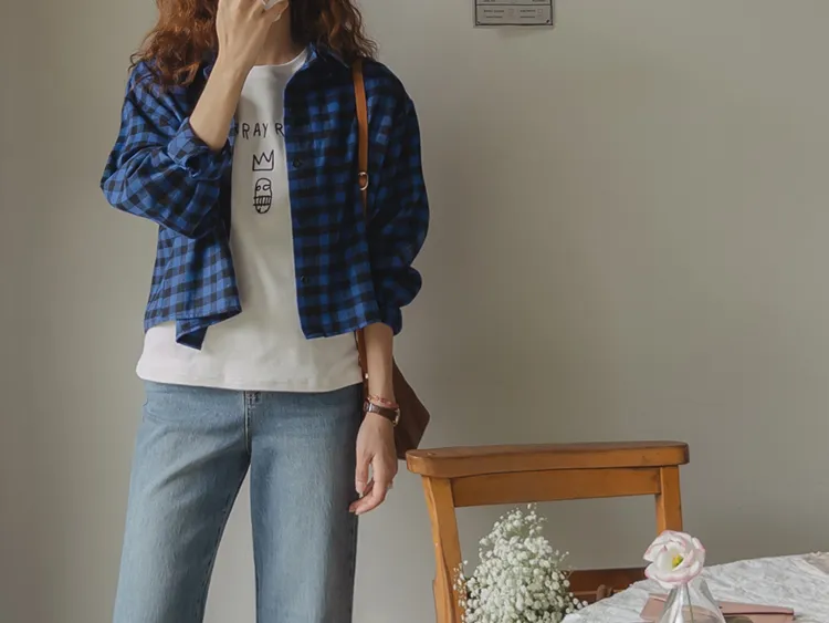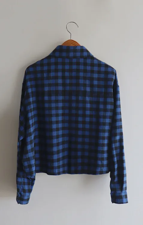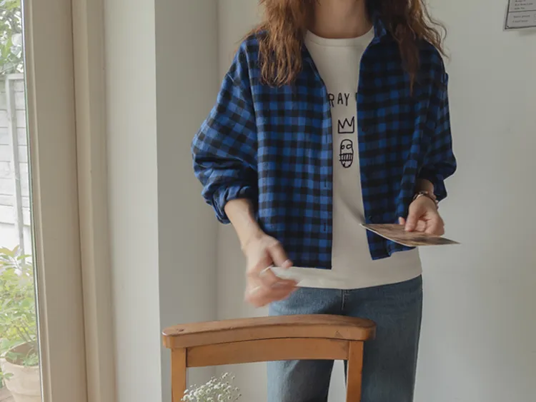【成為亮點的格紋襯衫♥】【外面的桃色拉絲材質,很有觸感~】【即使沒有任何特效,格紋圖案也很有存在感!半短款,顯腿長】