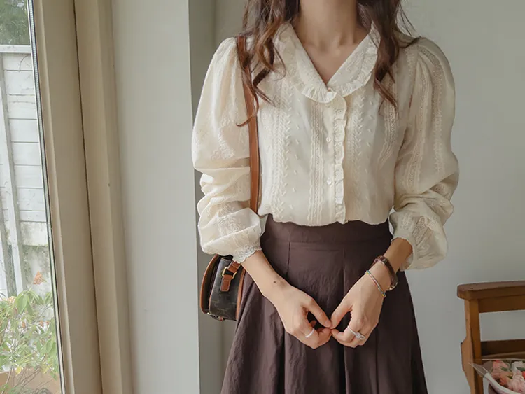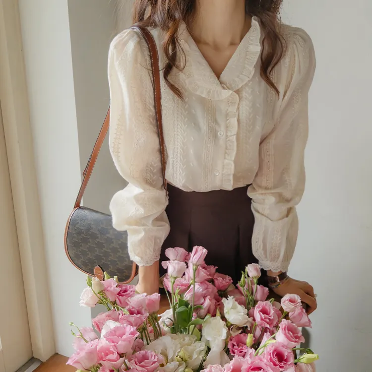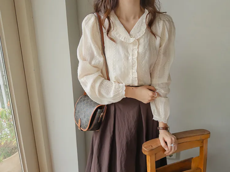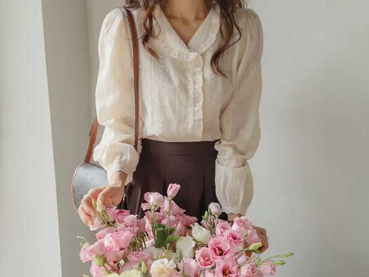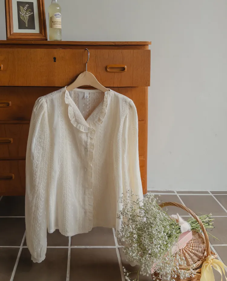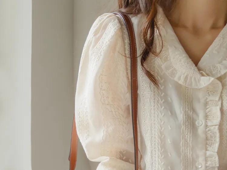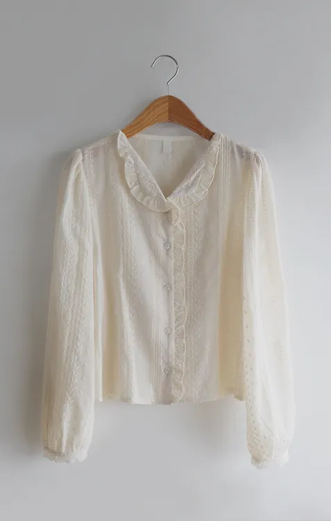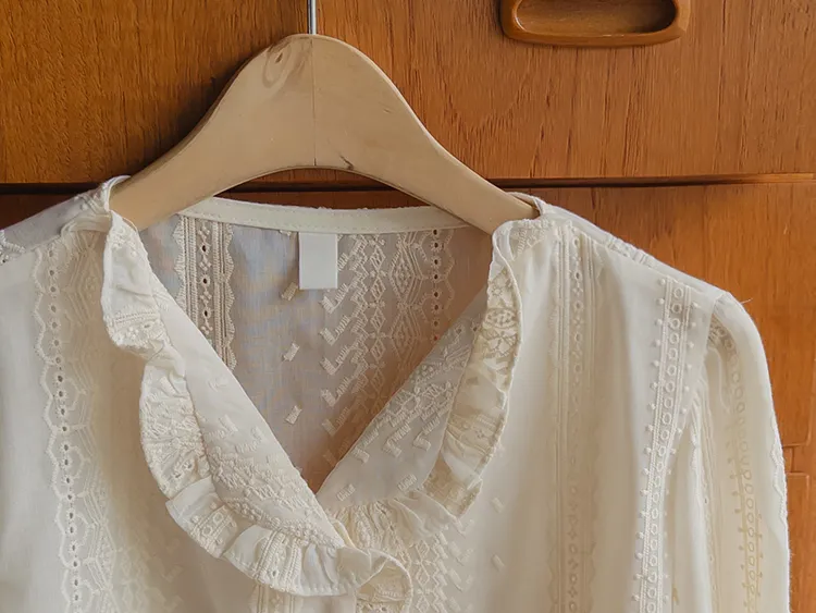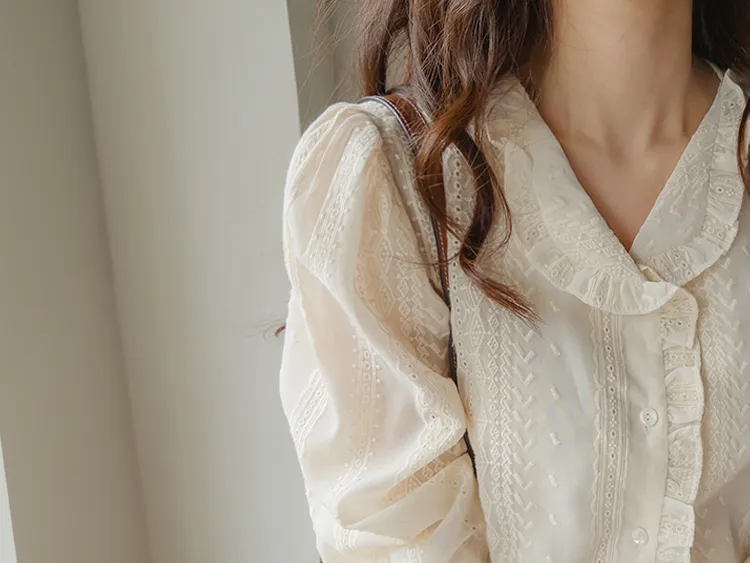 浪漫摺邊領蕾絲刺繡排扣上衣