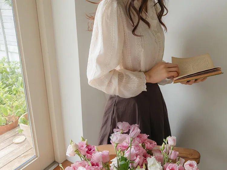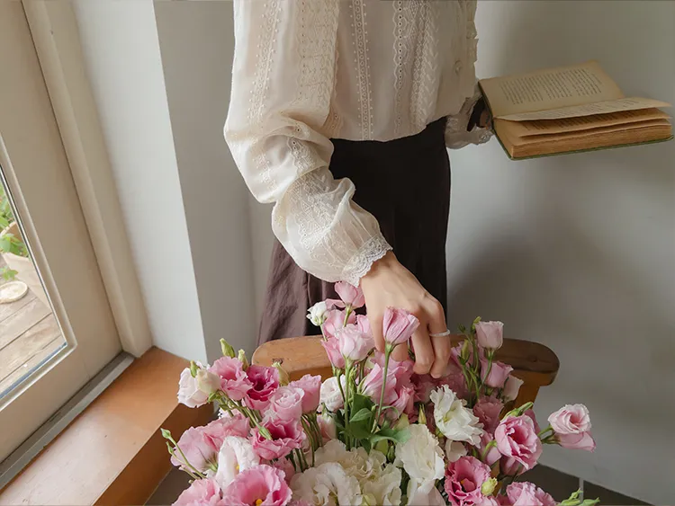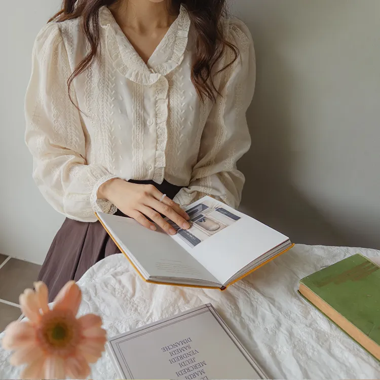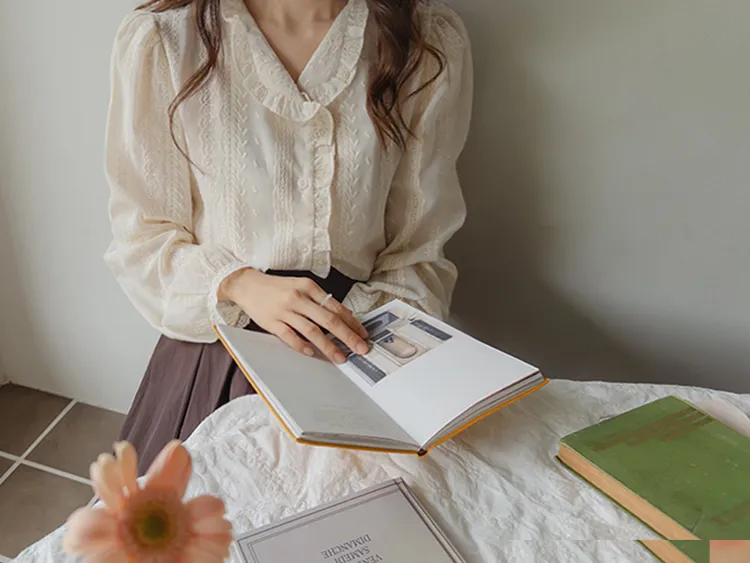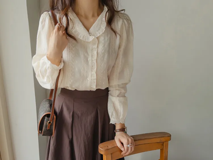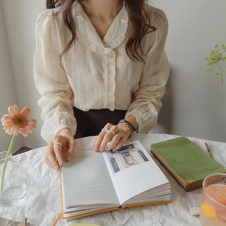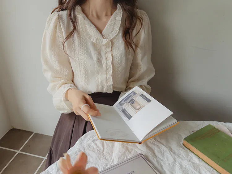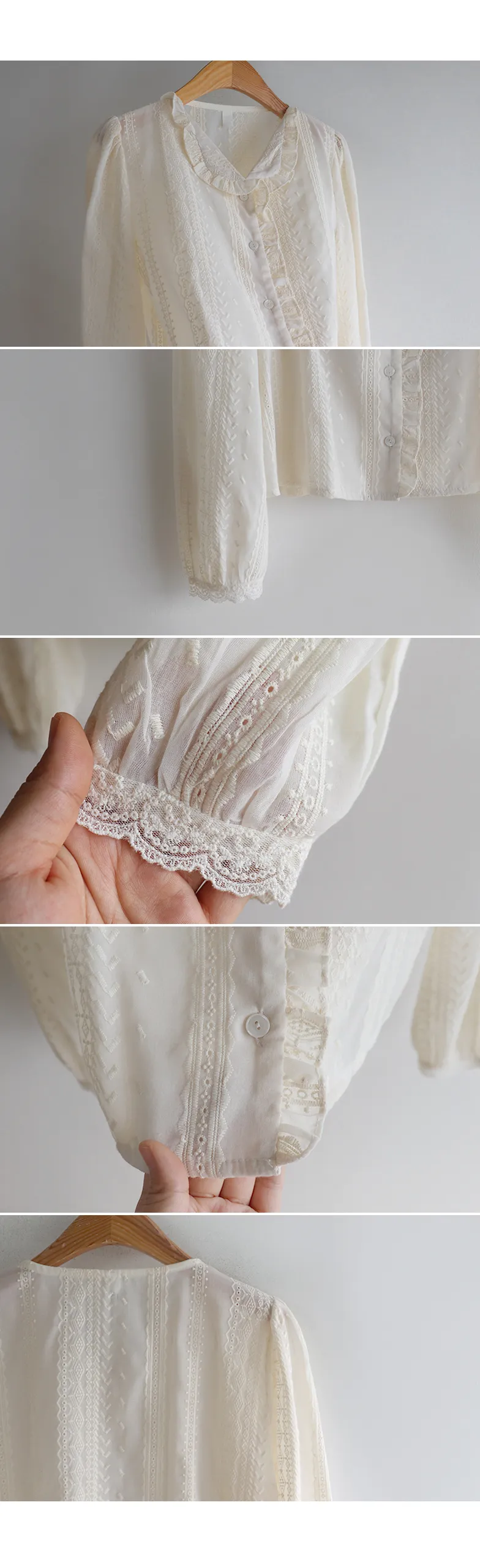 浪漫摺邊領蕾絲刺繡排扣上衣