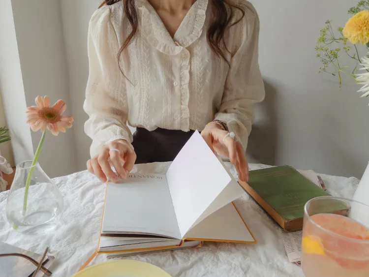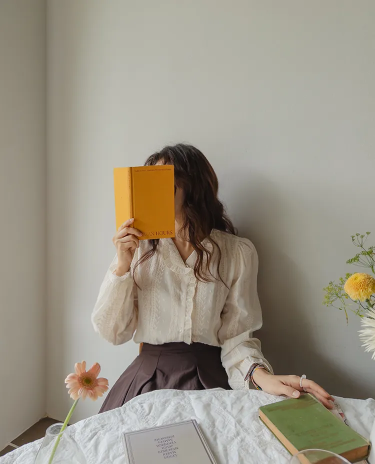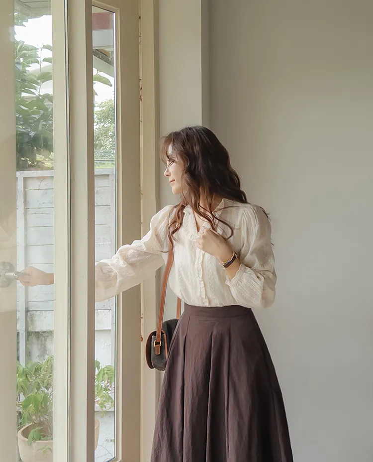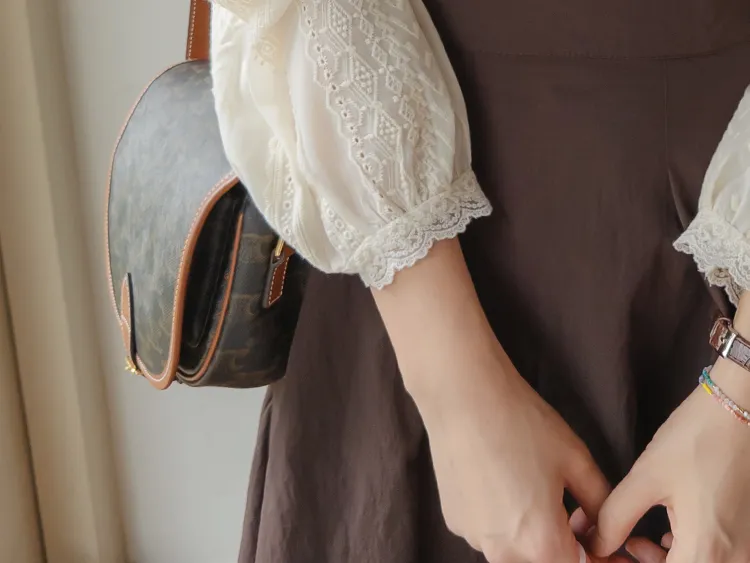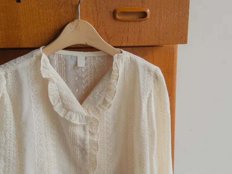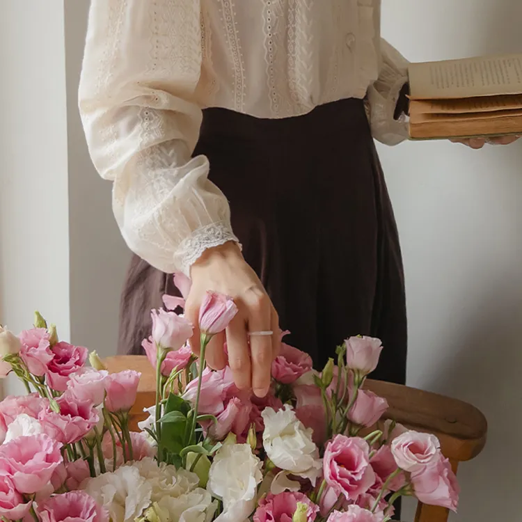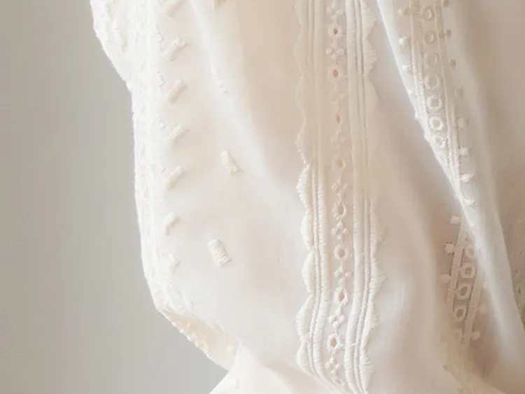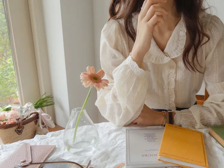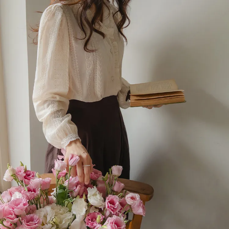 浪漫摺邊領蕾絲刺繡排扣上衣