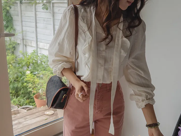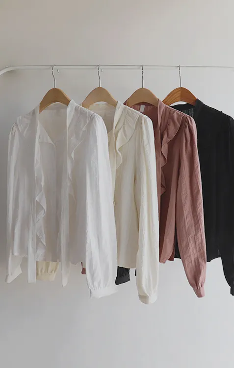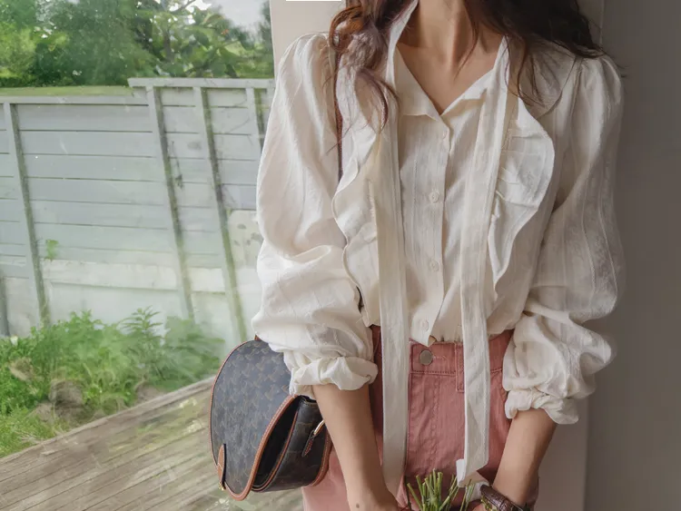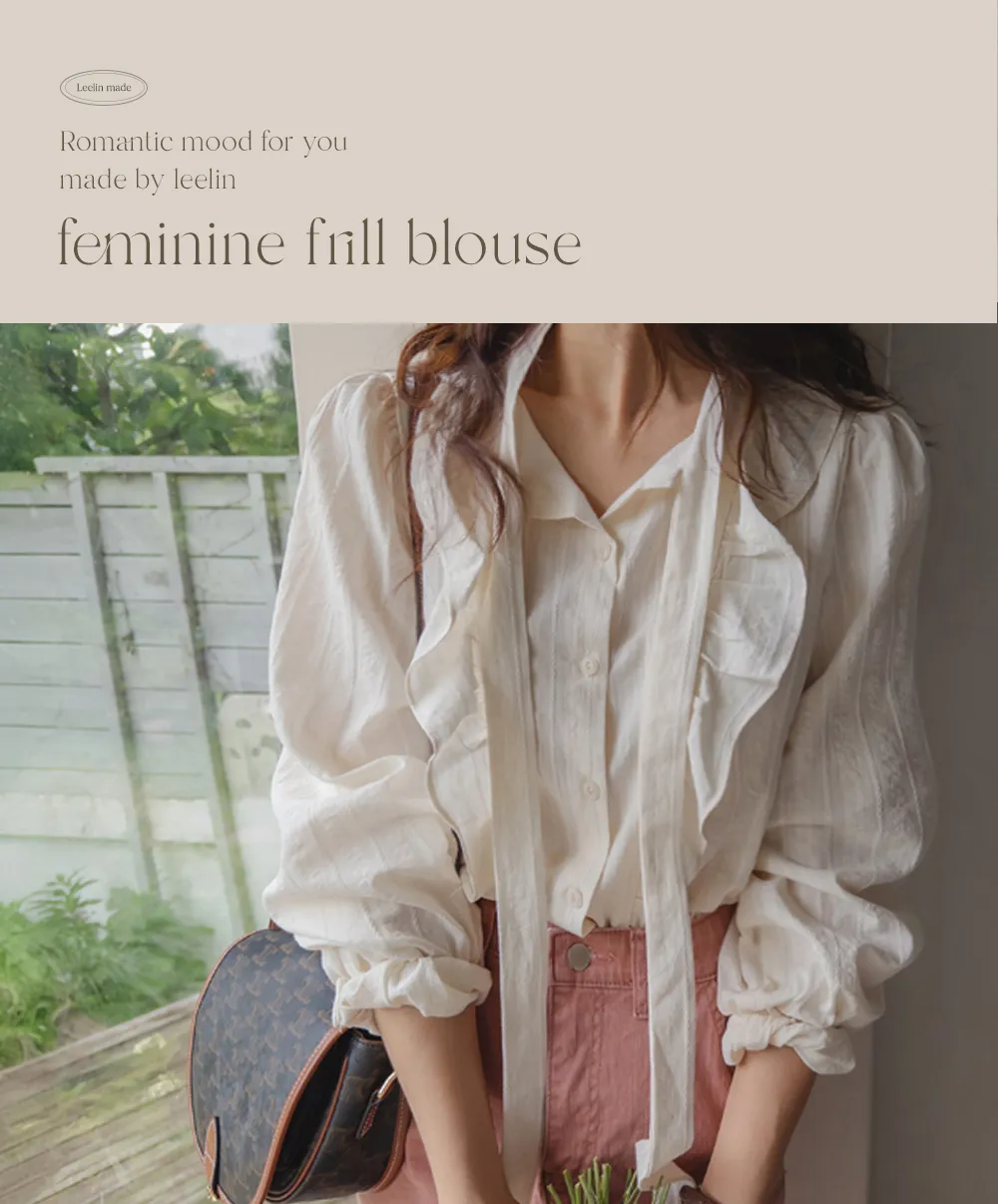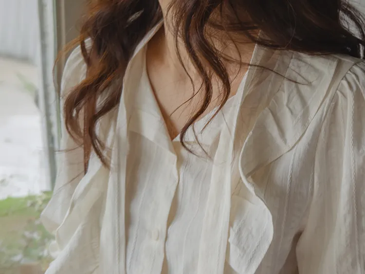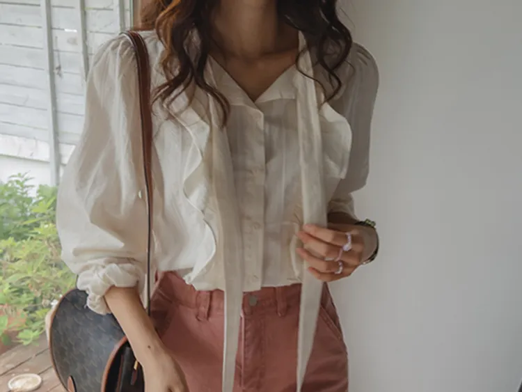 柔美荷葉摺邊綁帶設計排扣上衣