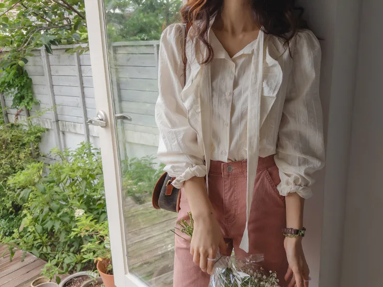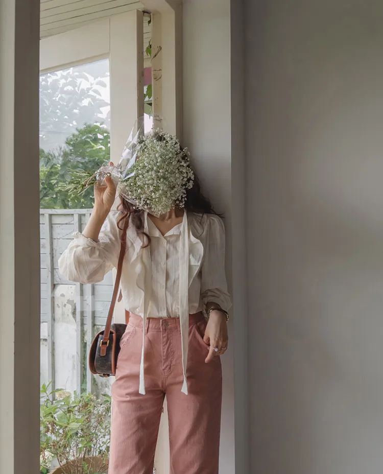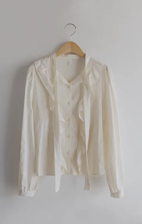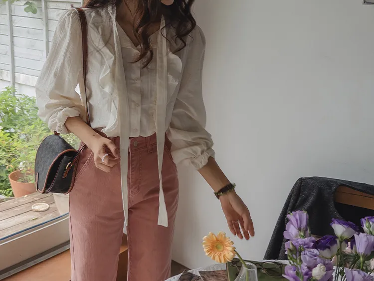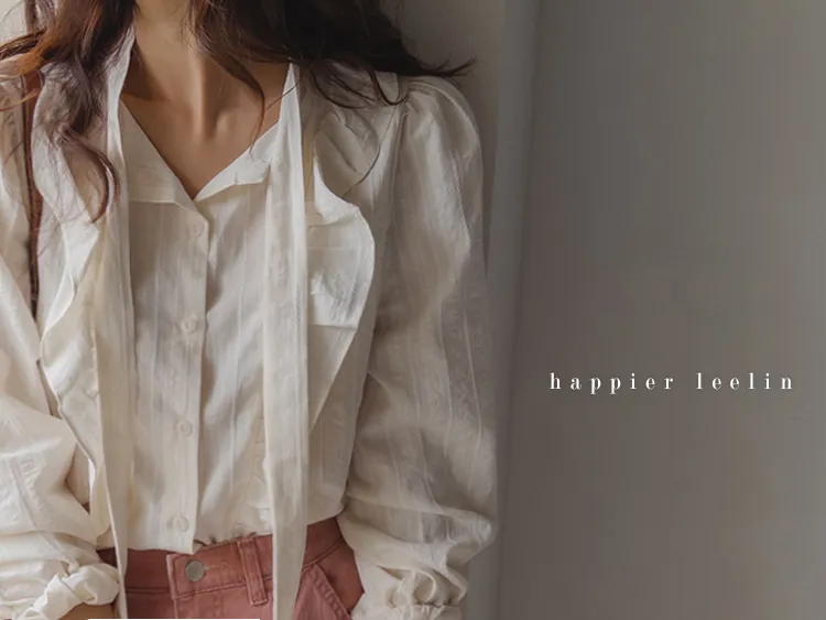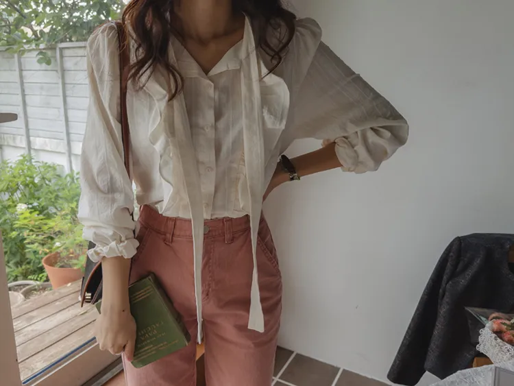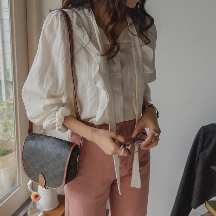 柔美荷葉摺邊綁帶設計排扣上衣