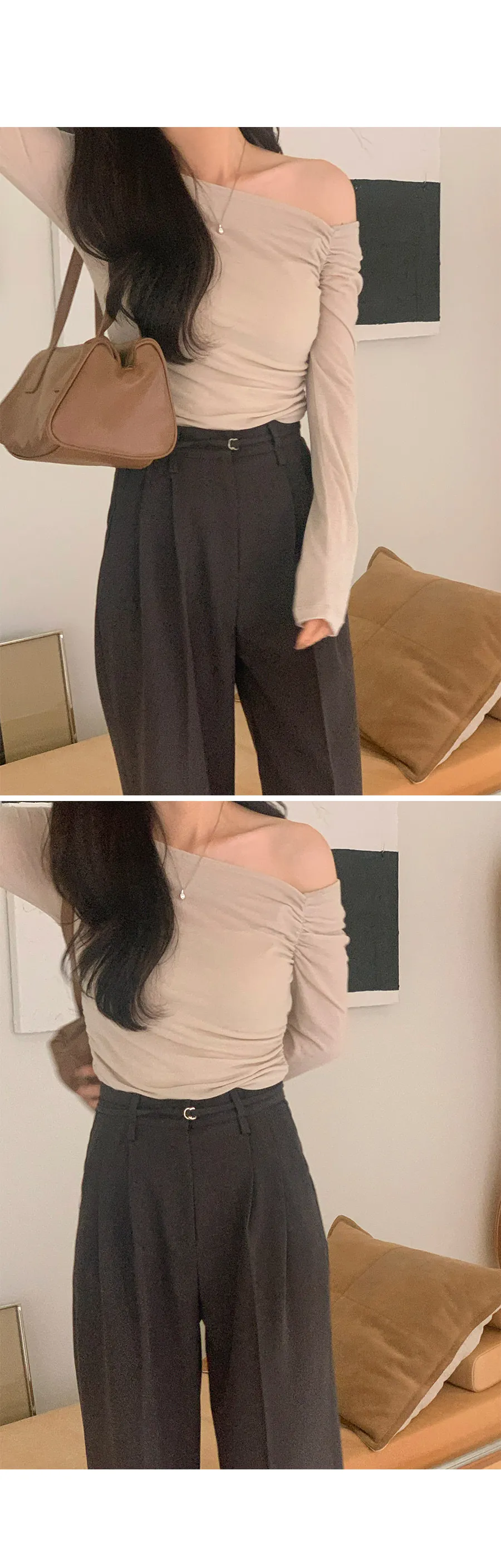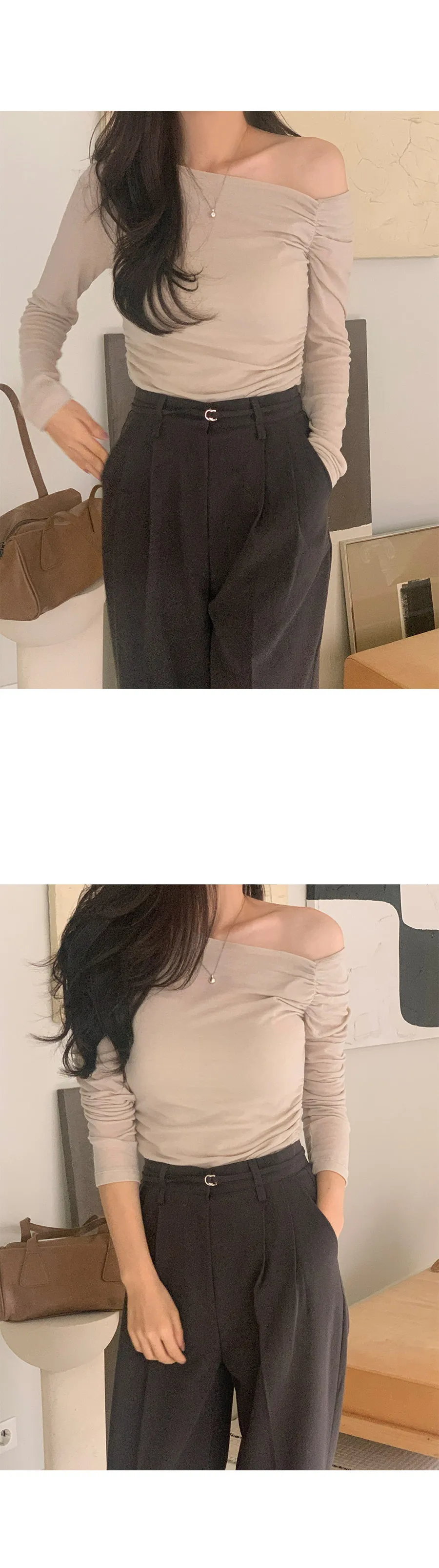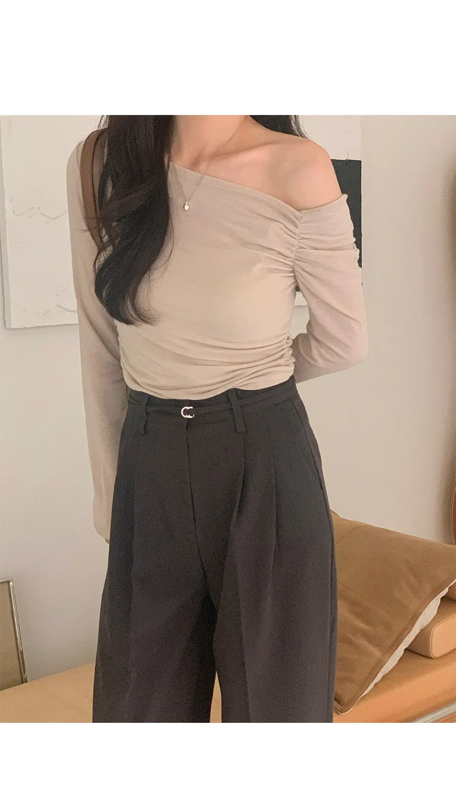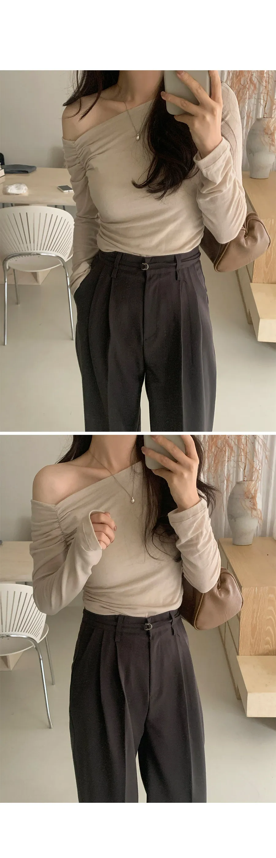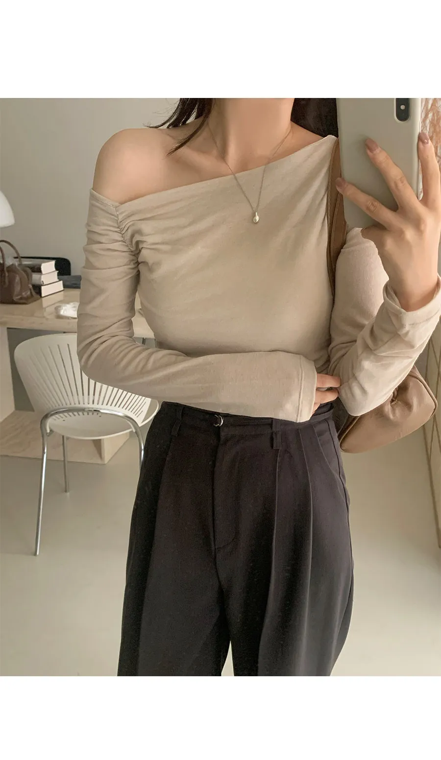 柔美不對稱斜角剪裁抽褶露肩上衣