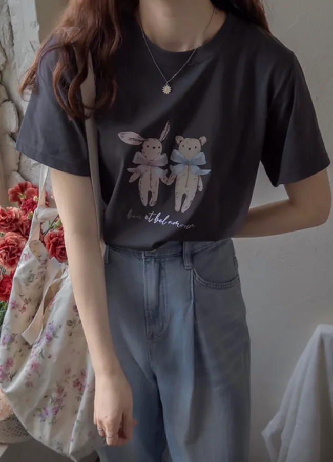 可愛兔子熊熊印花點綴蝴蝶結裝飾柔軟短袖上衣