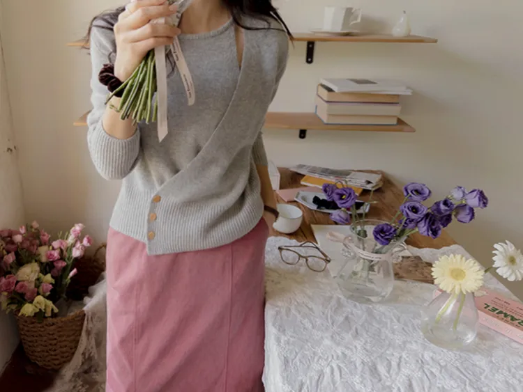 柔美獨特側肩開衩裹身針織上衣 現貨深藍