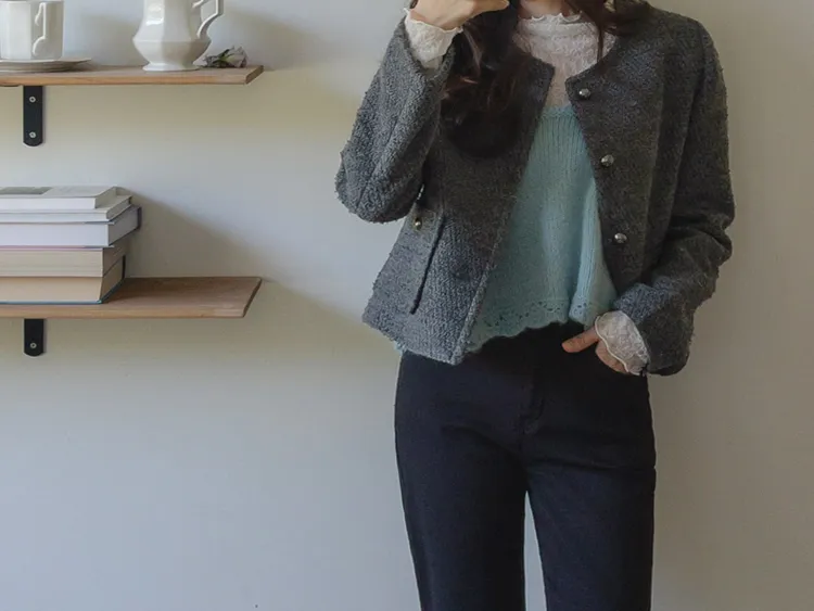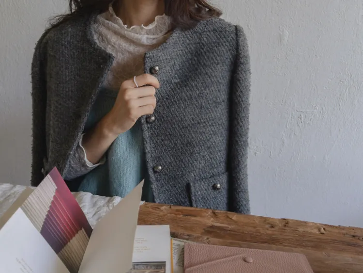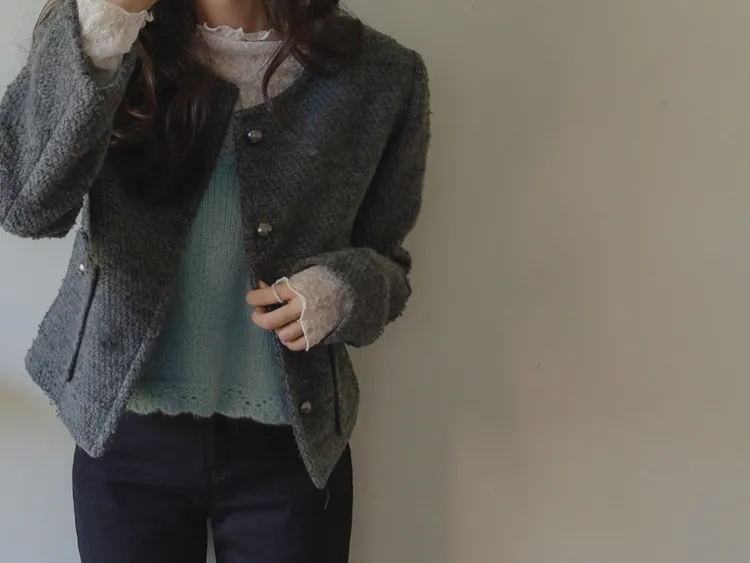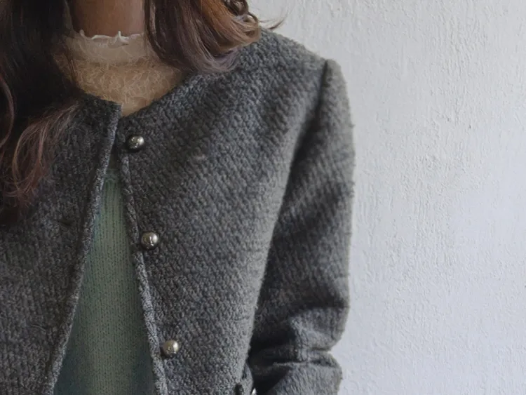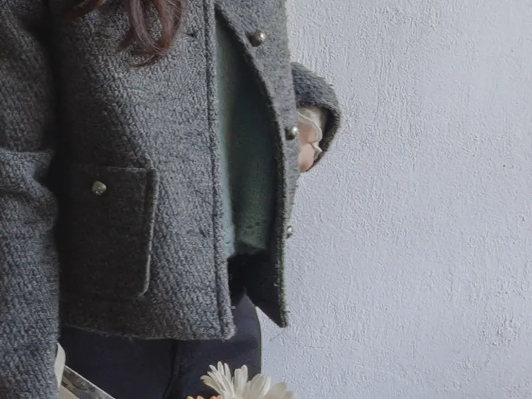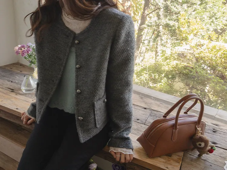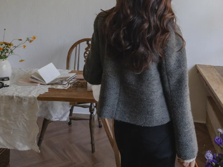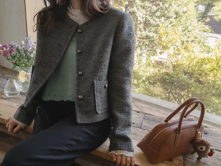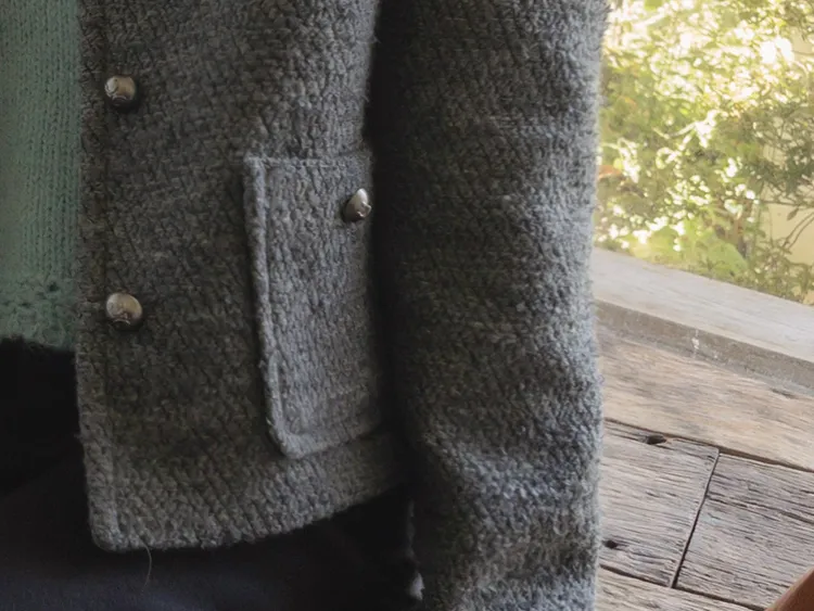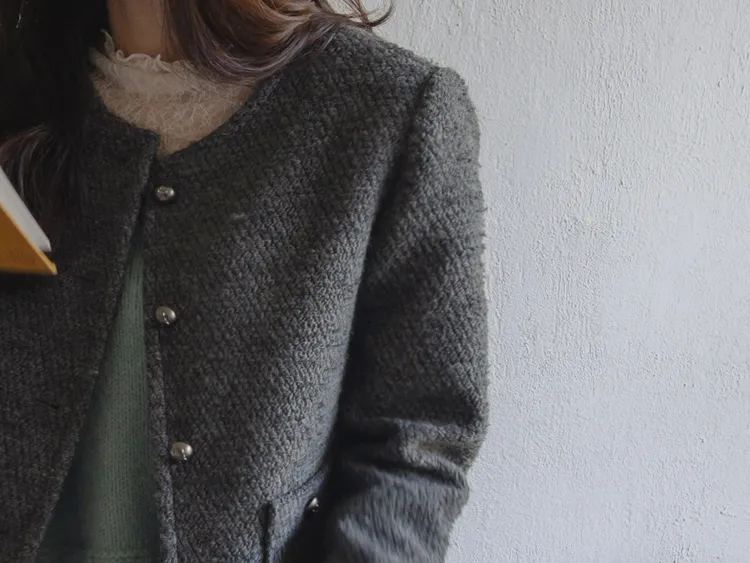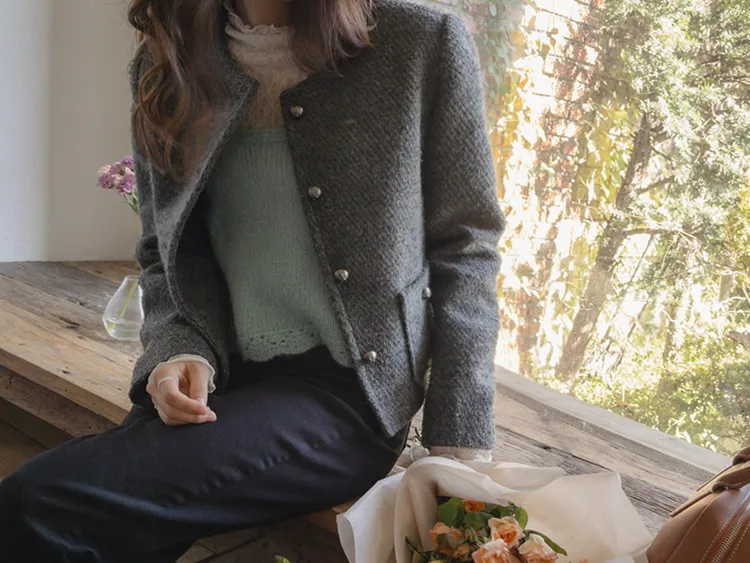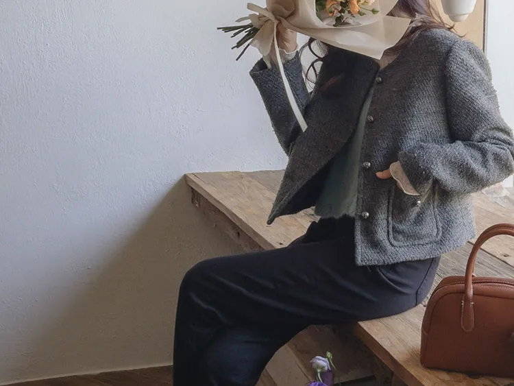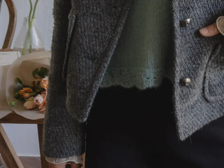 優雅經典魅力奢華霧面金釦花呢外套 深灰色穿搭照