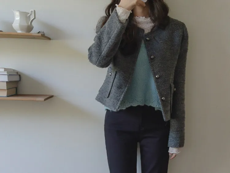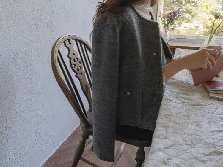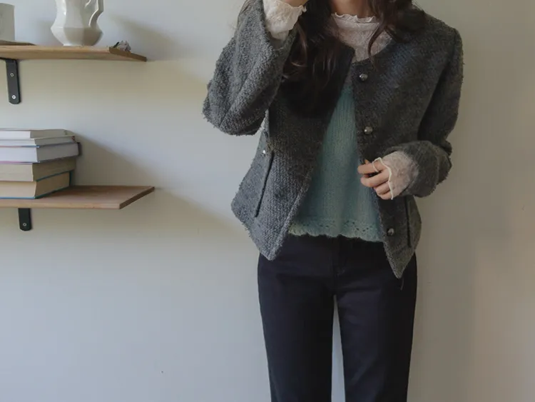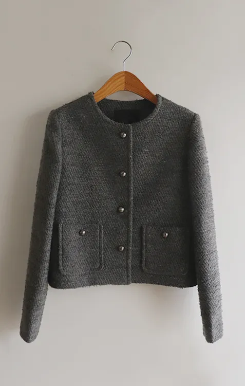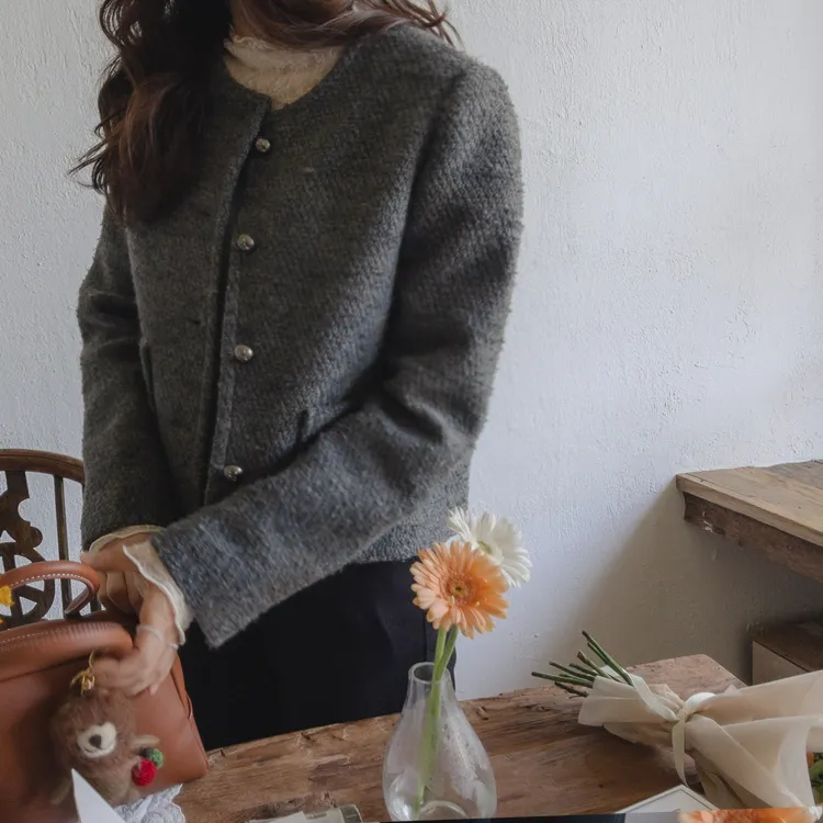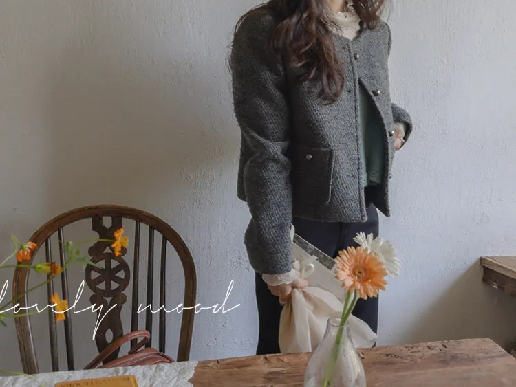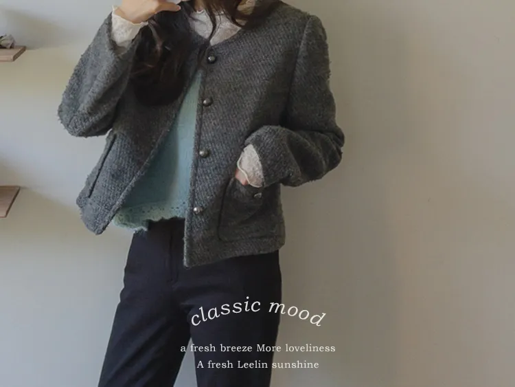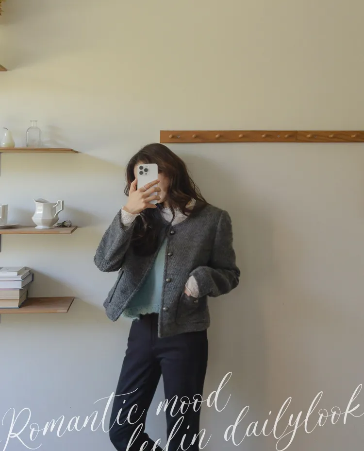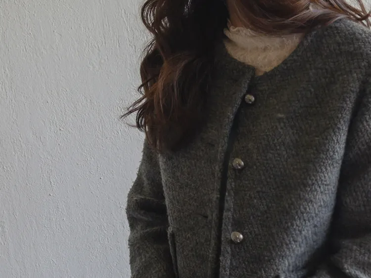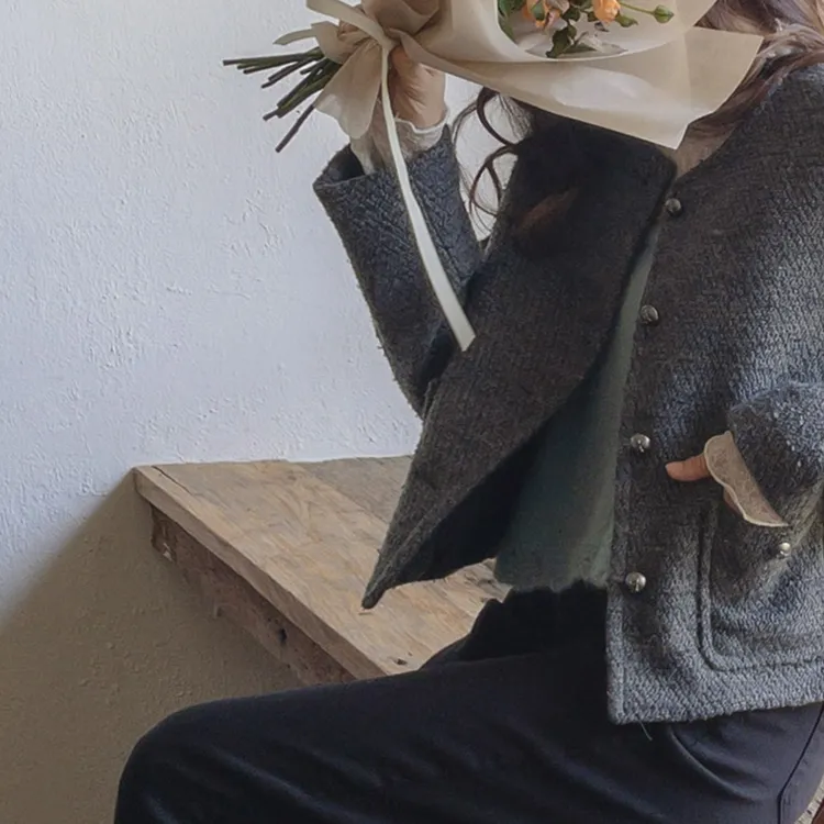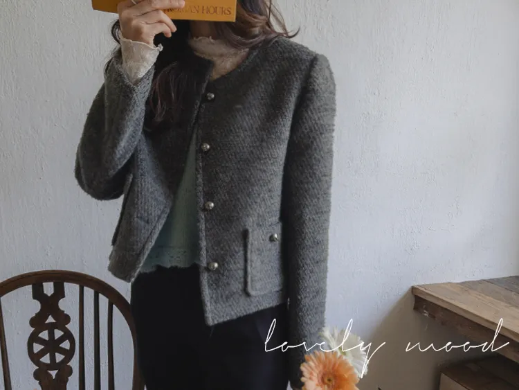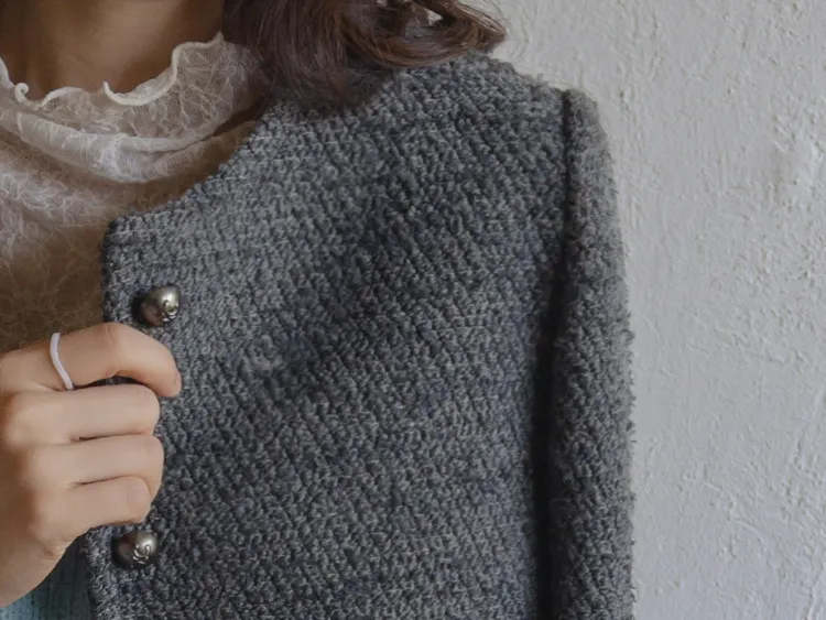 優雅經典魅力奢華霧面金釦花呢外套 深灰色穿搭照