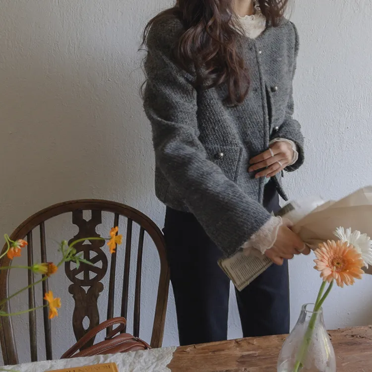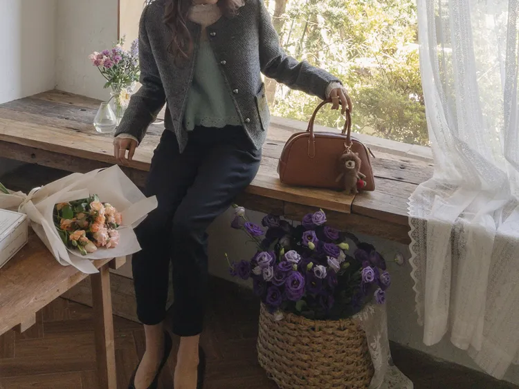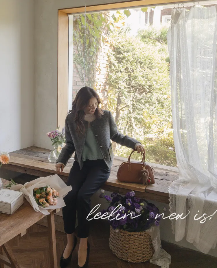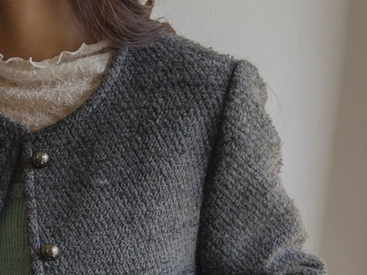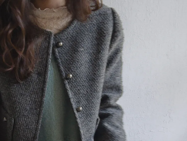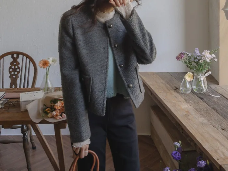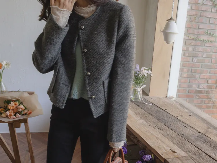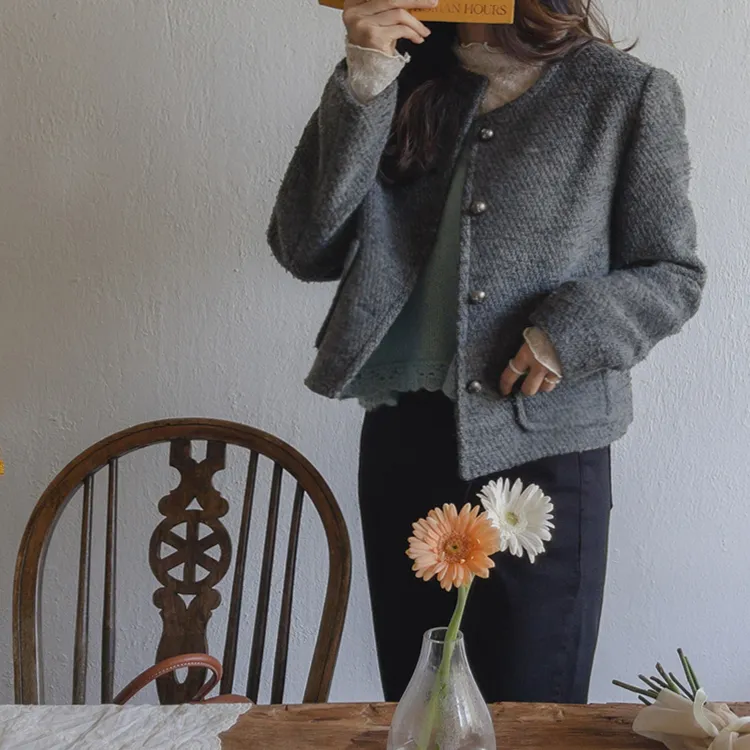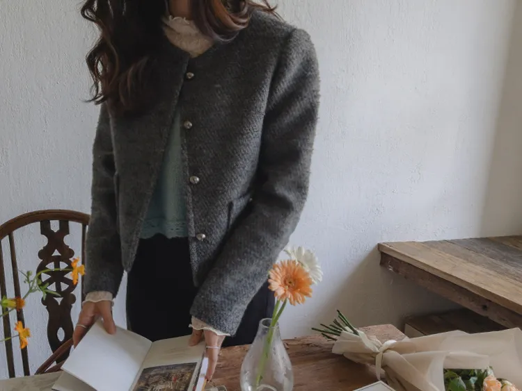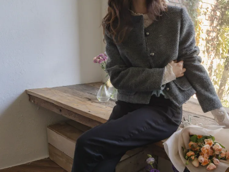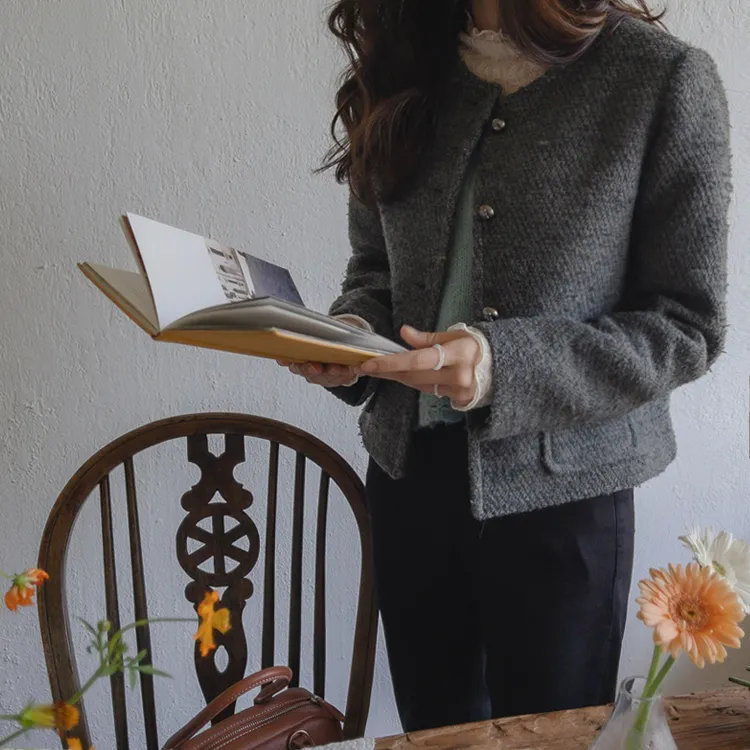 優雅經典魅力奢華霧面金釦花呢外套 深灰色穿搭照