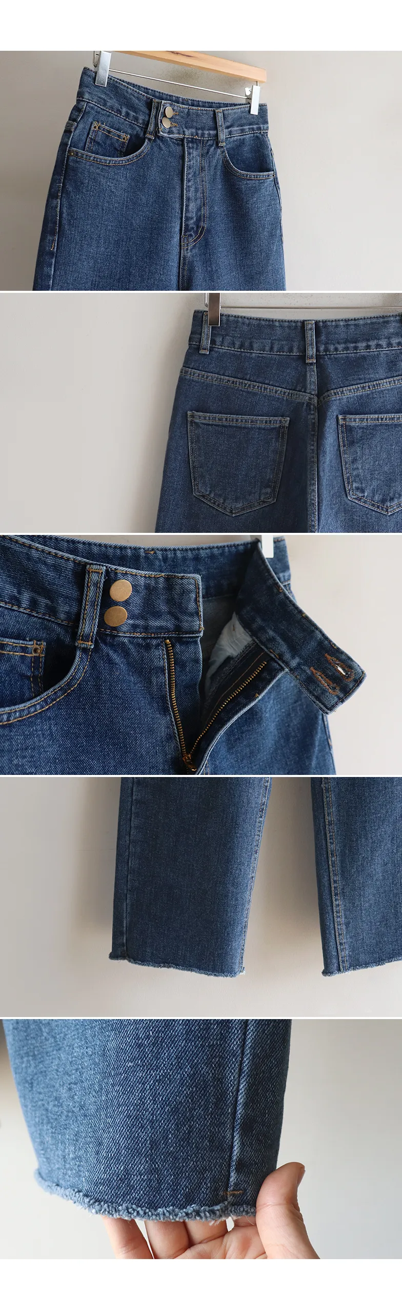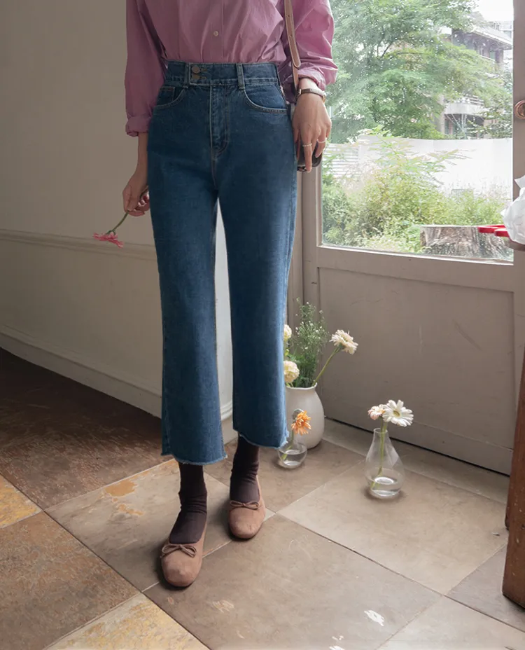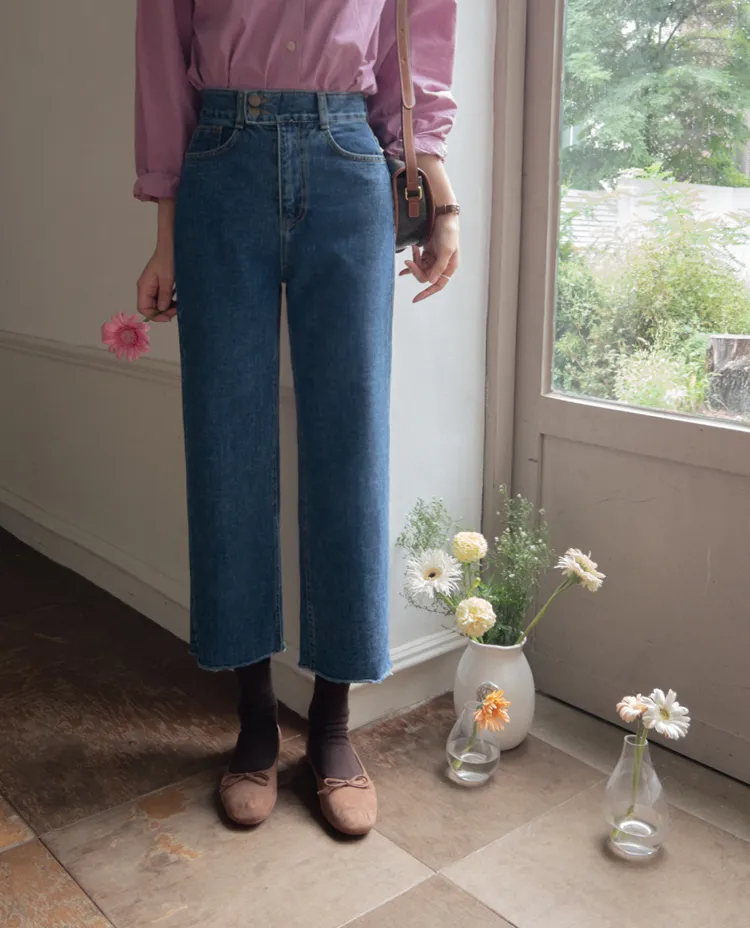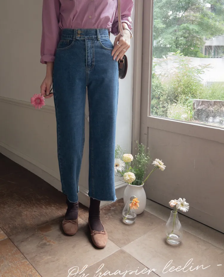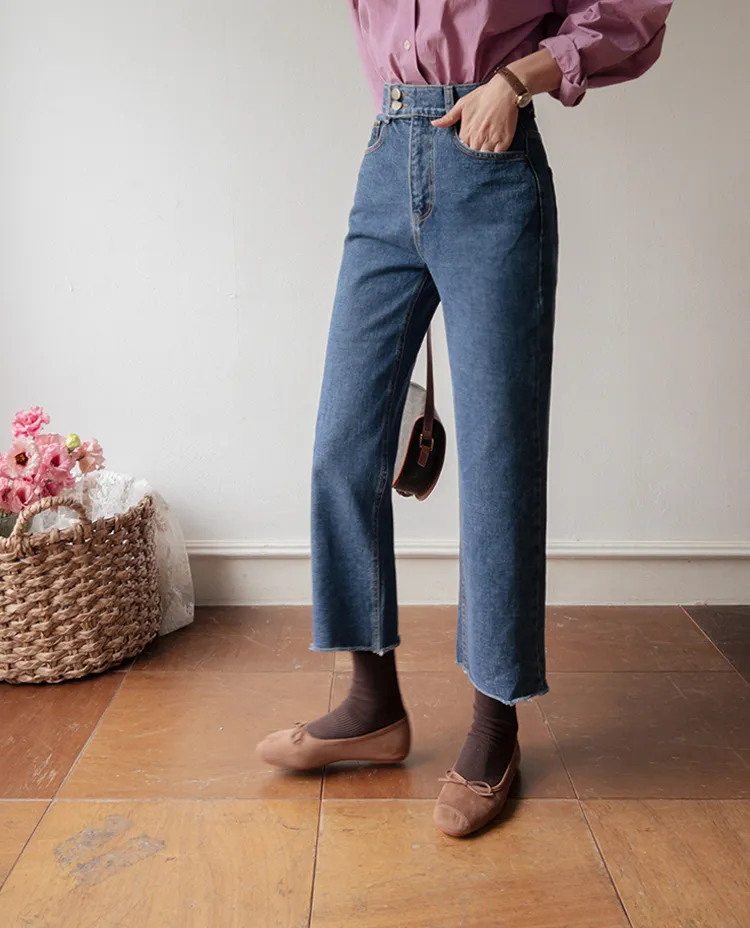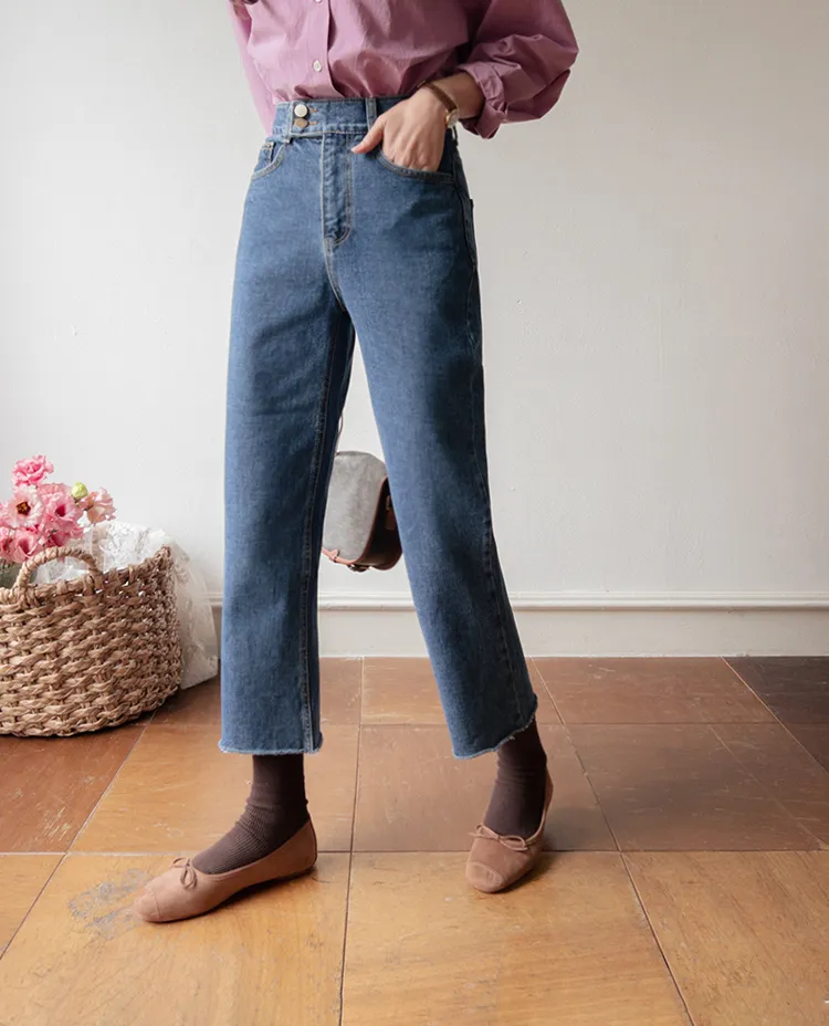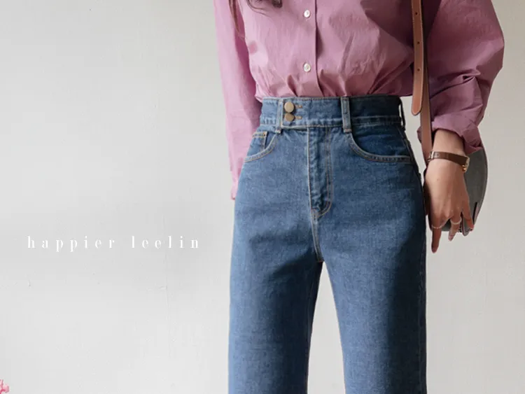 獨特魅力雙扣設計半寬下擺自然剪裁牛仔褲