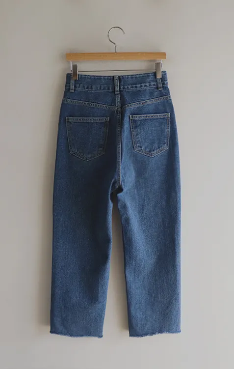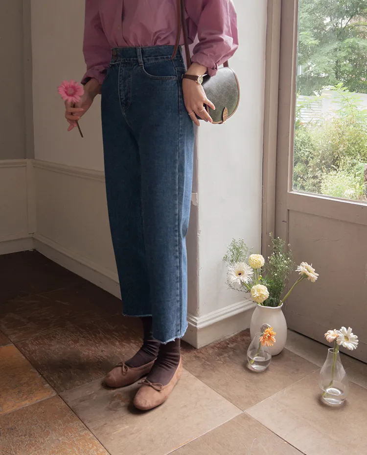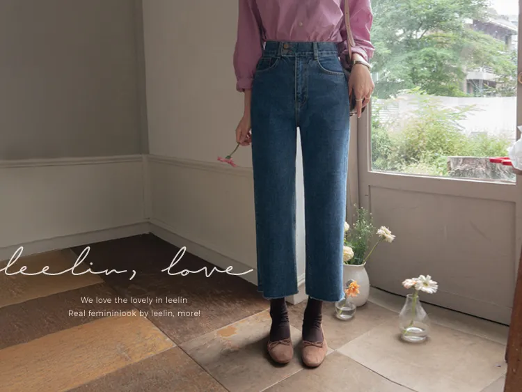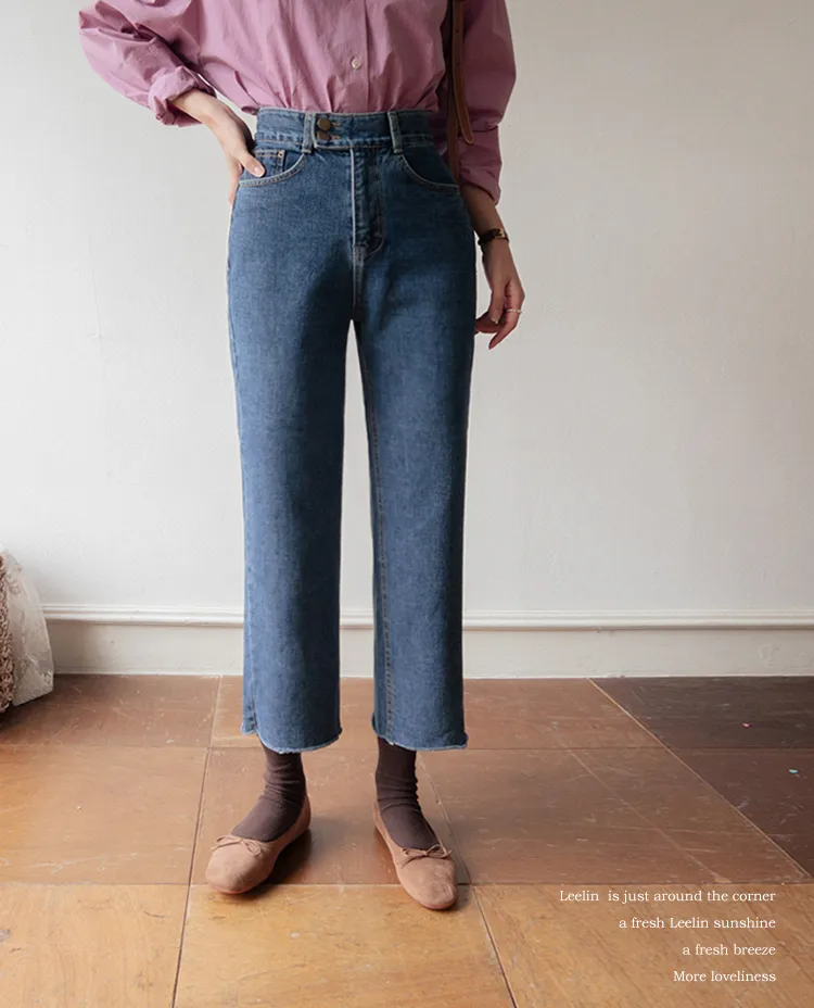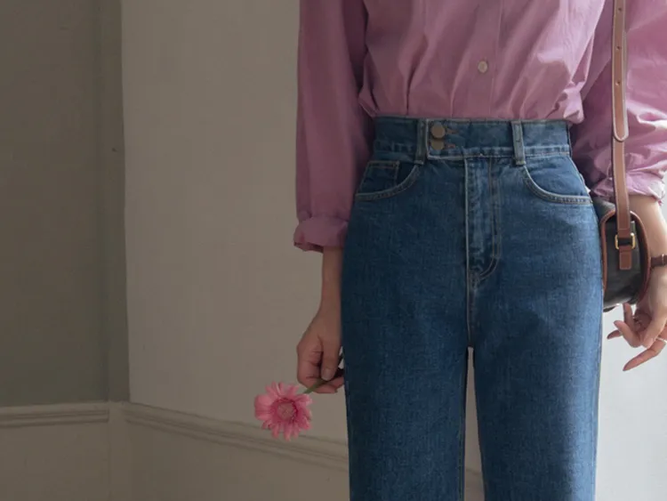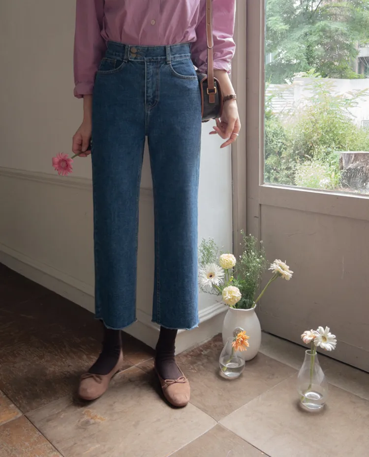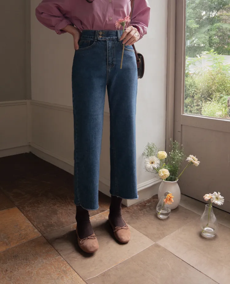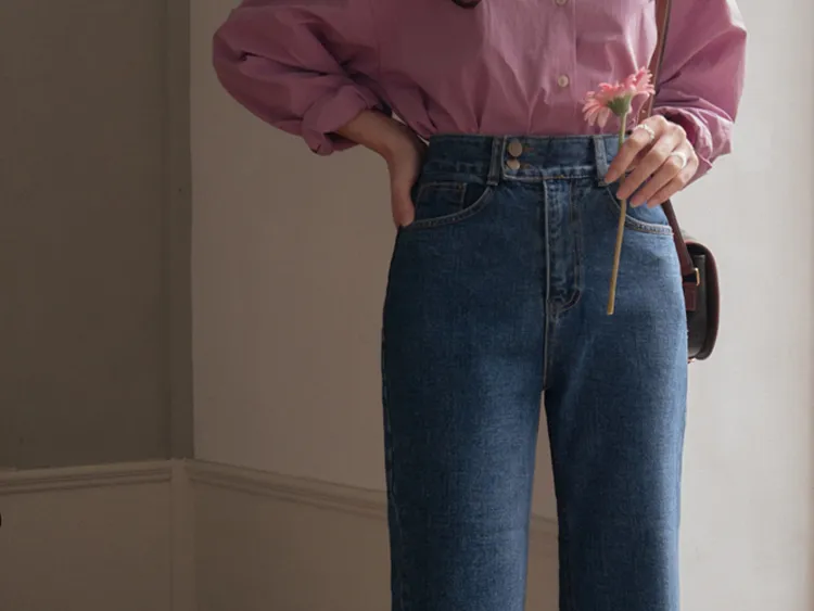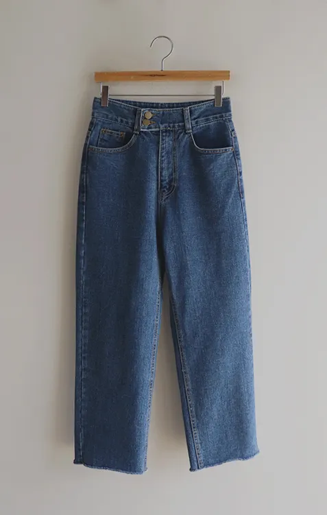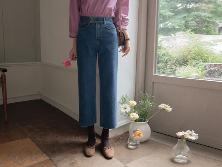 獨特魅力雙扣設計半寬下擺自然剪裁牛仔褲