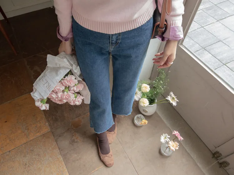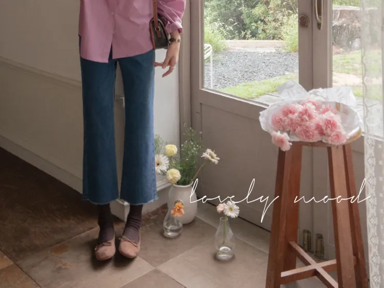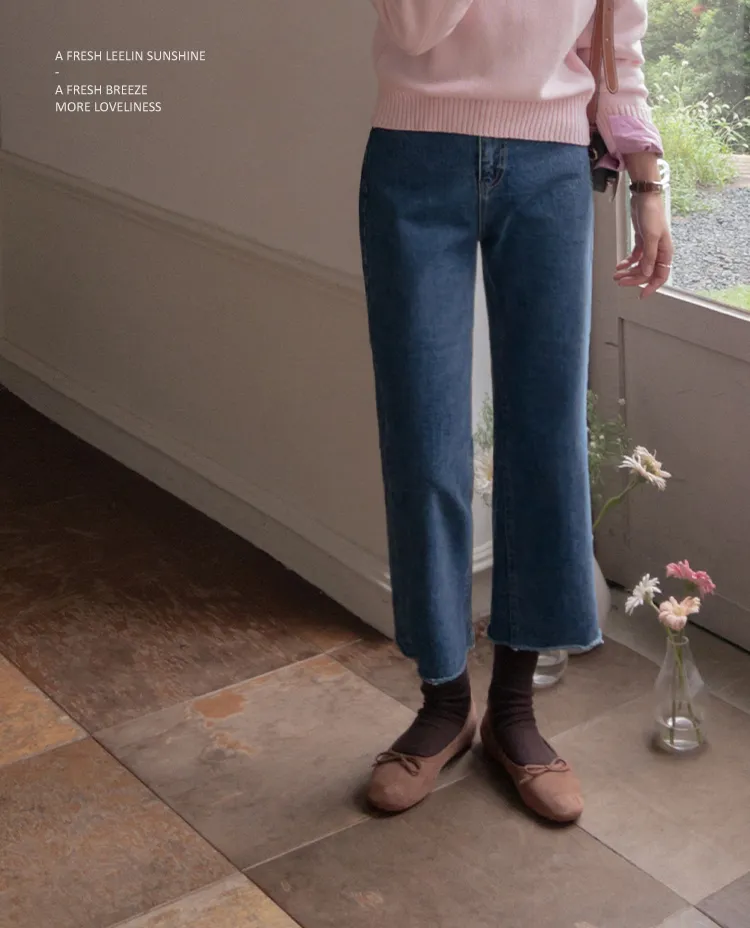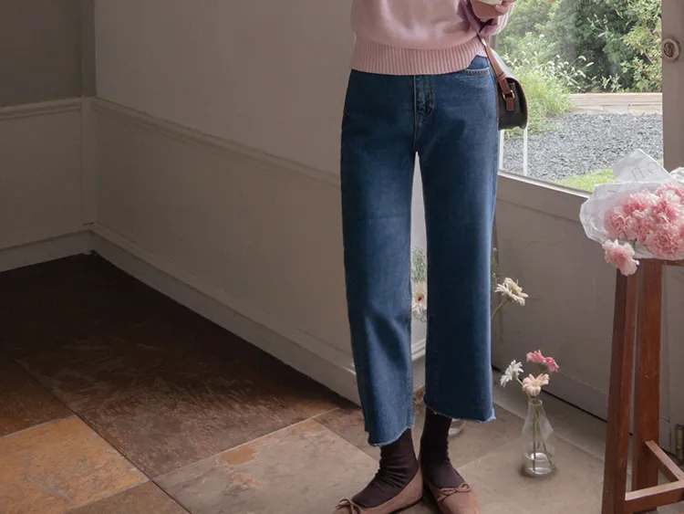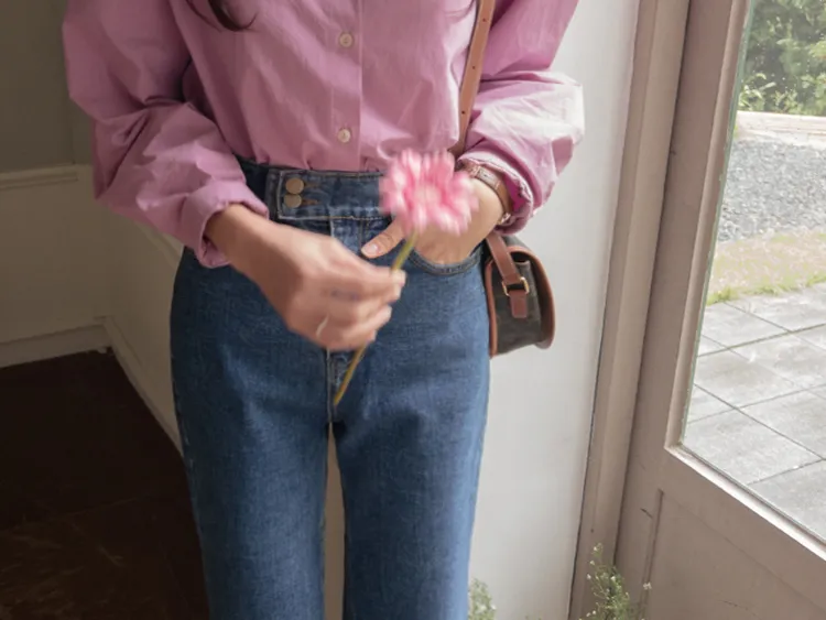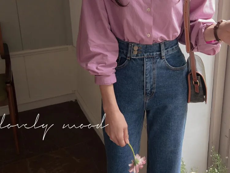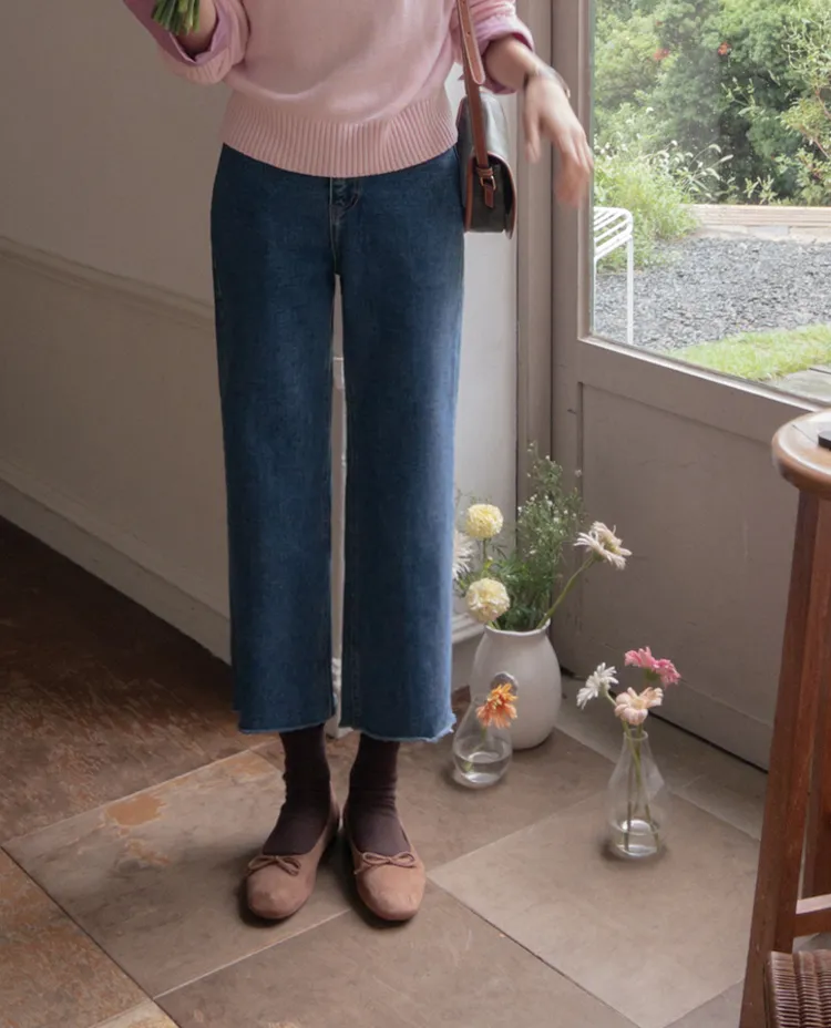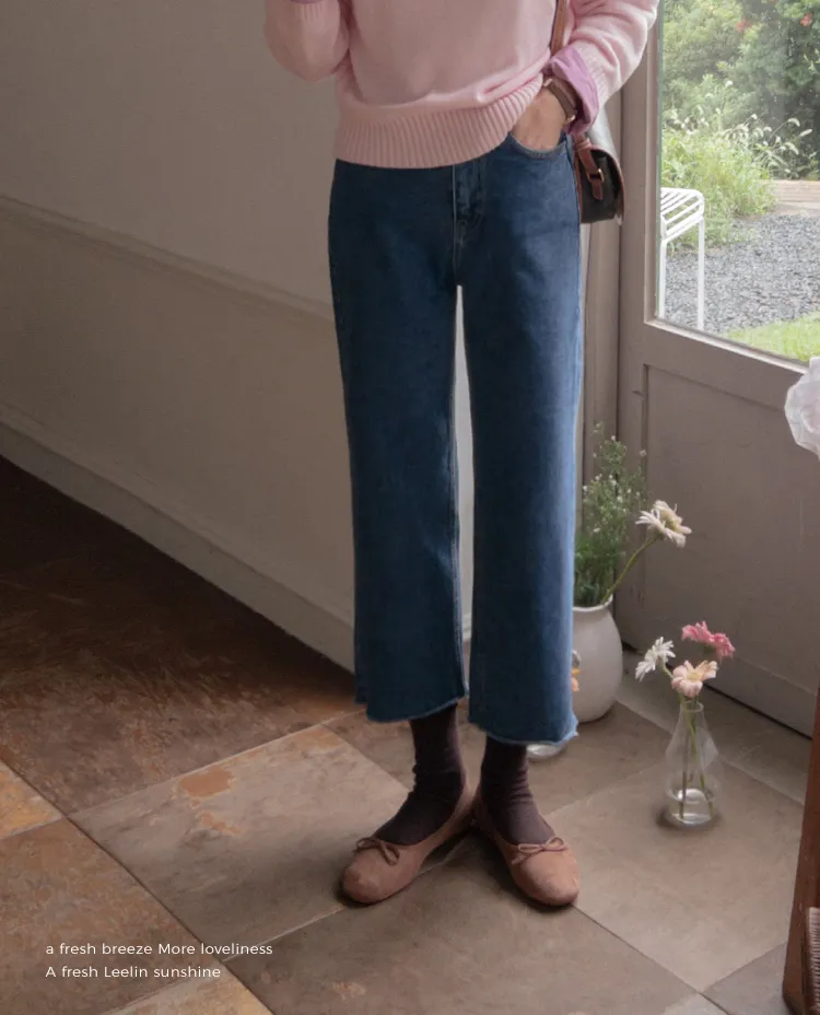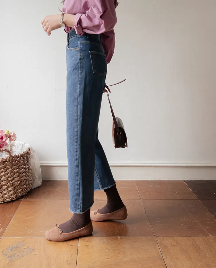 獨特魅力雙扣設計半寬下擺自然剪裁牛仔褲