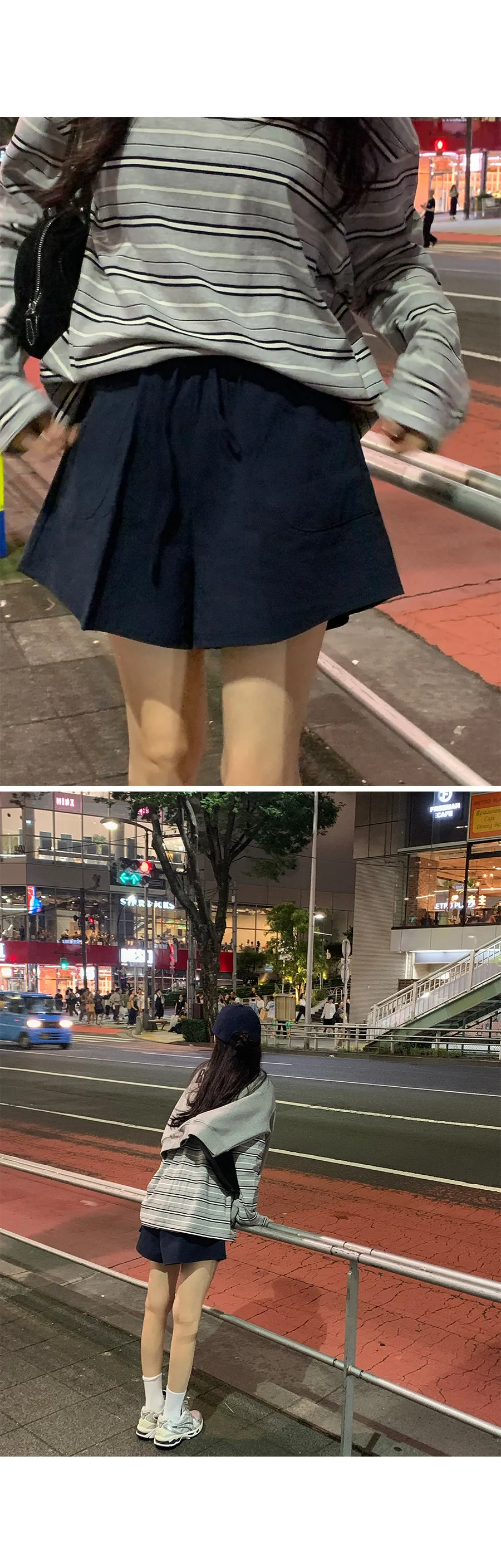 可愛口袋縫線腰部彈性綁帶棉質短褲