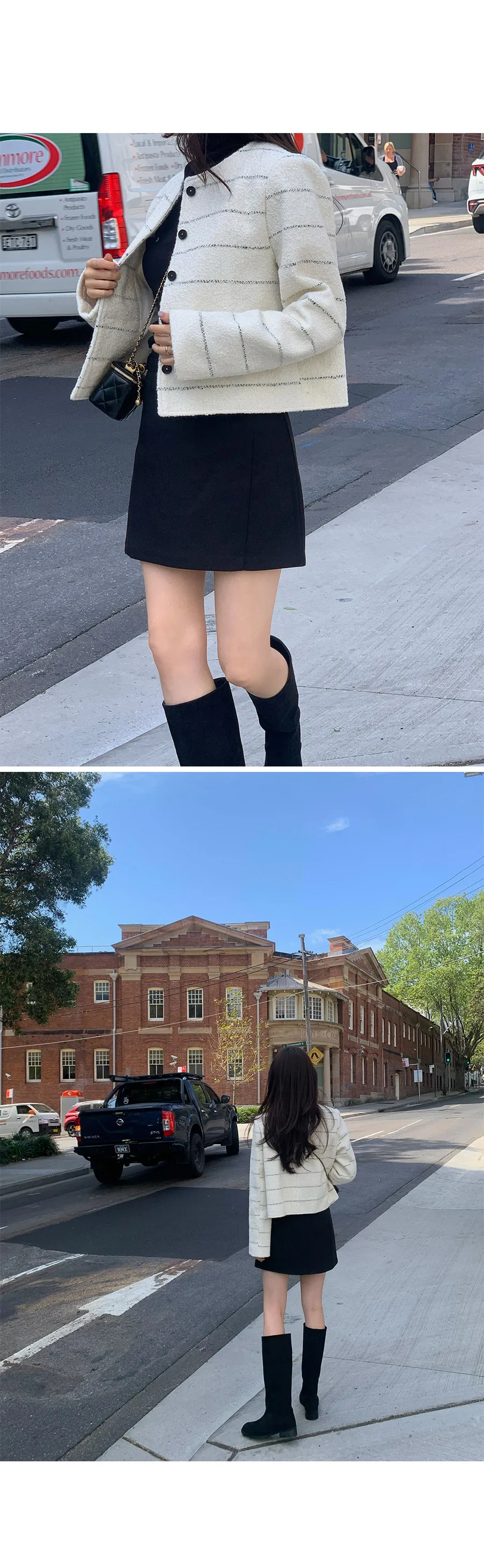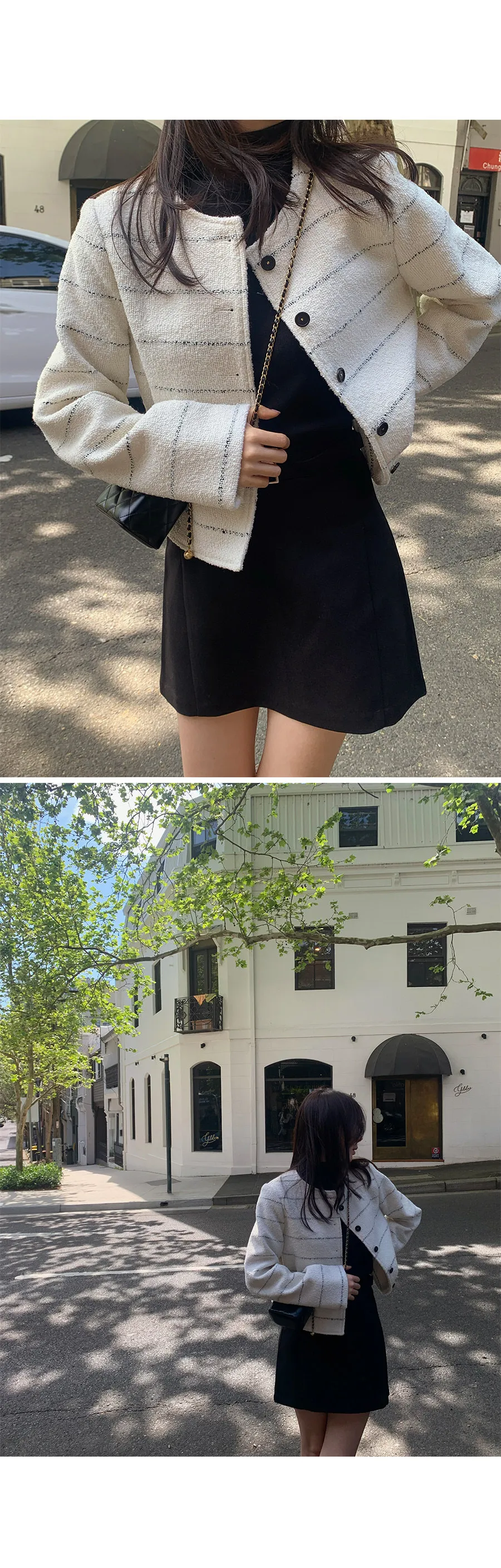 法式風情鑲金圓點扣條紋花呢外套