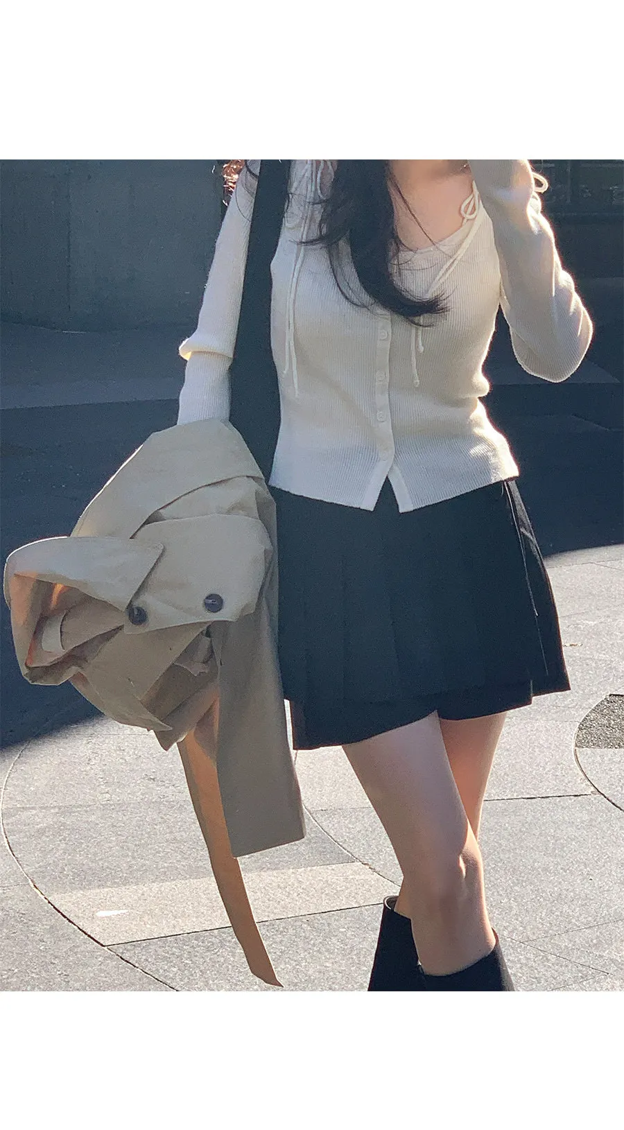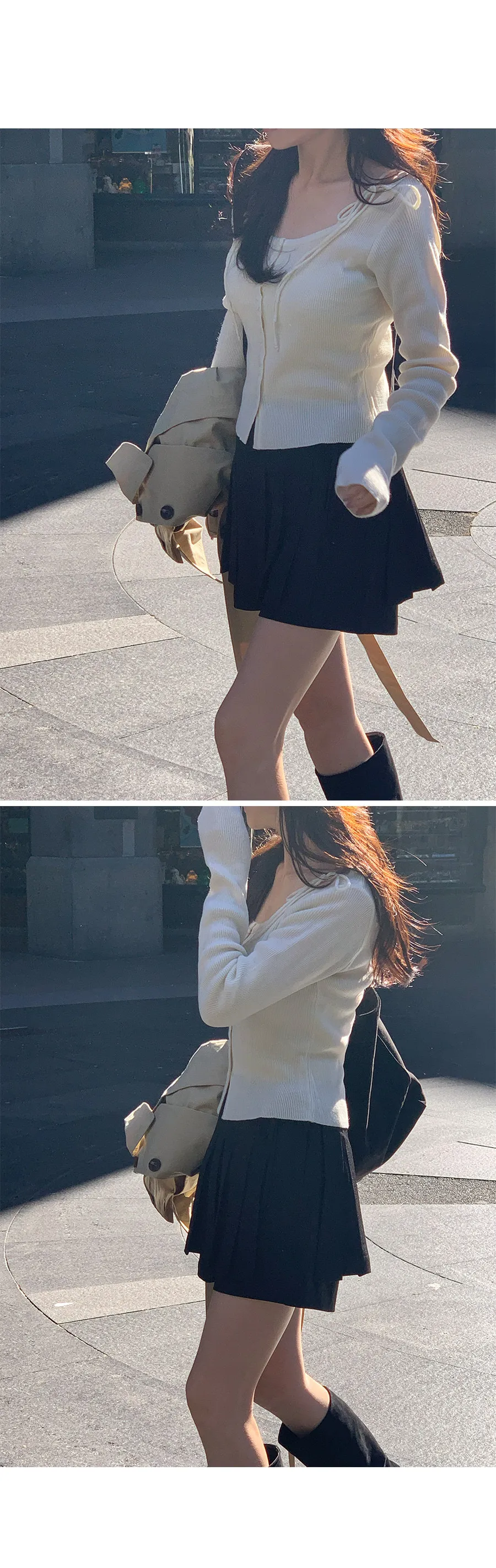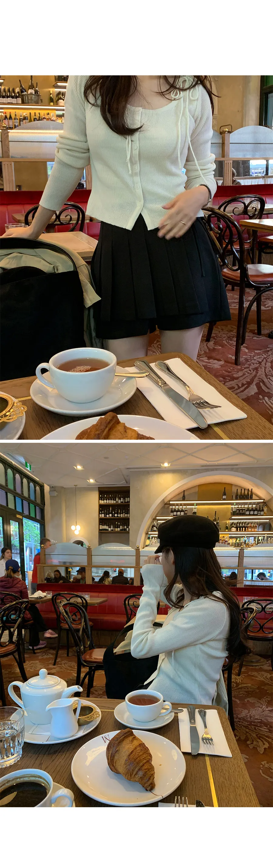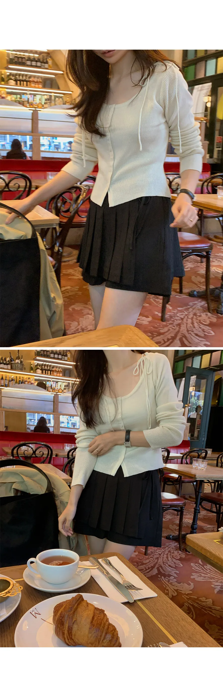 露出鎖骨線條的U領打造出修長的廓形,帶有絲帶點的細肩帶打造出俐落的針織開衫!