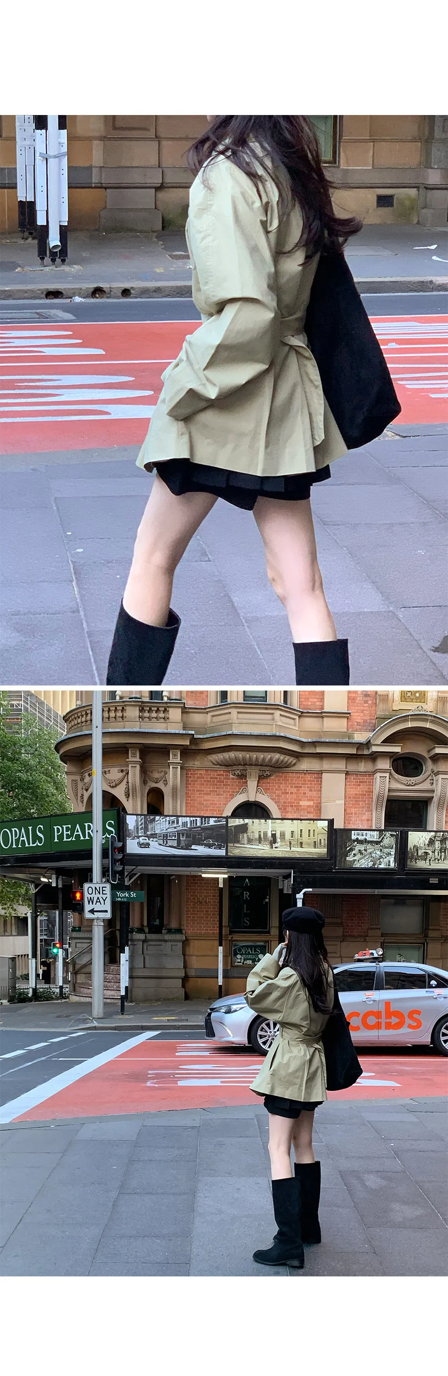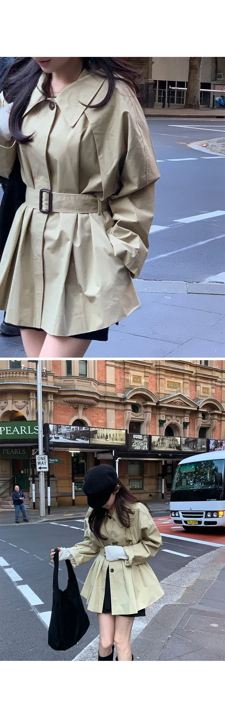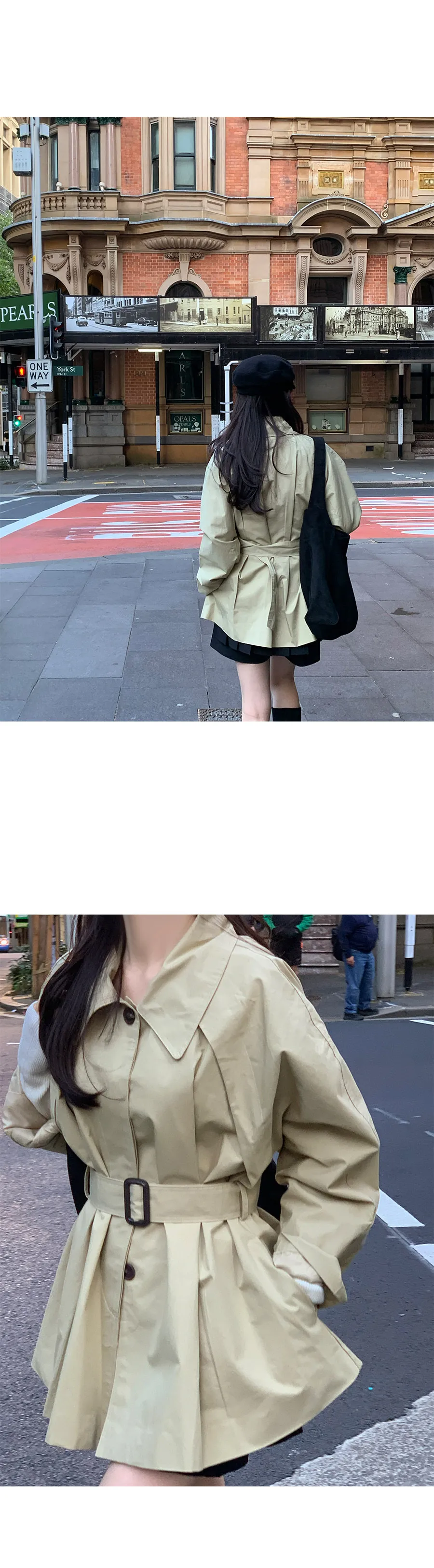 漂亮腰線針褶領子修飾腰帶風衣外套