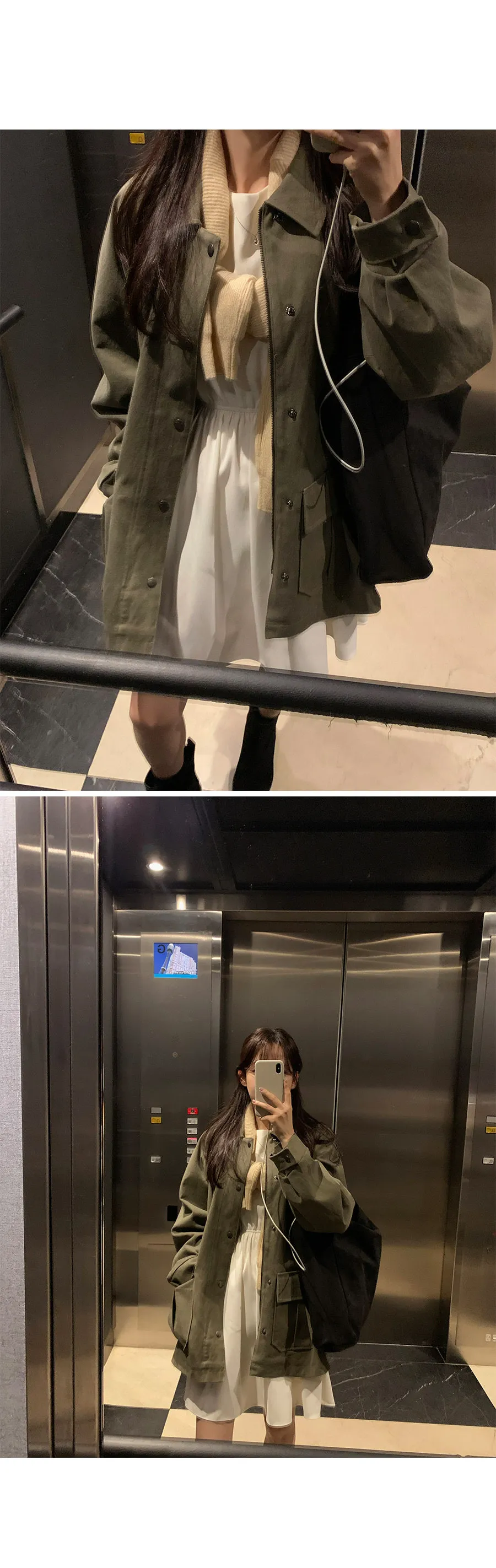 復古情調點綴雙口袋遮臀半長款夾克外套
